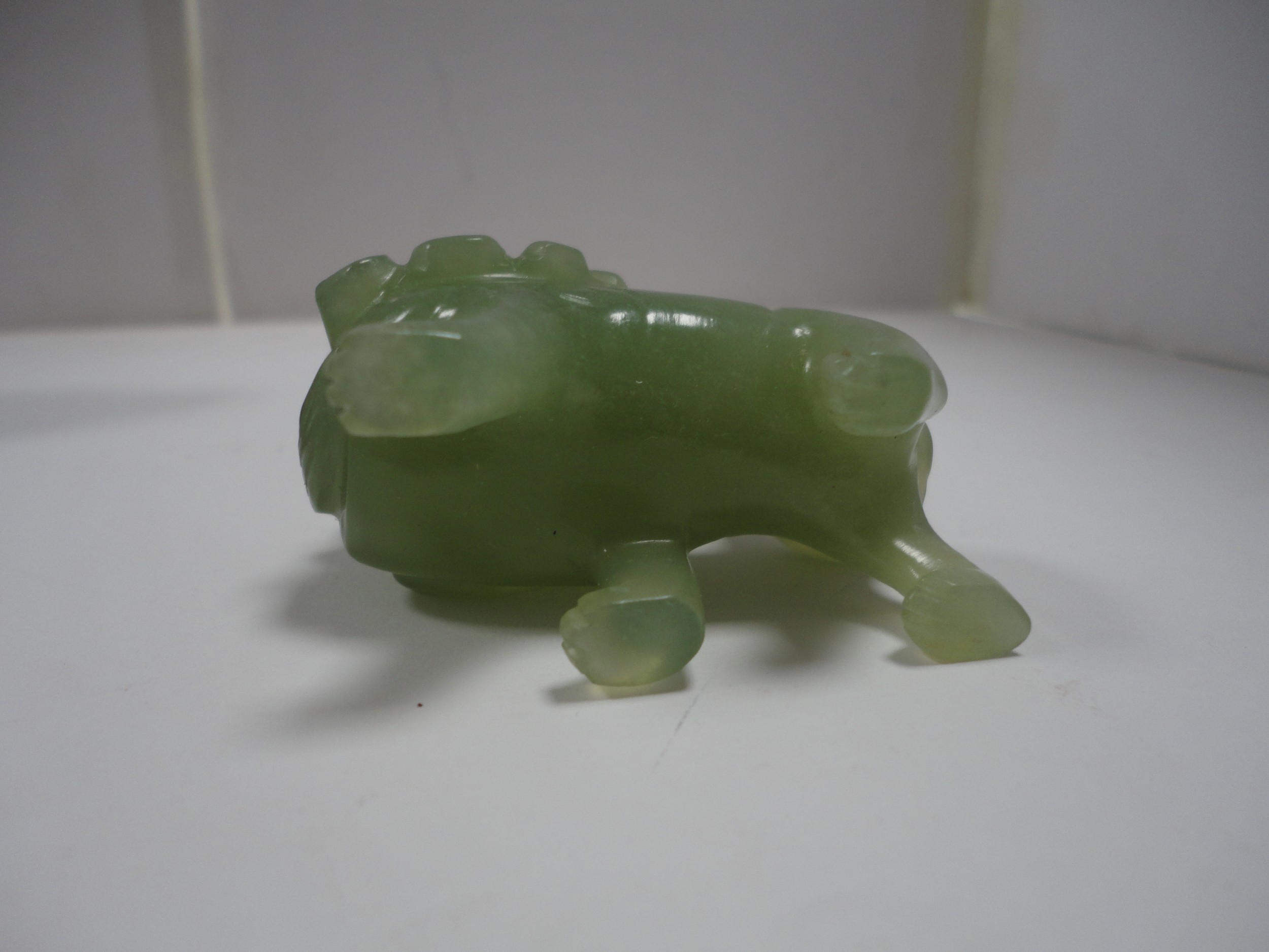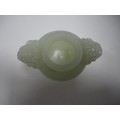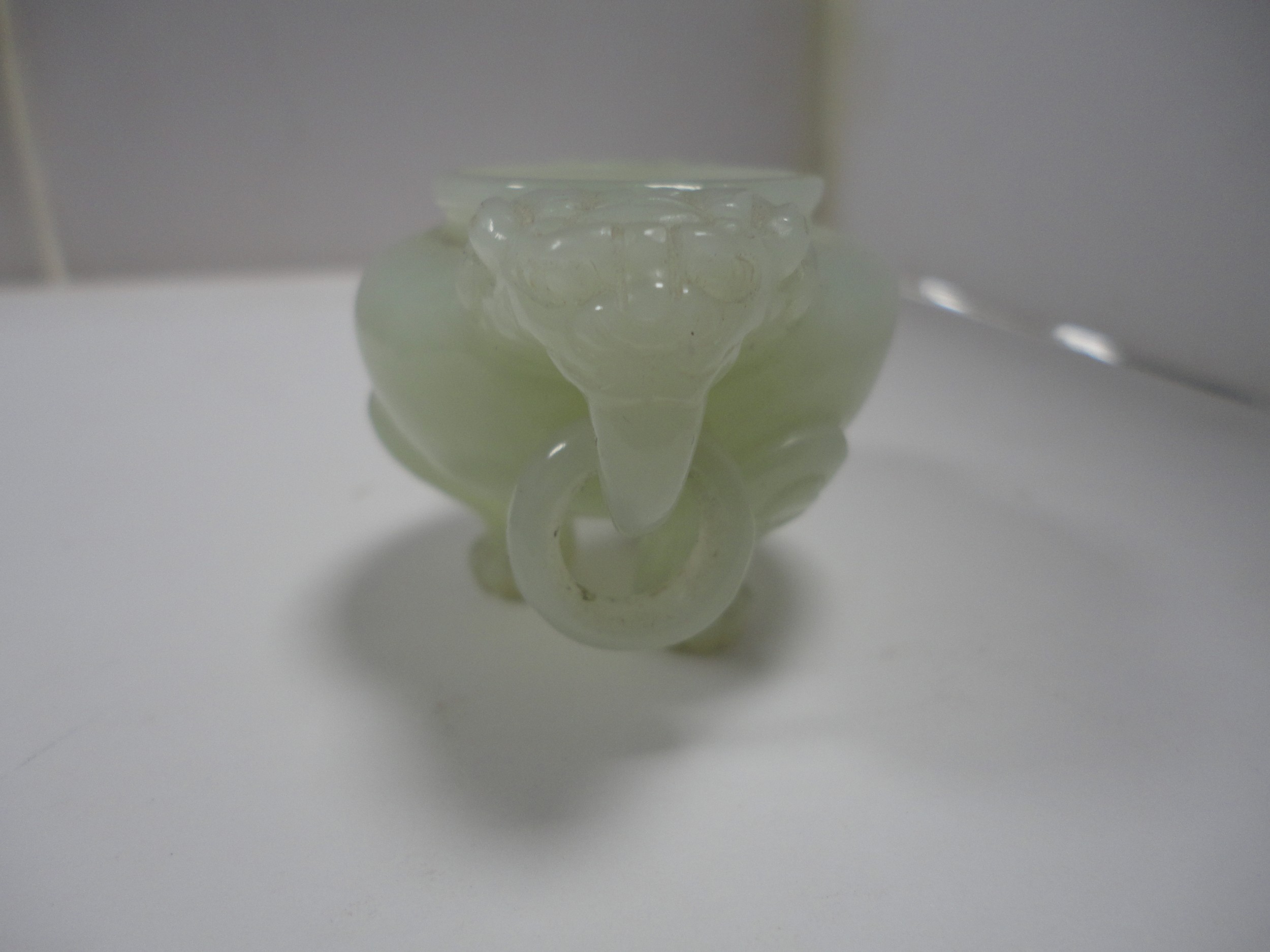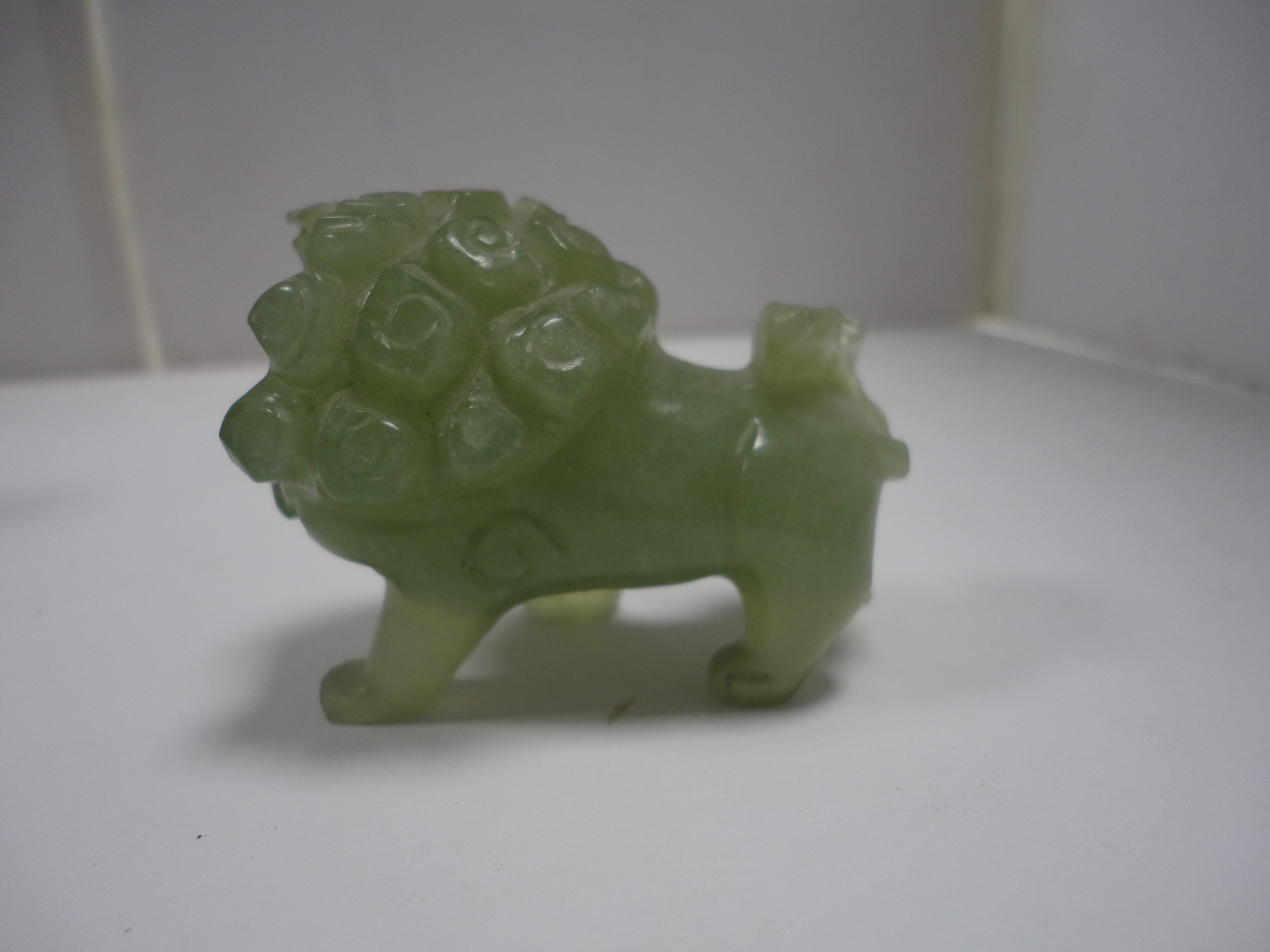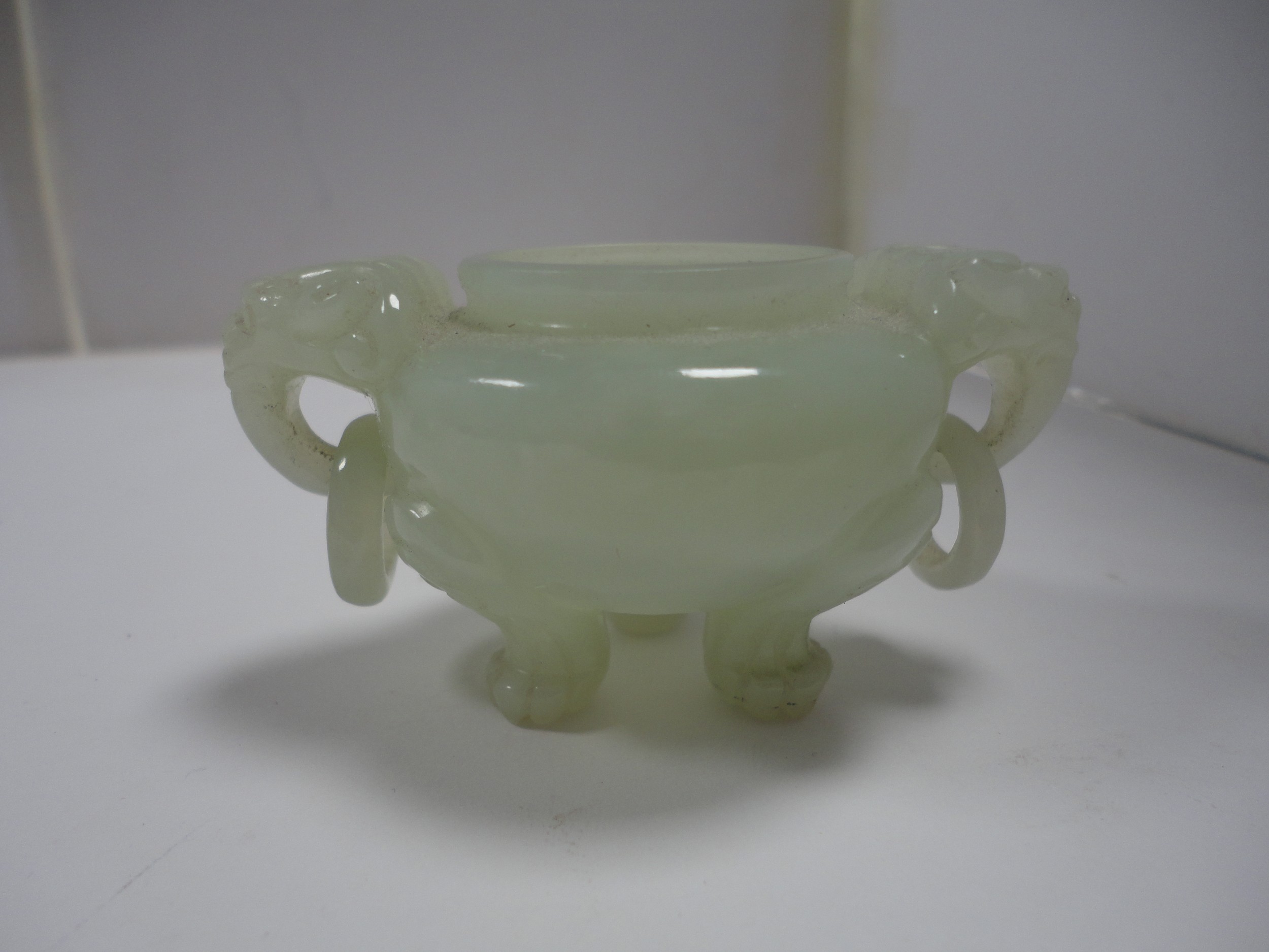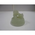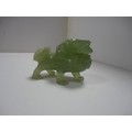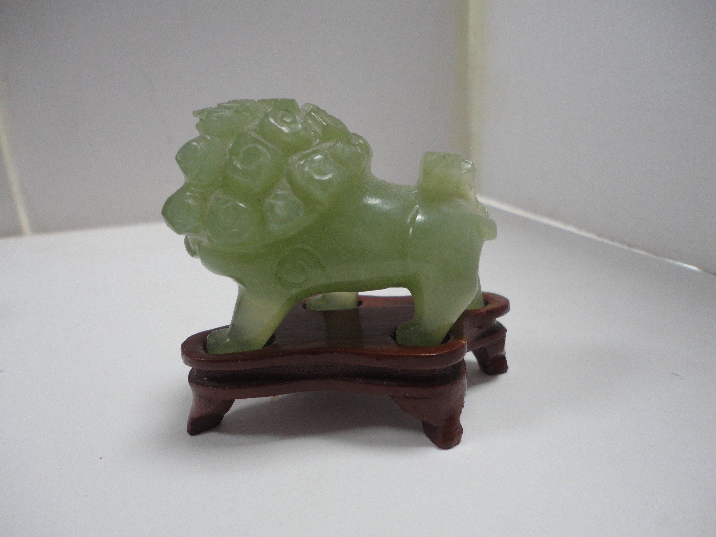 Small Chinese-style jade-coloured censer and cover on stand, and a similar jade-coloured temple dog. (2)