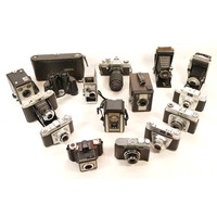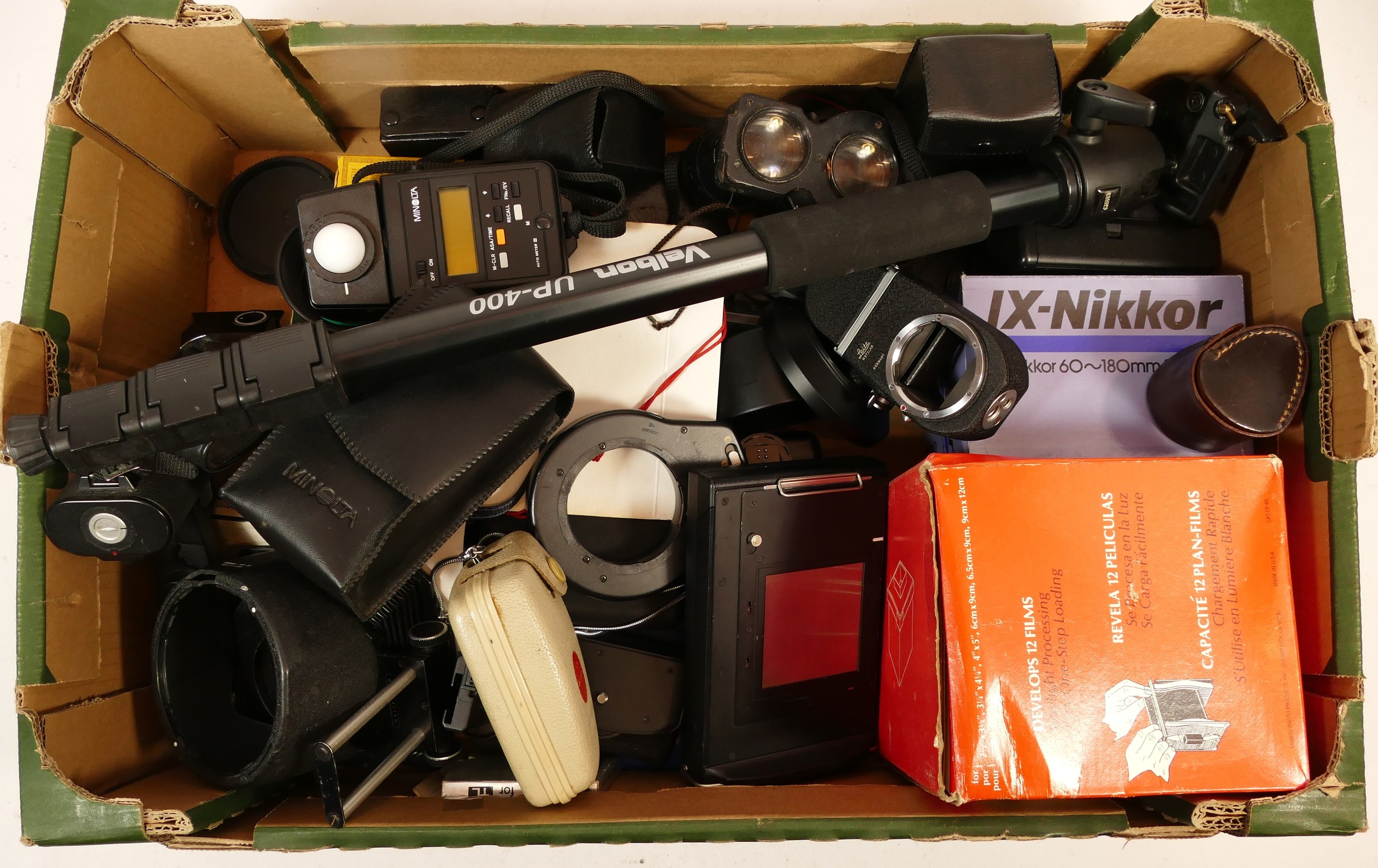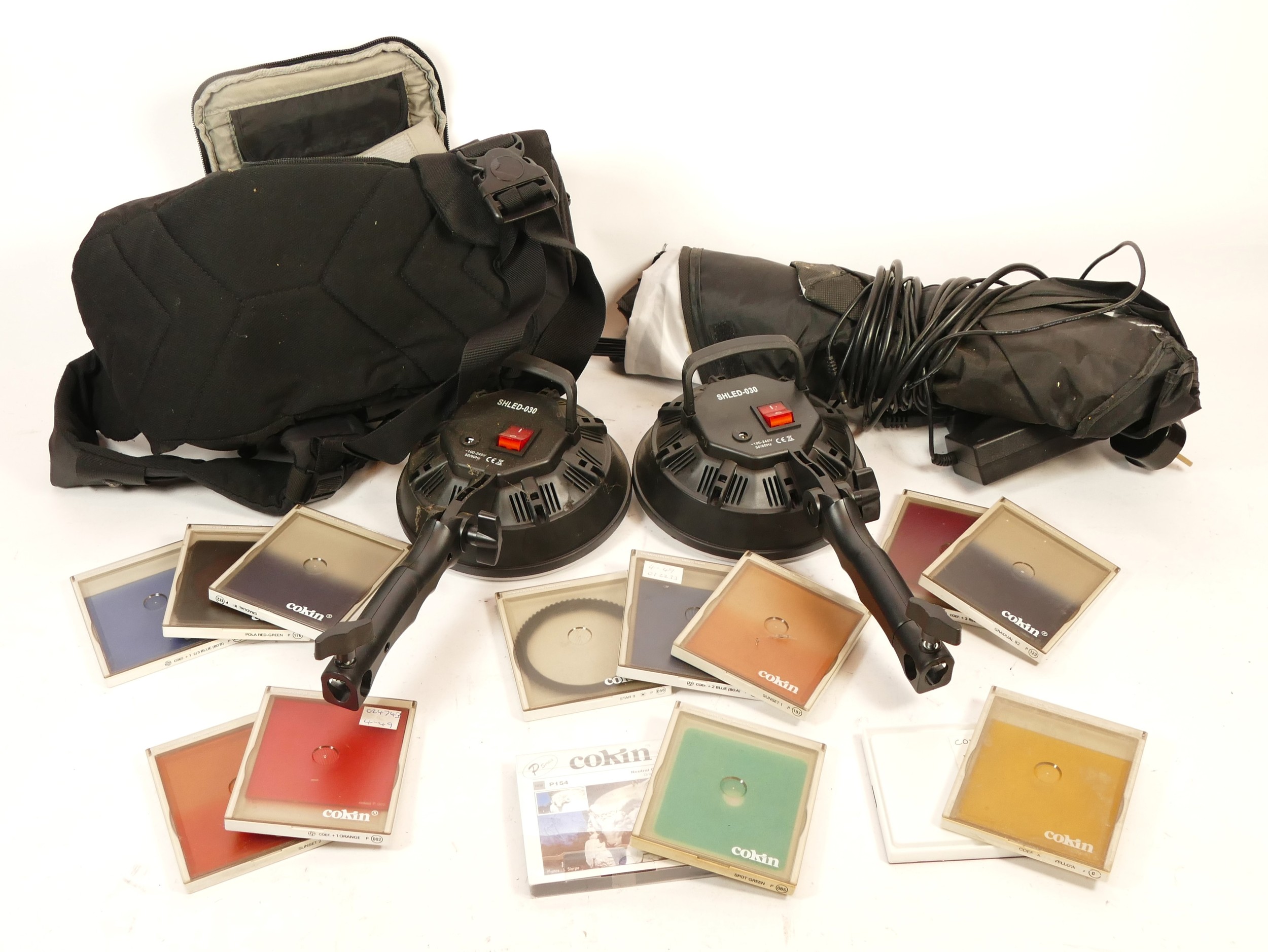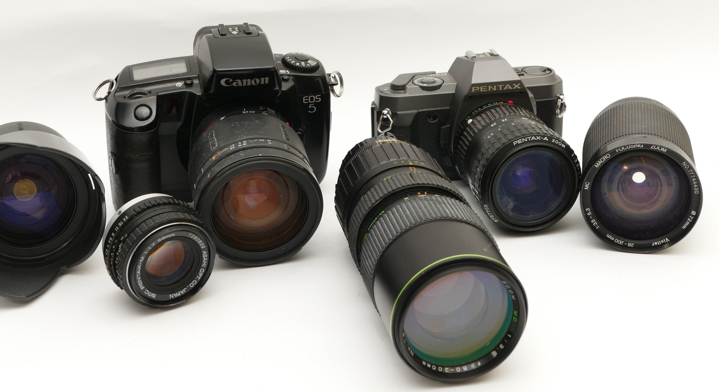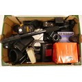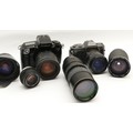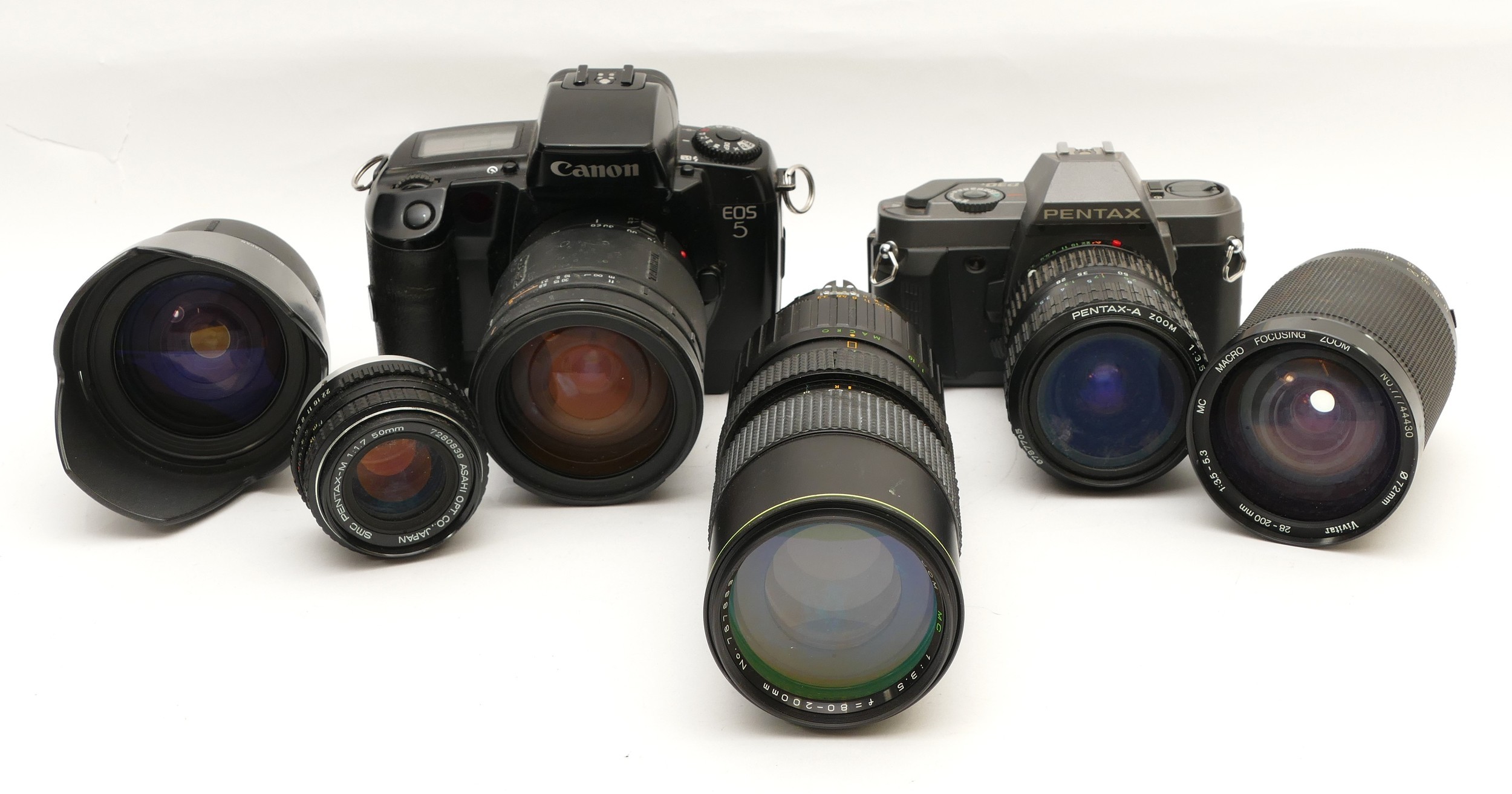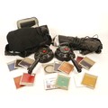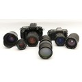 A collection of camera accessories together with two cameras and two lenses, housed in two fabric satchel style camera bags, to include, a Canon EOS 5, a Pentax P30, a Tamron f/3.8-5.6 28-200mm lens, and a Hanimex f/3.5 80-200mm. (3)