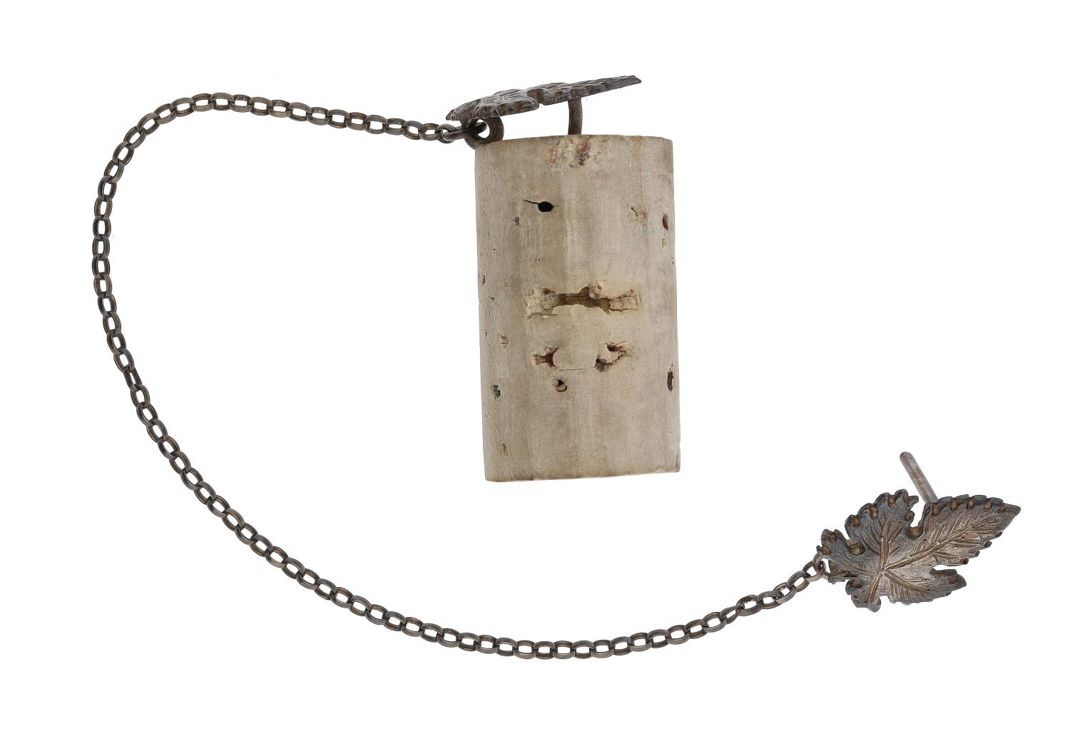 Silver novelty vine leaf cork holder, two cast leaves linked by a chain, maker J A Campbell, London 1996, 7gm