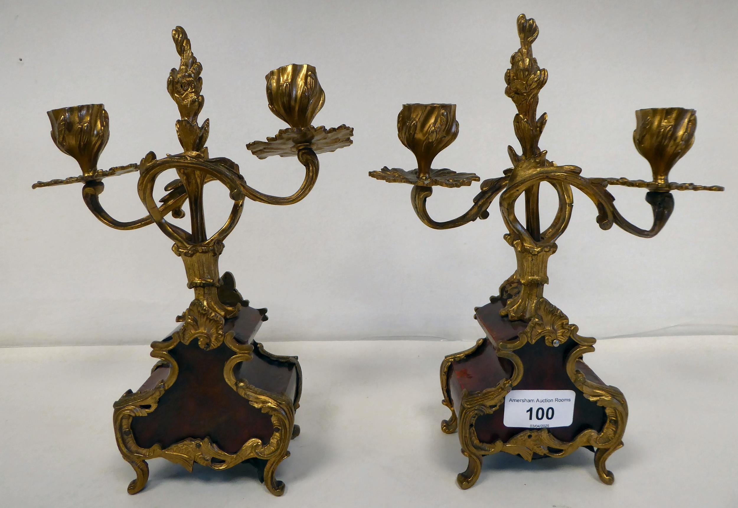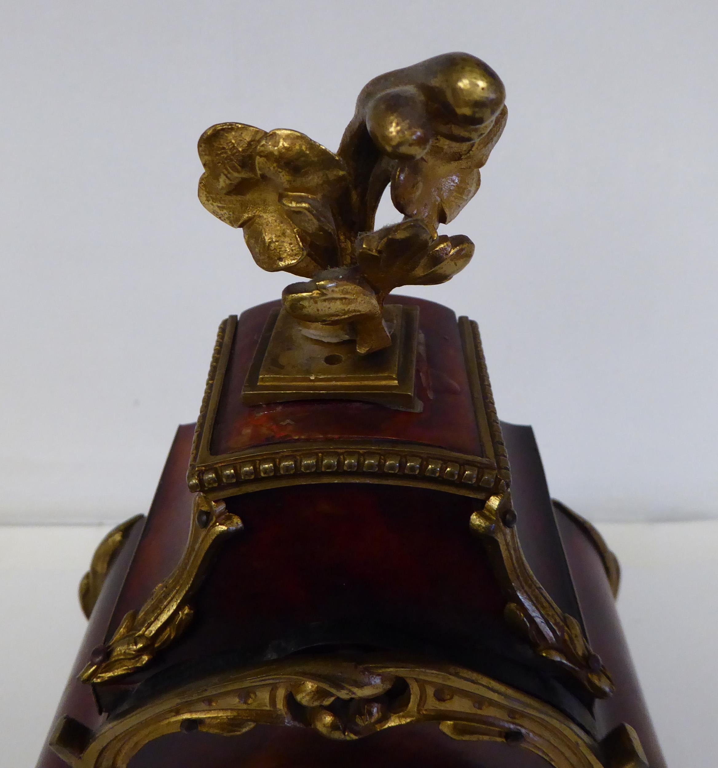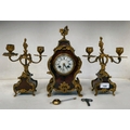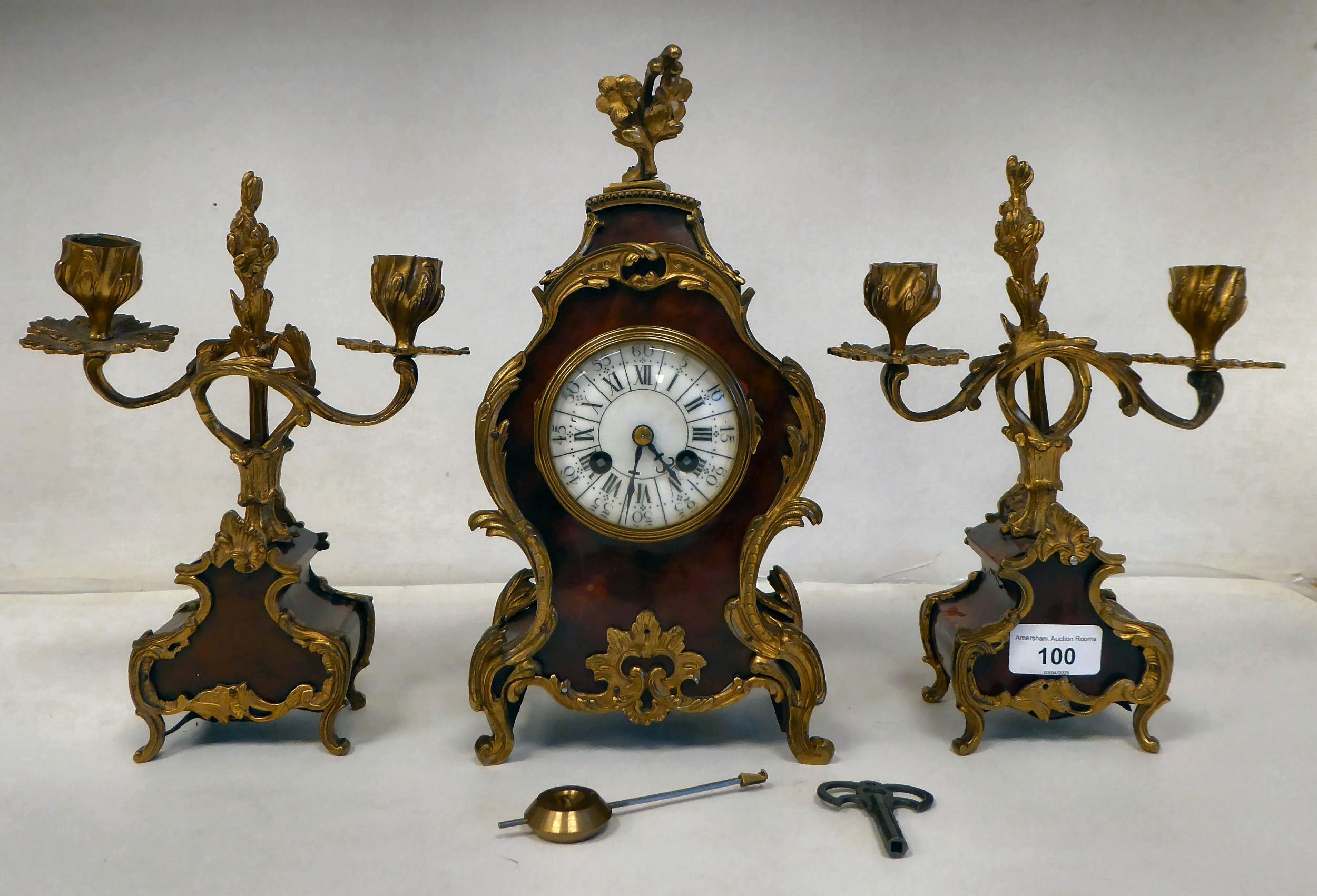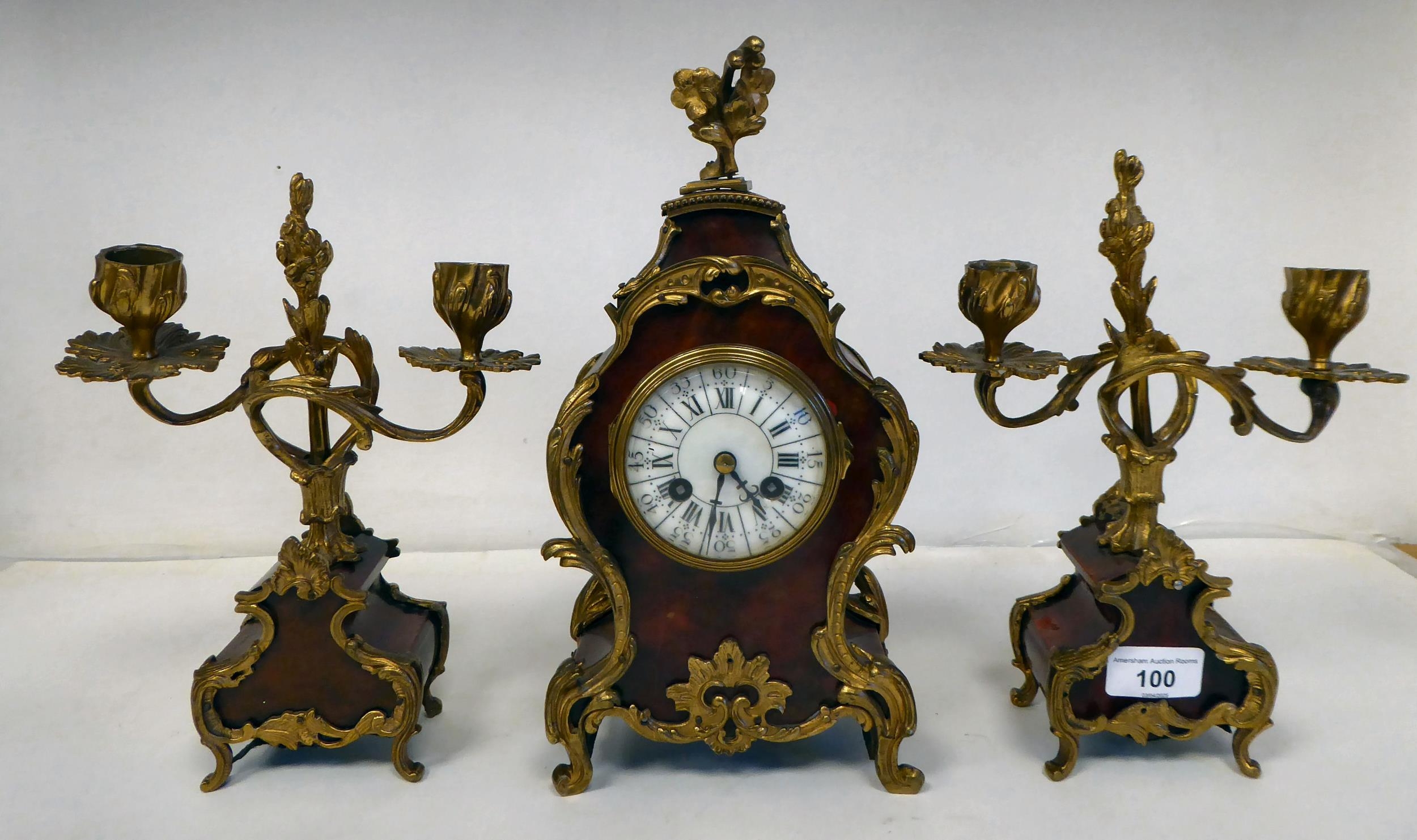 A late 19thC French gilt metal mounted and laminated, three piece clock garniture with ornately cast mounts, the clock surmounted by a finial; faced by a bell strike movement and a Roman dial 12"h; and a pair of twin branch candle style sidepieces 10"h