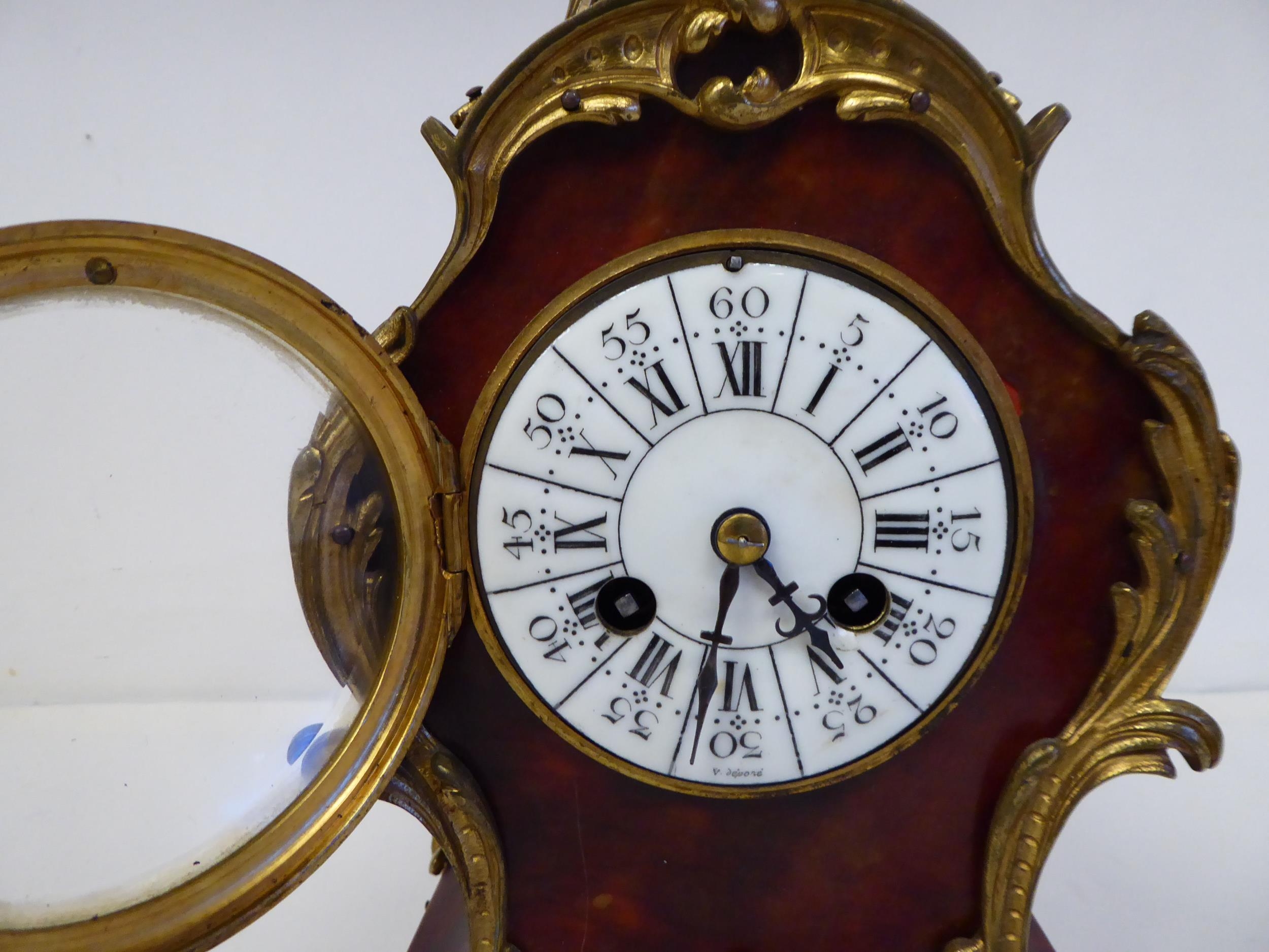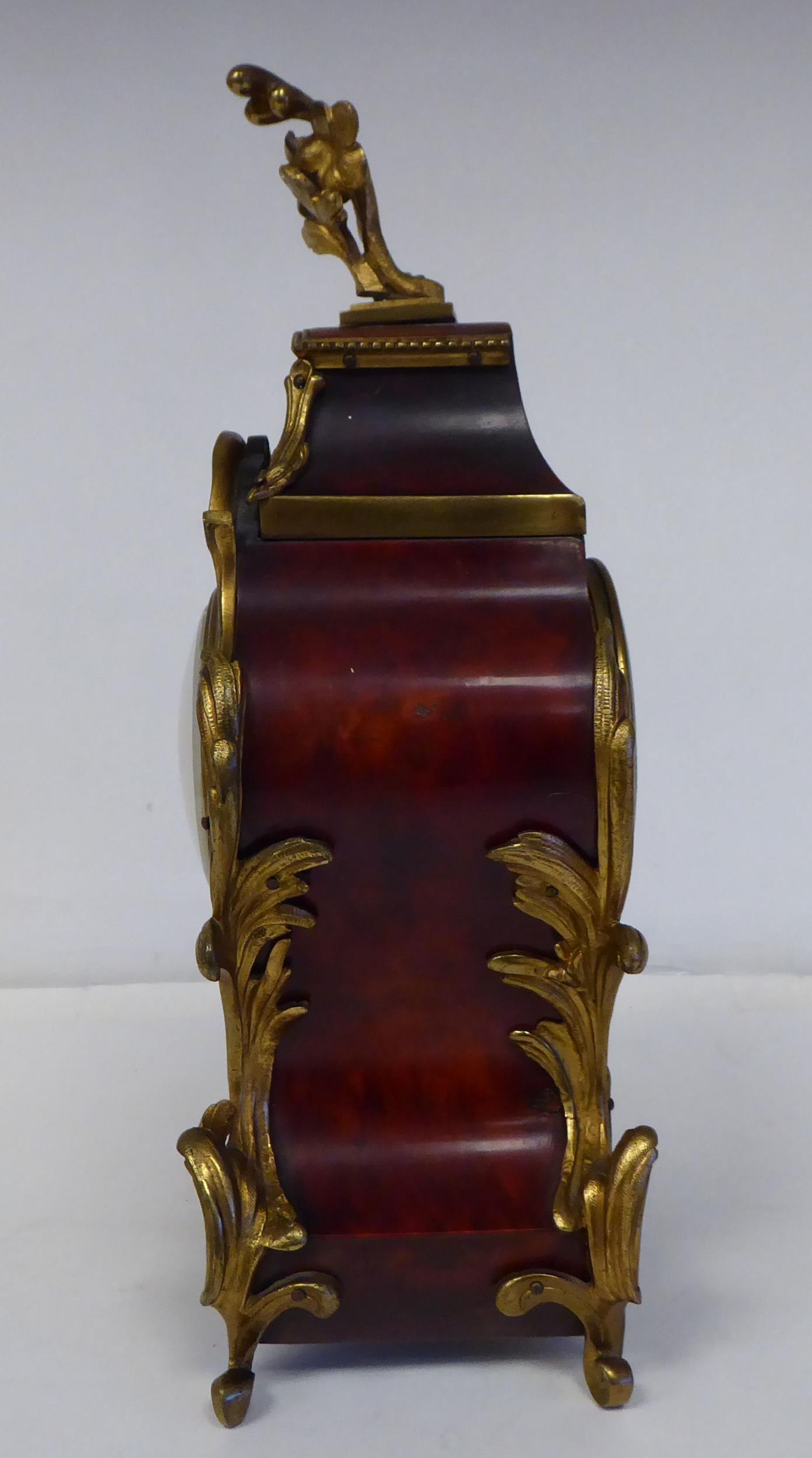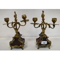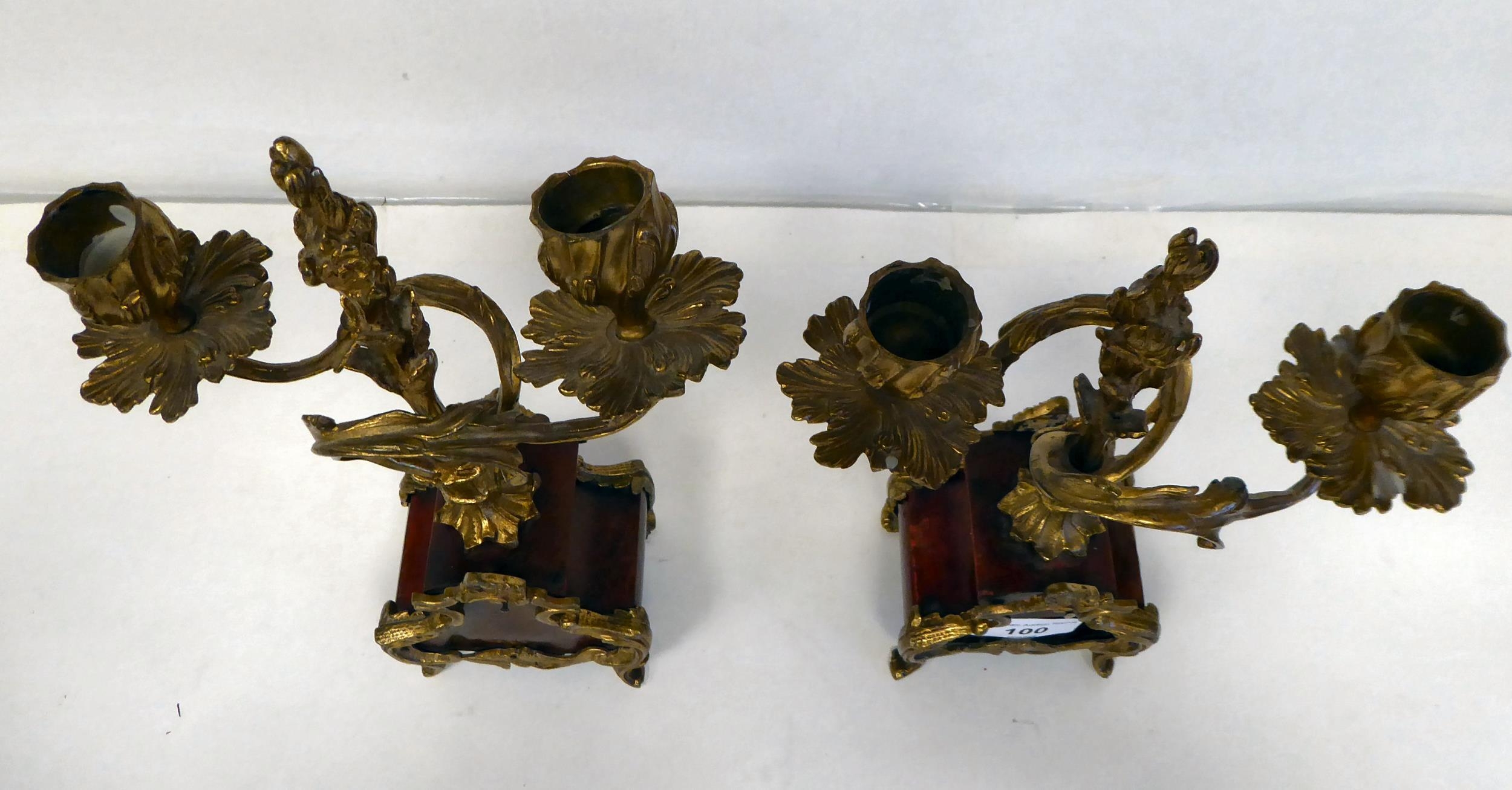 A late 19thC French gilt metal mounted and laminated, three piece clock garniture with ornately cast mounts, the clock surmounted by a finial; faced by a bell strike movement and a Roman dial 12"h; and a pair of twin branch candle style sidepieces 10"h