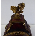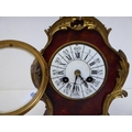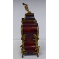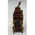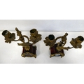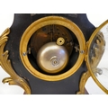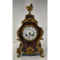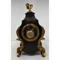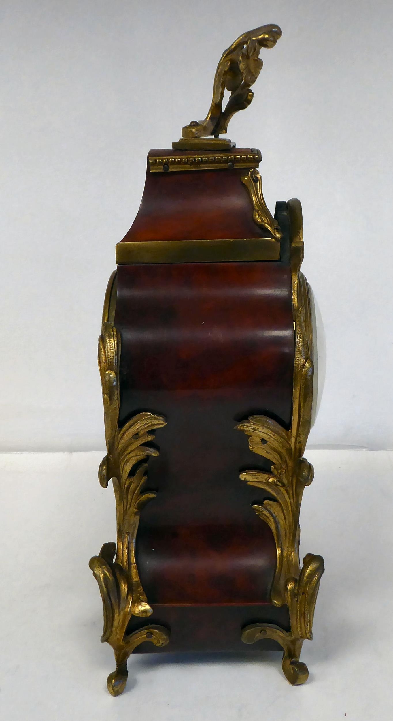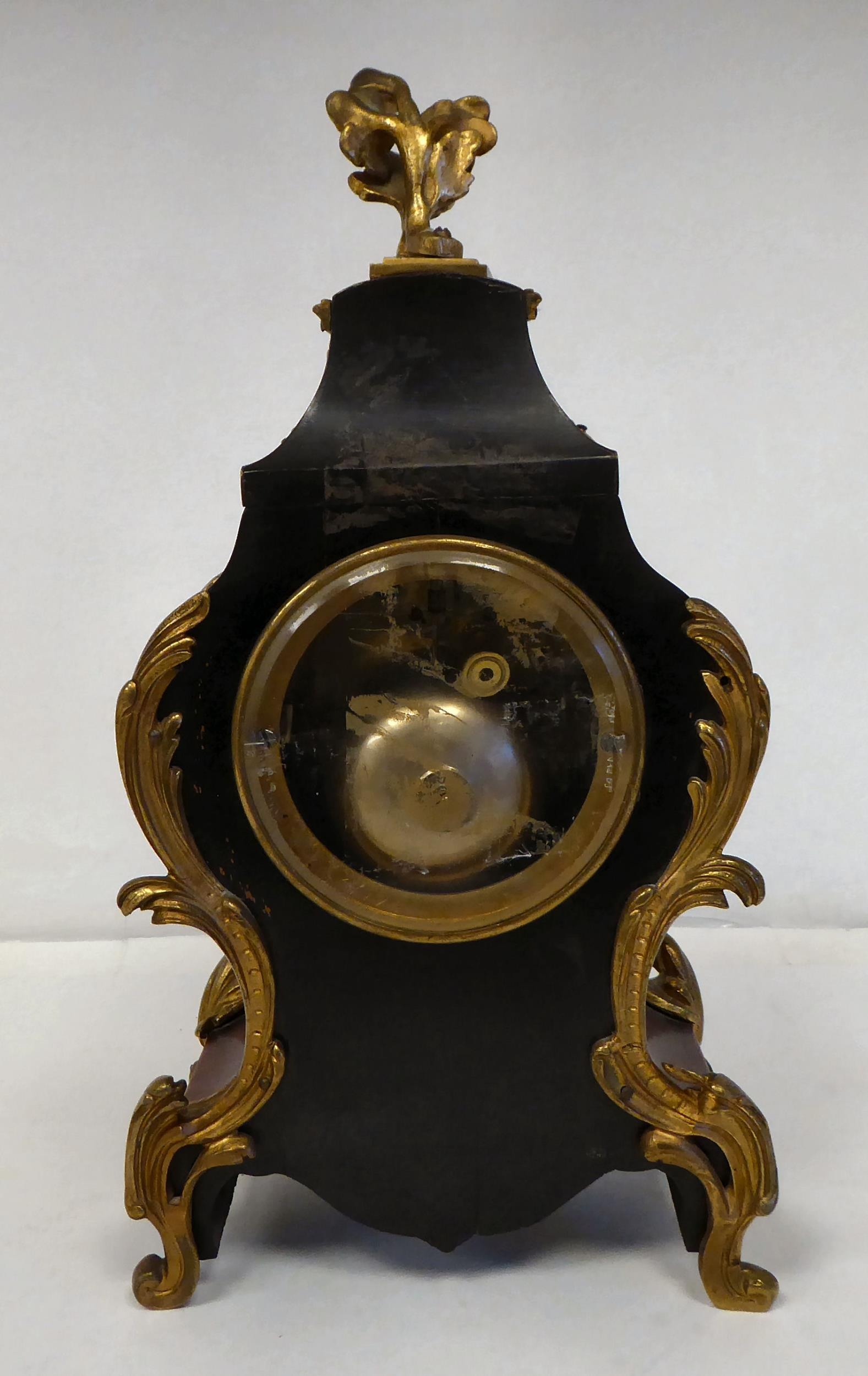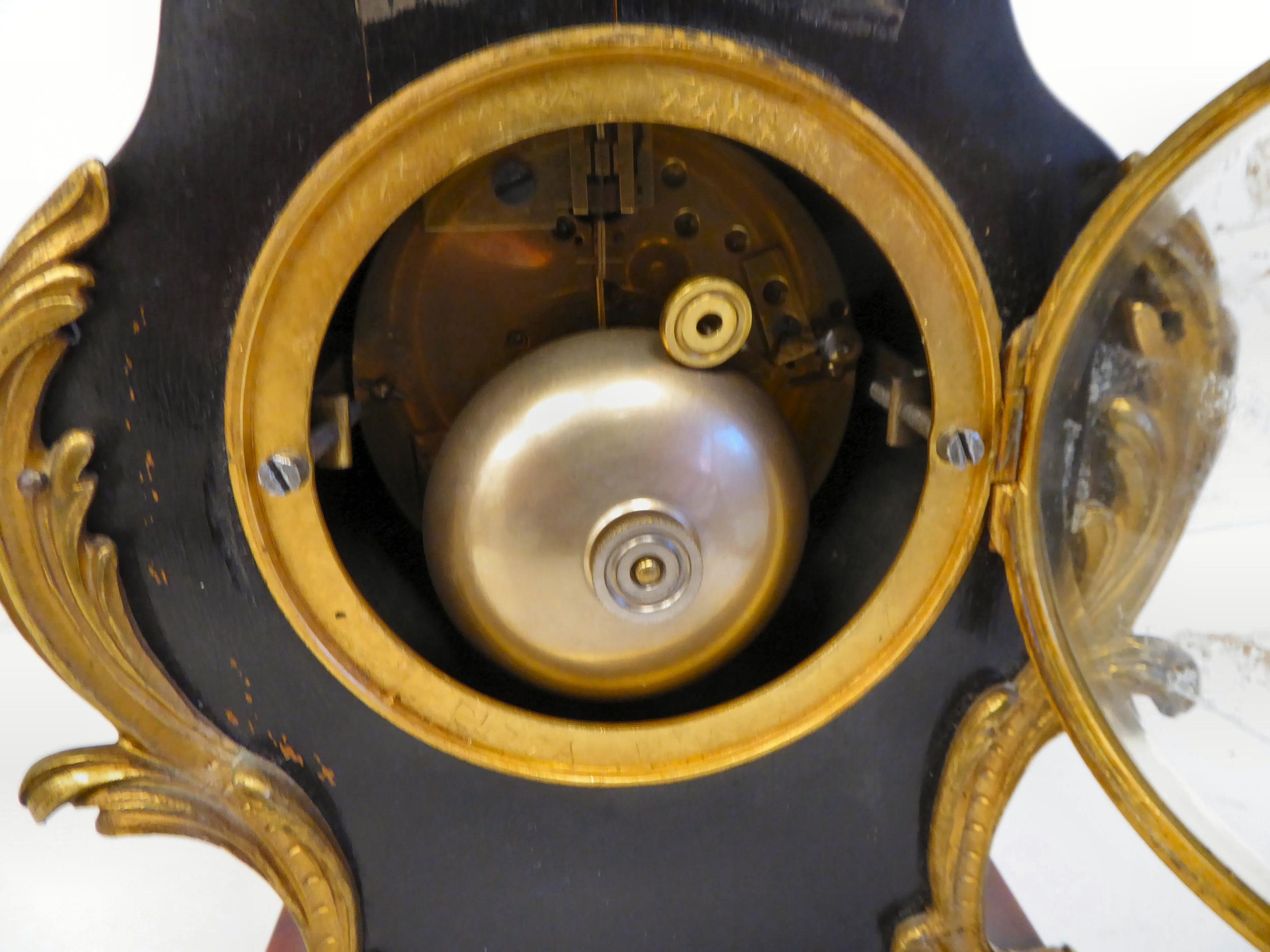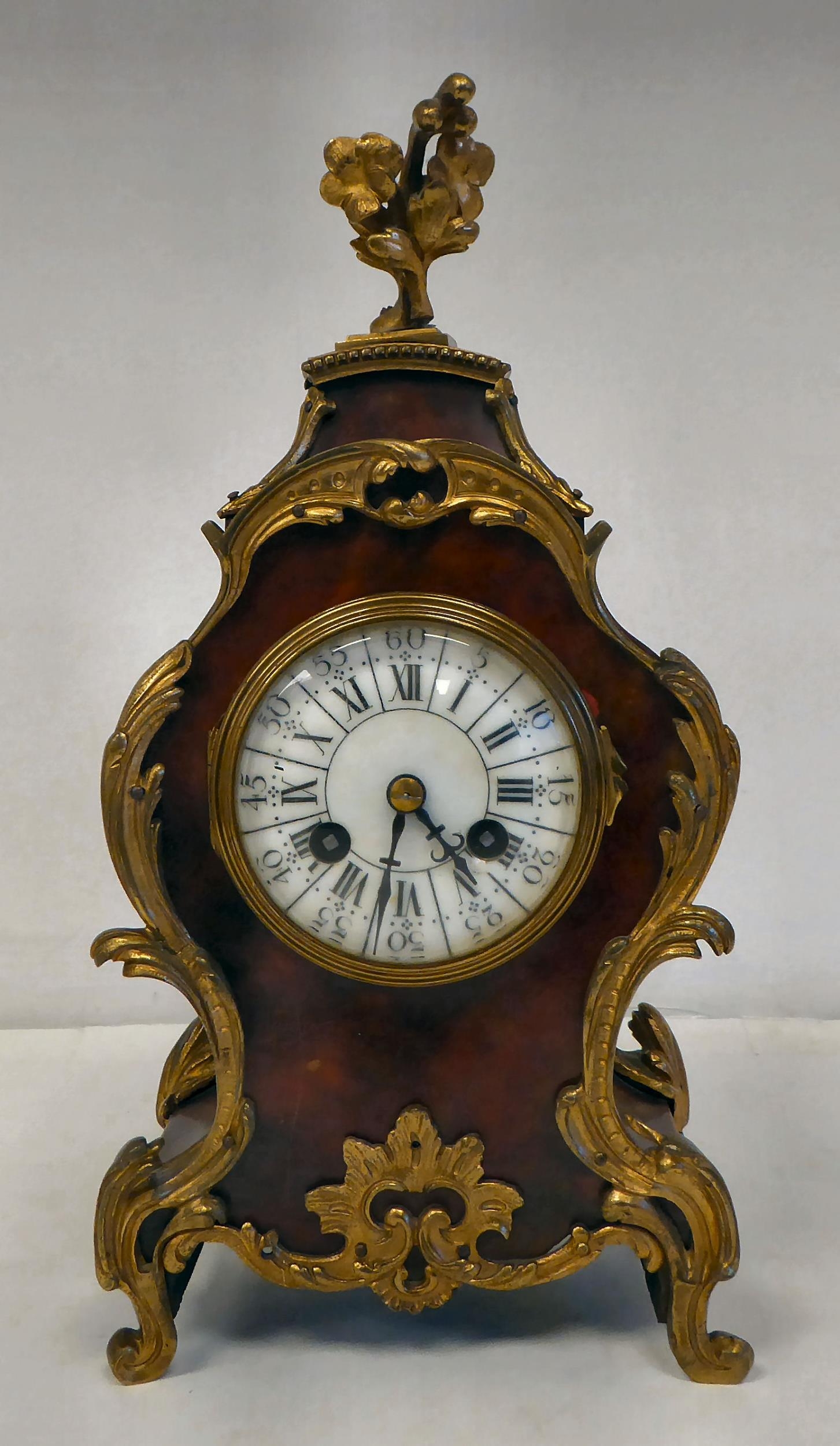 A late 19thC French gilt metal mounted and laminated, three piece clock garniture with ornately cast mounts, the clock surmounted by a finial; faced by a bell strike movement and a Roman dial 12"h; and a pair of twin branch candle style sidepieces 10"h