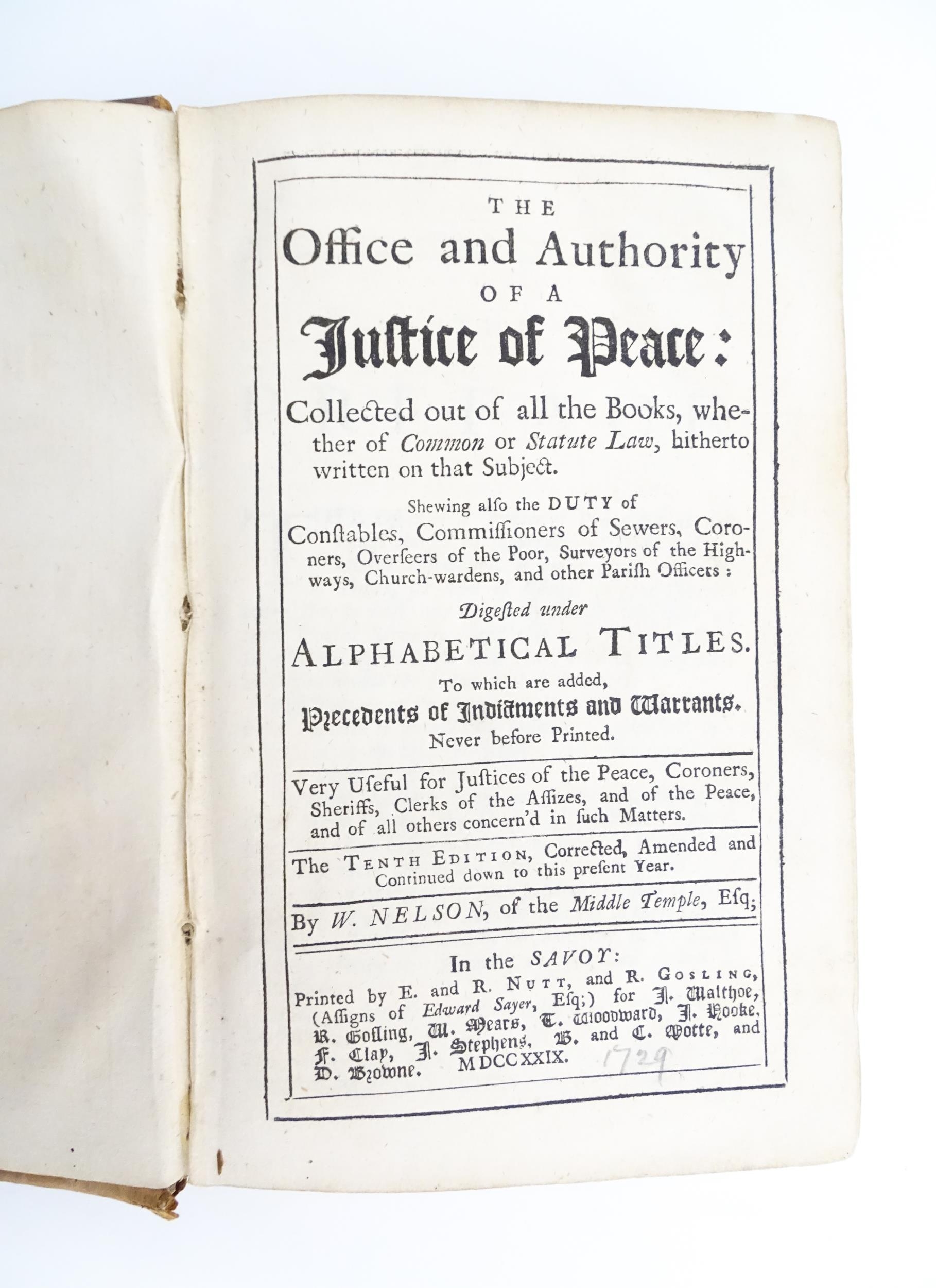 Book: The Office and Authority of a Justice of Peace: Collected Out of All the Books, Whether of Common or Statute Law, Hitherto Written on that Subject... by William Nelson. Published 1729