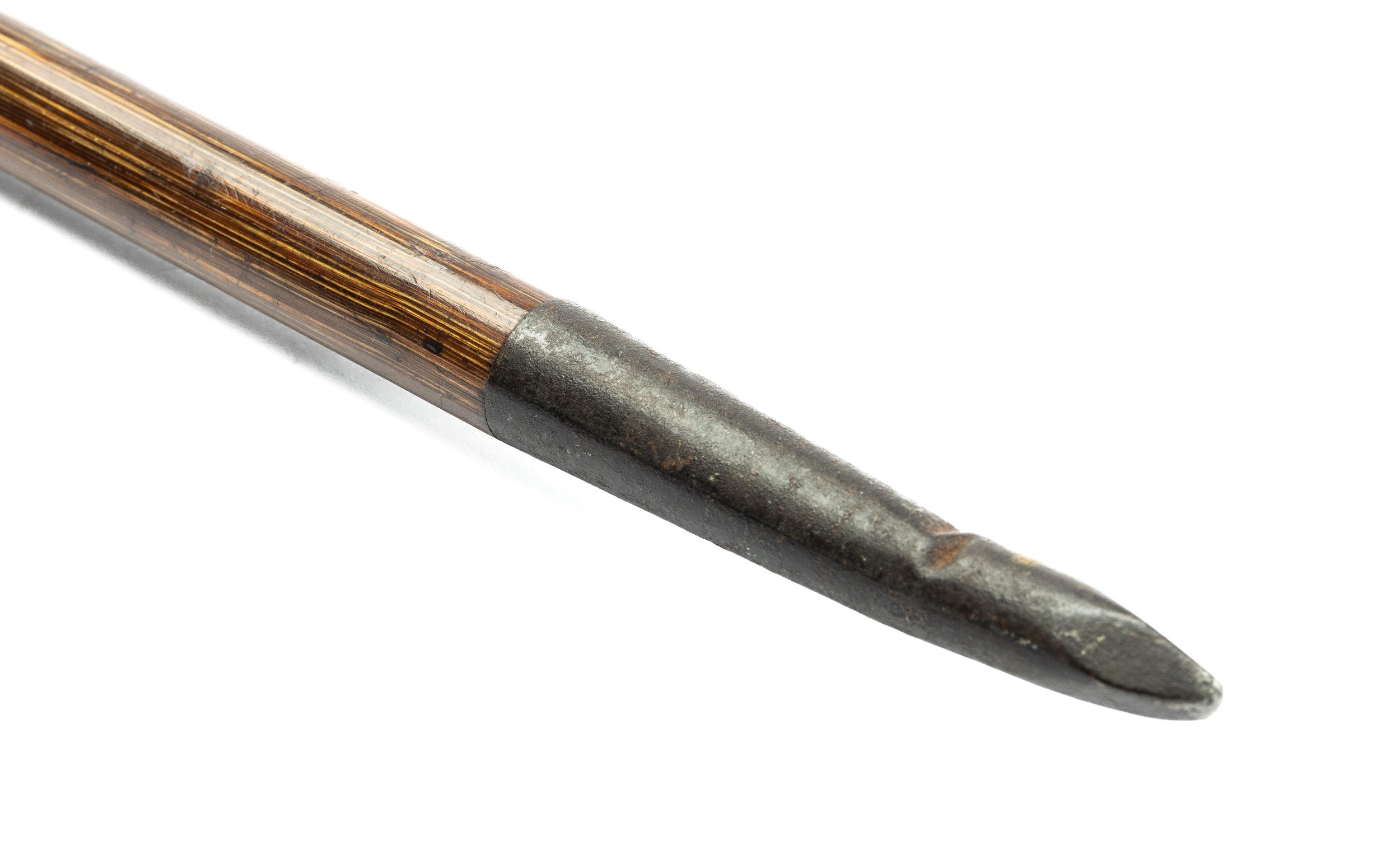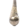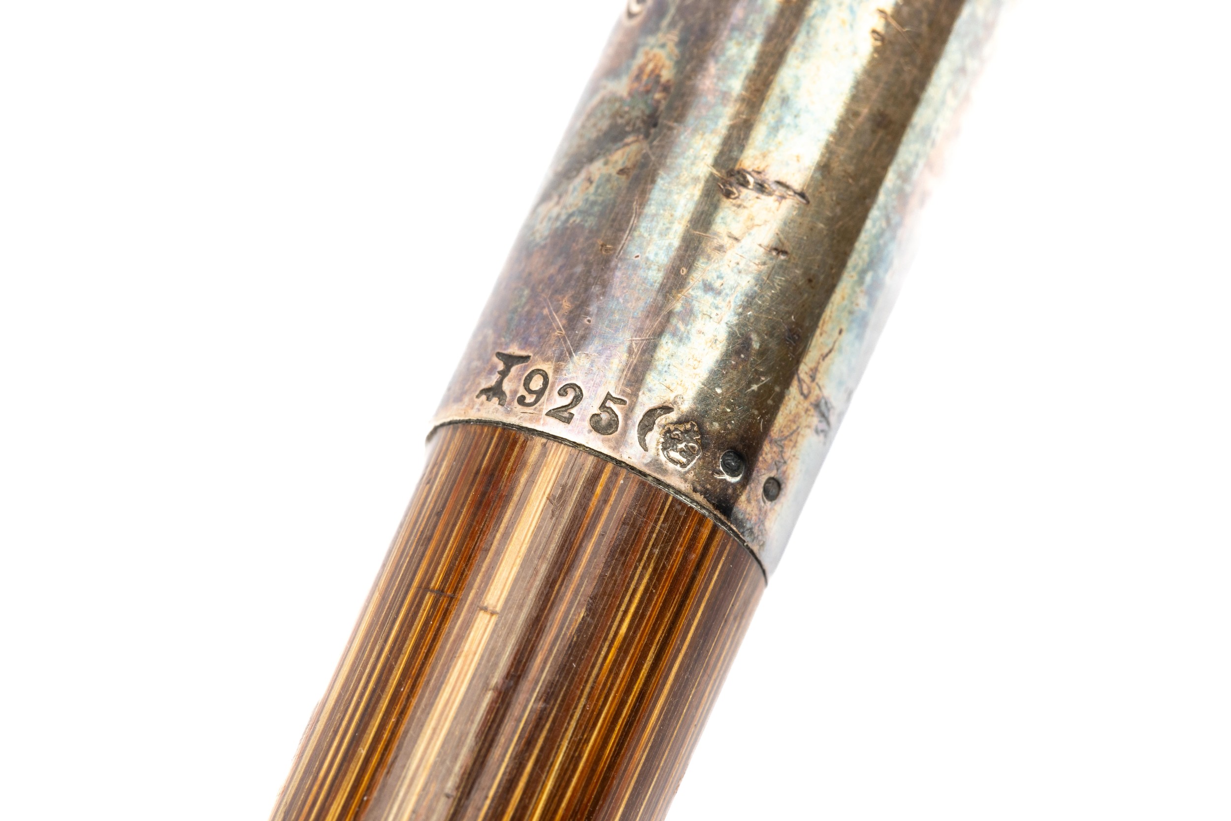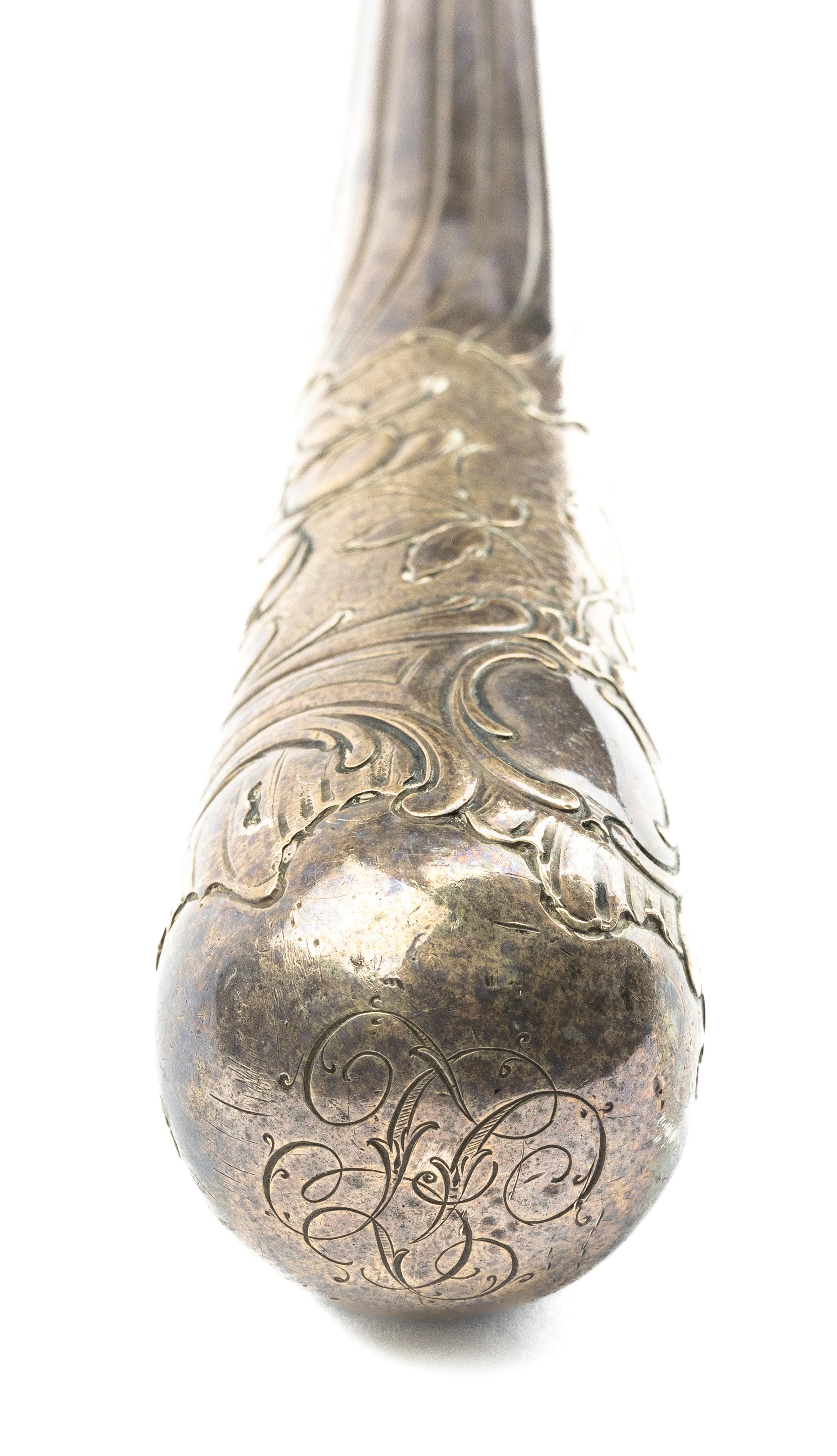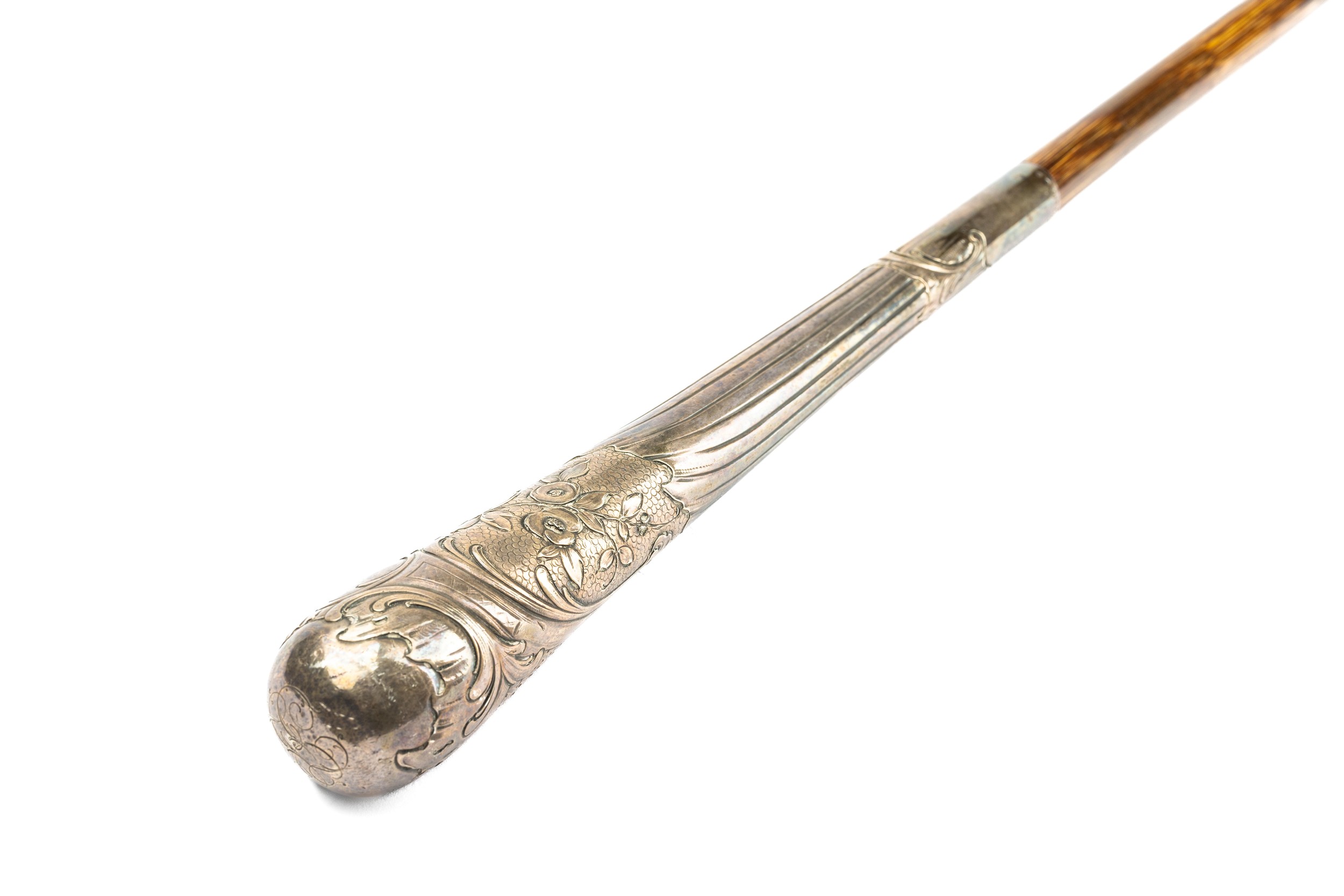 A late 19th century German "Wanderstock", hiking stick, having decorative white metal handle, bearing monogram, fitted a steel spike tip, the handle has stamped marks, Koch and Bergfeld of Bremen. The company records consider this is a rare item, possibly designed by Heinrich von der Cammer, leader of the design office 1874-1903, 110cm tall