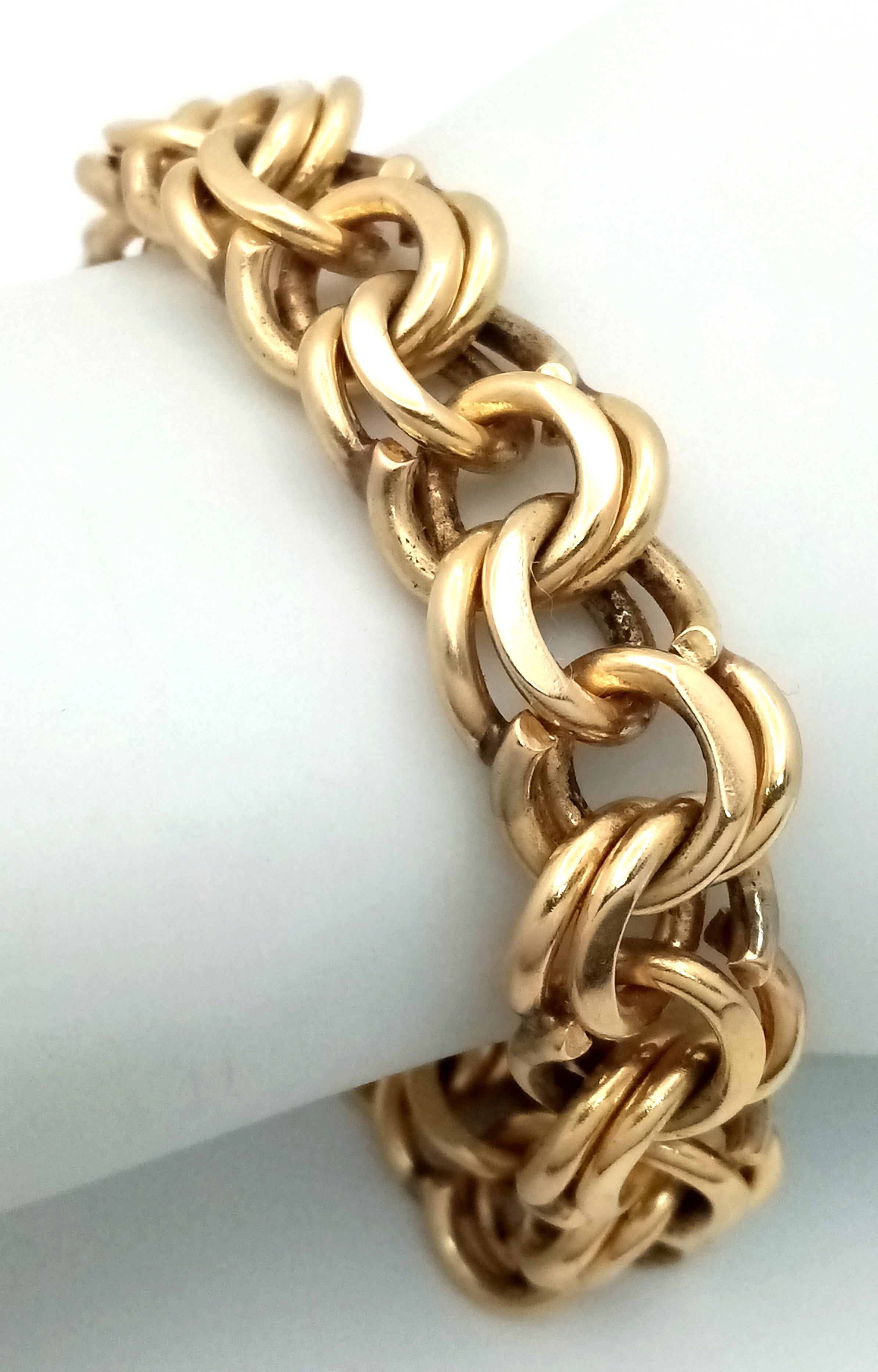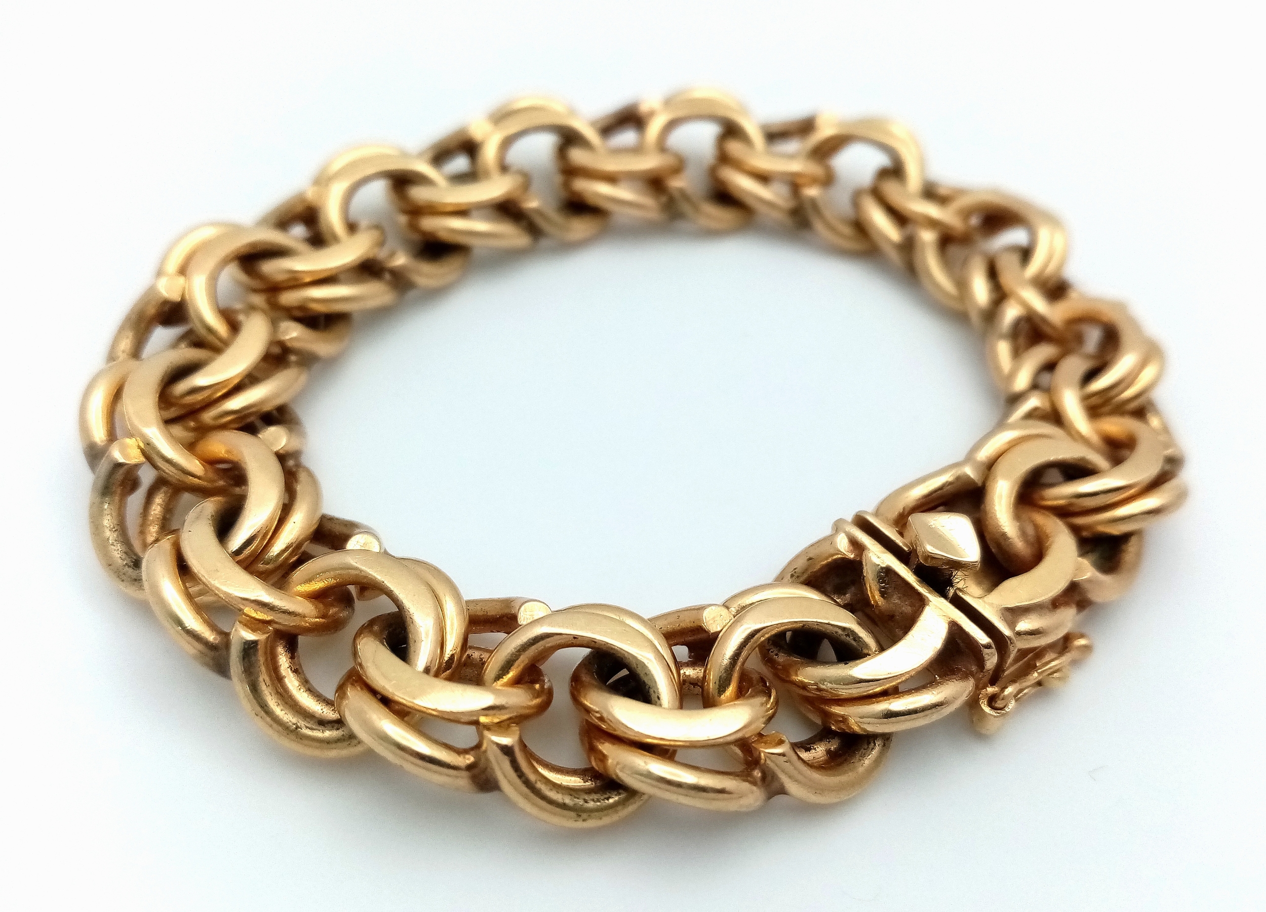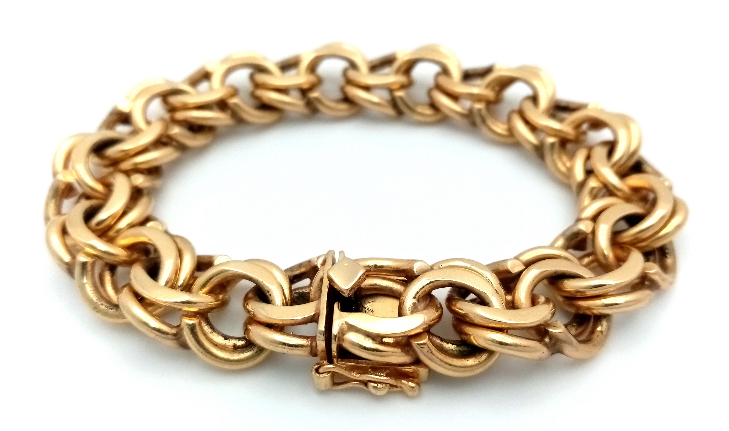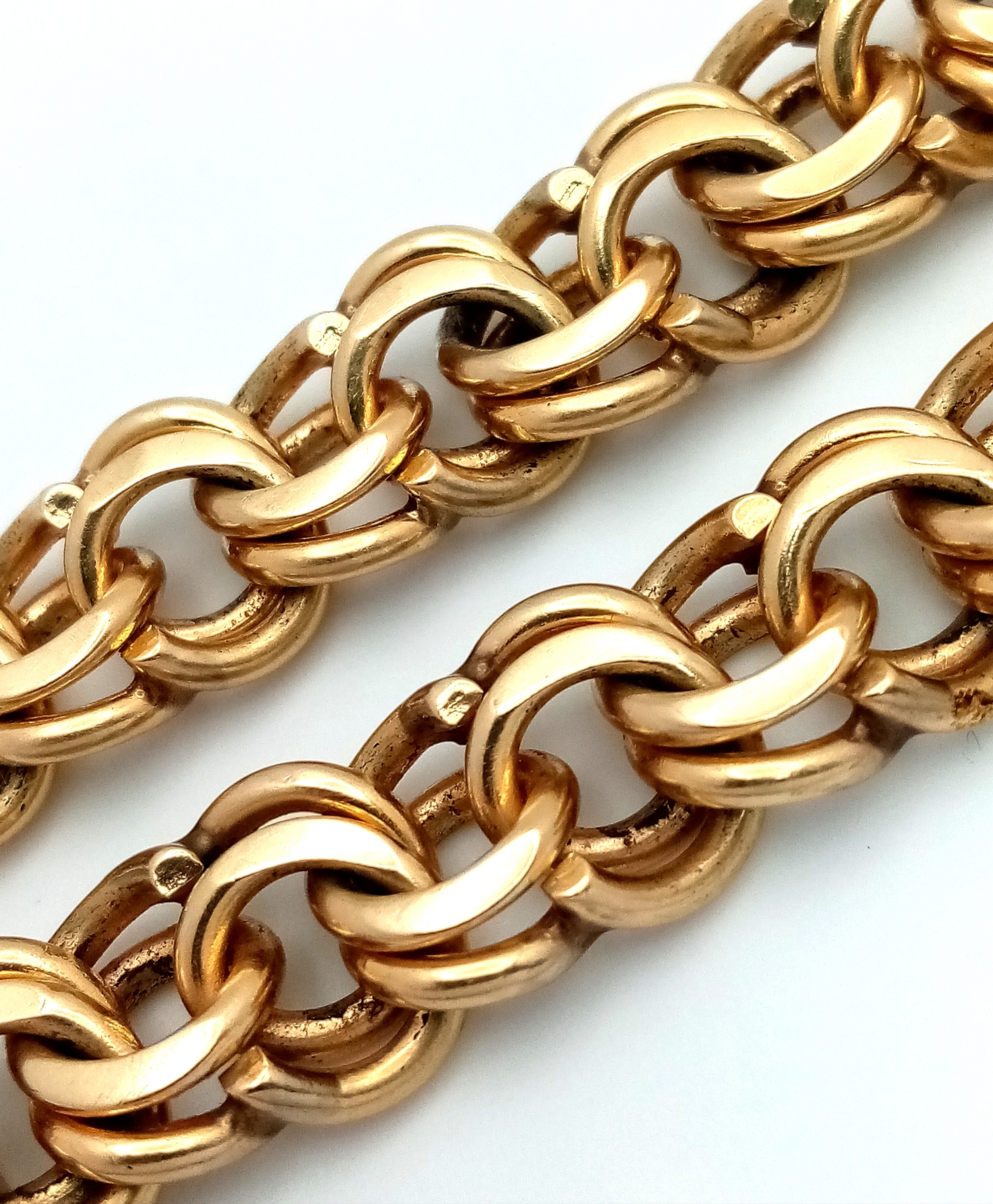 A SUPERB DOUBLE FANCY LINK BRACELET IN 14K GOLD WITH SAFETY CATCH IN AS NEW CONDITION . A SERIOUSLY HEAVY AND CHUNKY BRACELET . 66.2gms 19cms