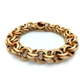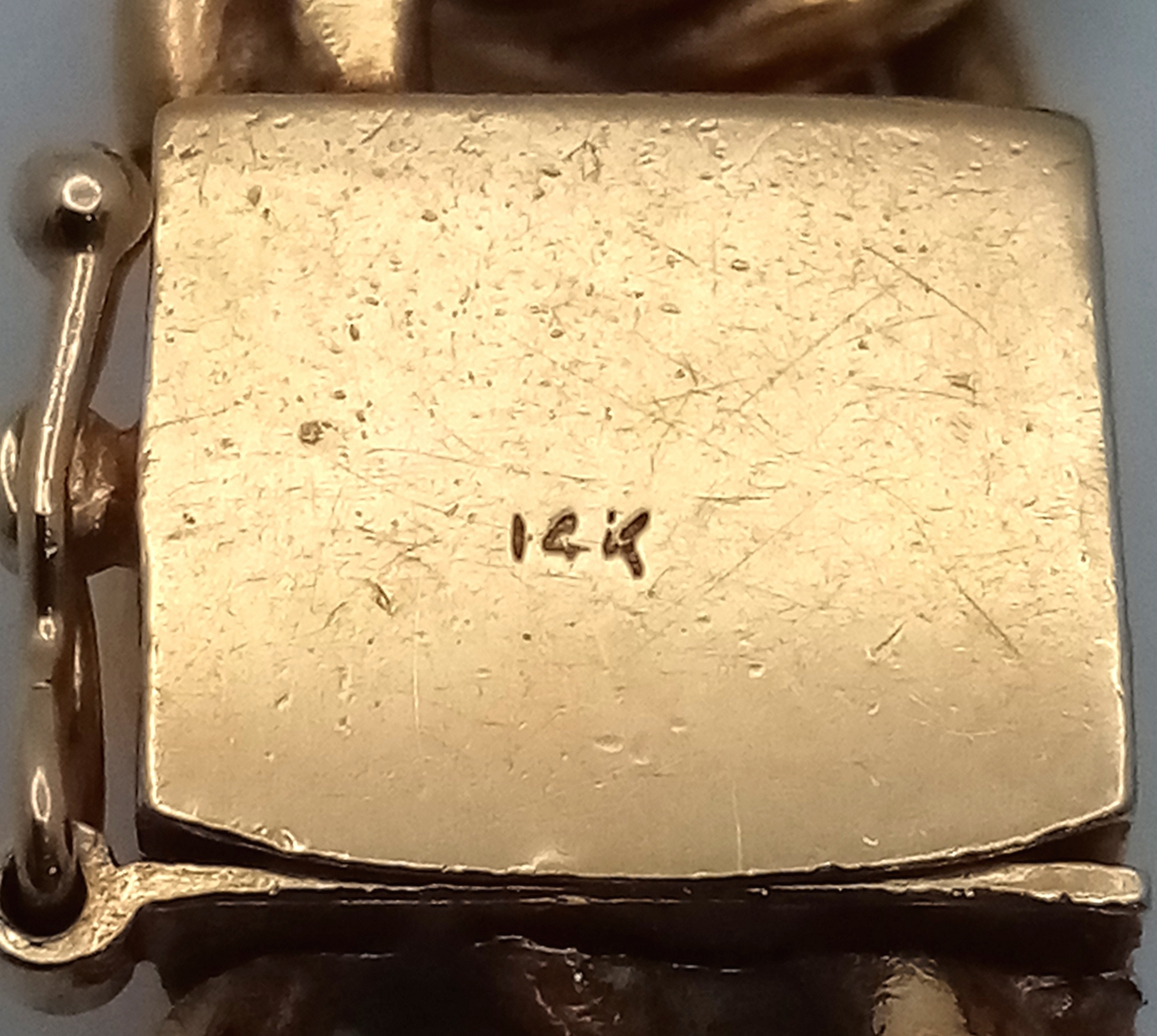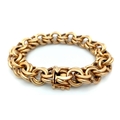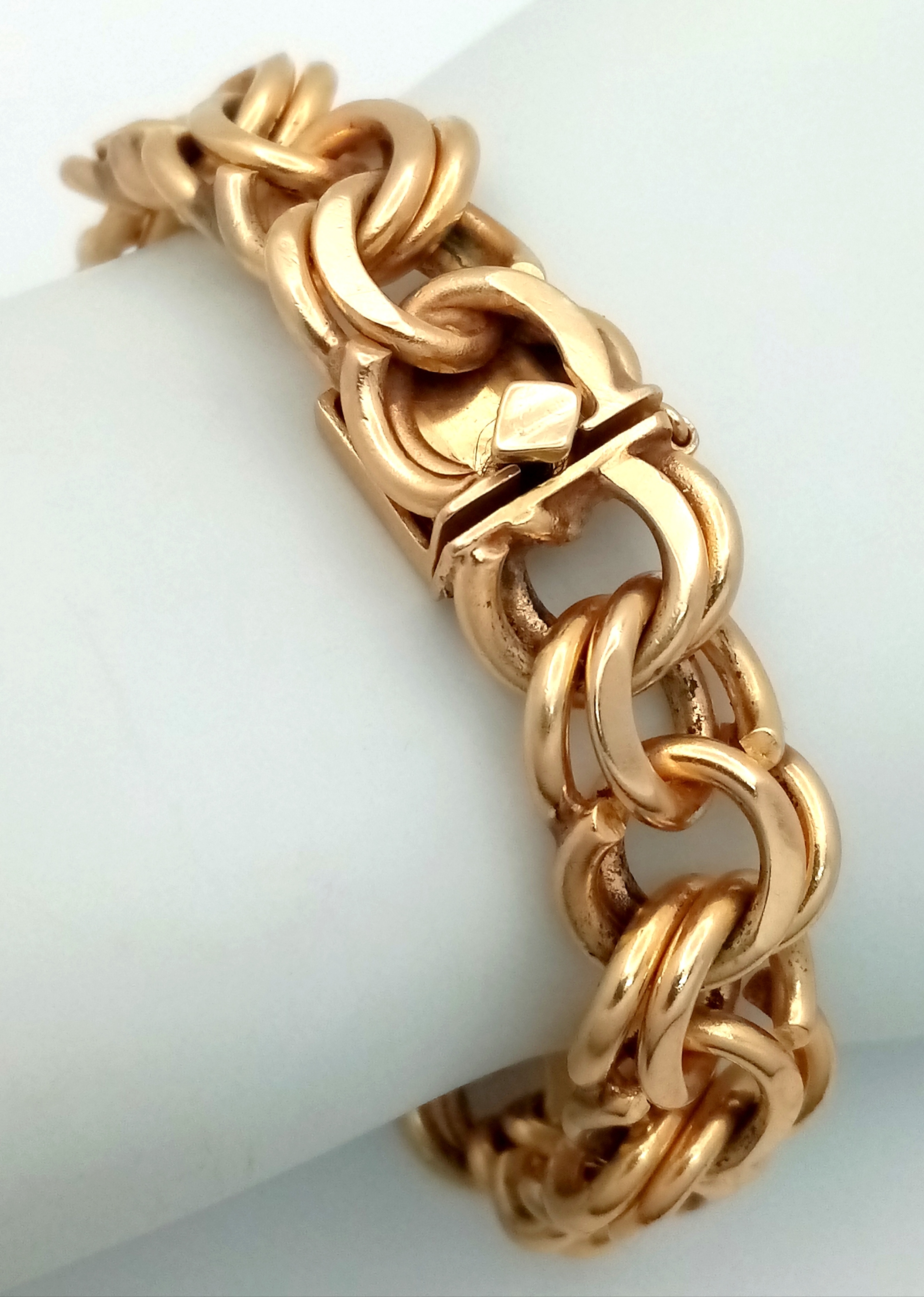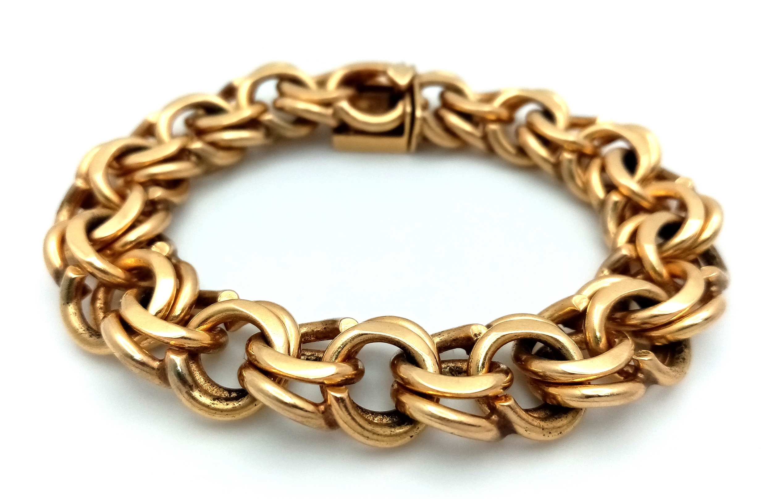 A SUPERB DOUBLE FANCY LINK BRACELET IN 14K GOLD WITH SAFETY CATCH IN AS NEW CONDITION . A SERIOUSLY HEAVY AND CHUNKY BRACELET . 66.2gms 19cms