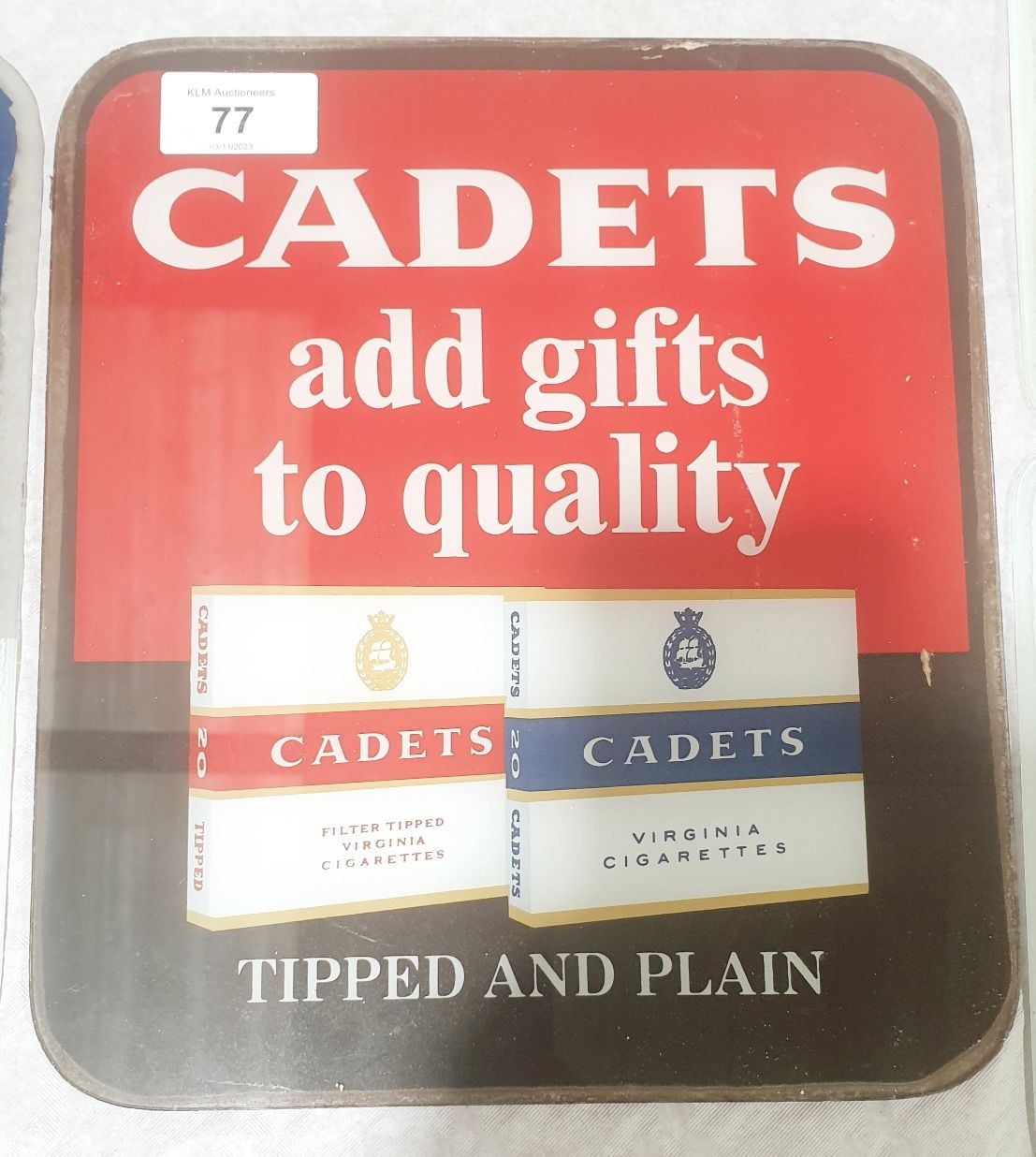 A vintage glass Cadet's cigarette advertising plaque, 10.25"x8.75". No shipping. Arrange collection or your own packer and shipper, please.