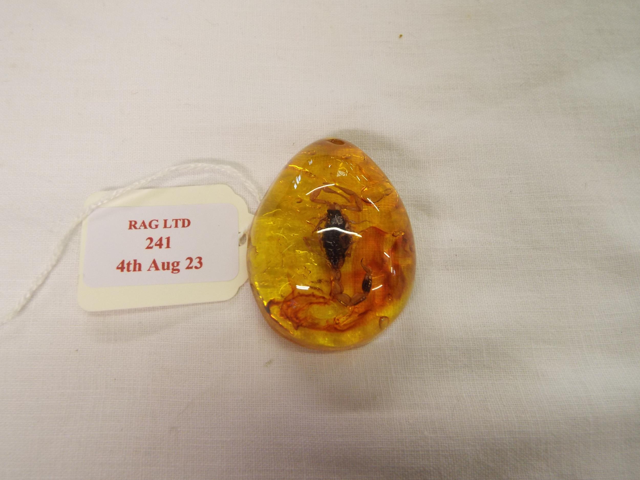 An amber pendant having in-cased trapped beetle
