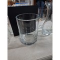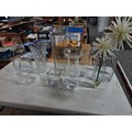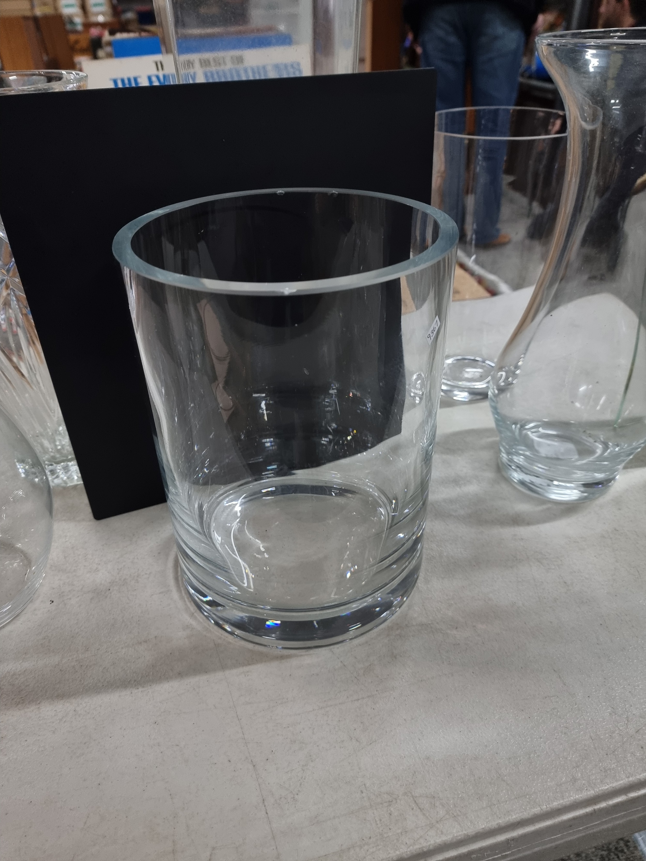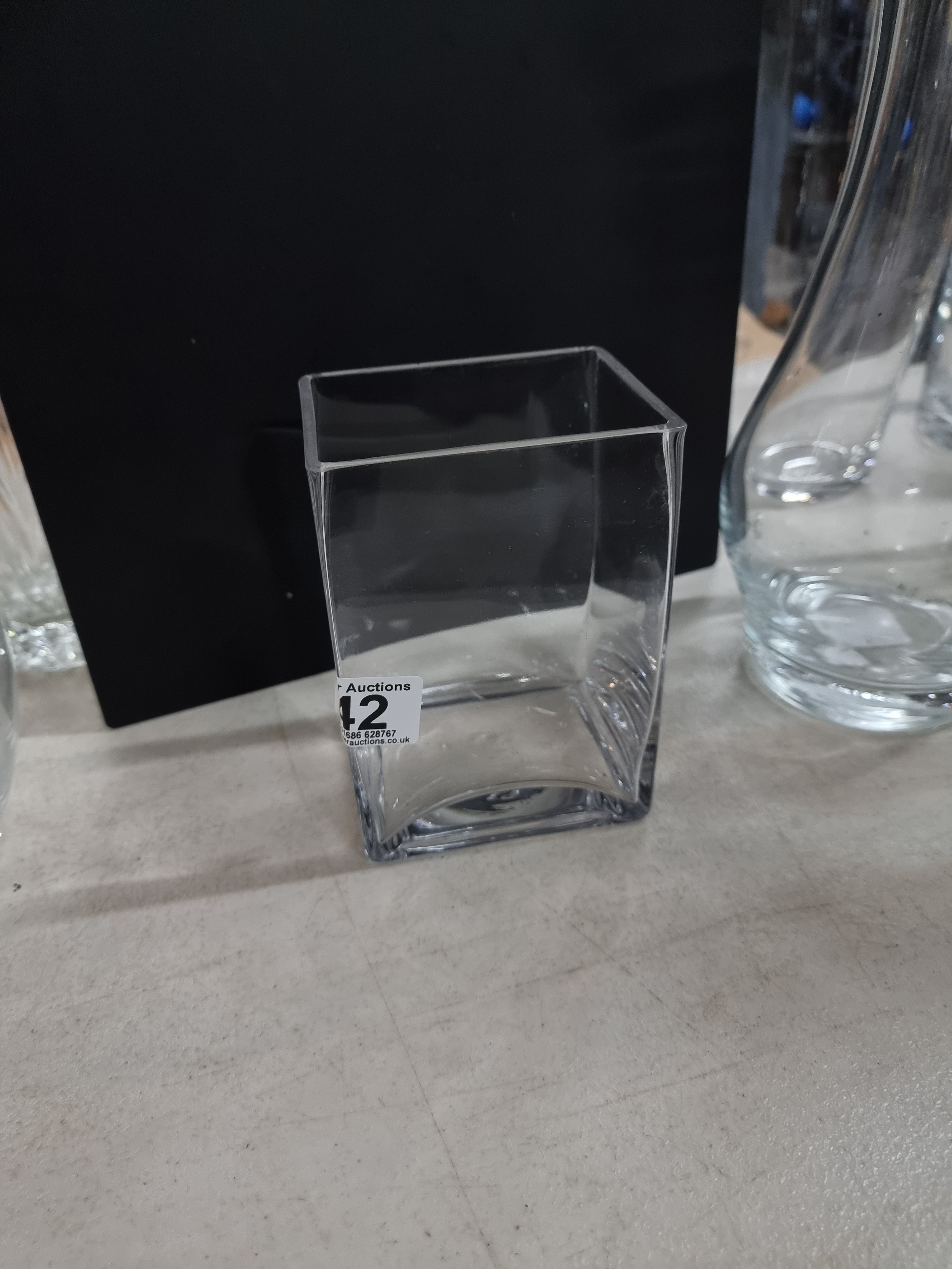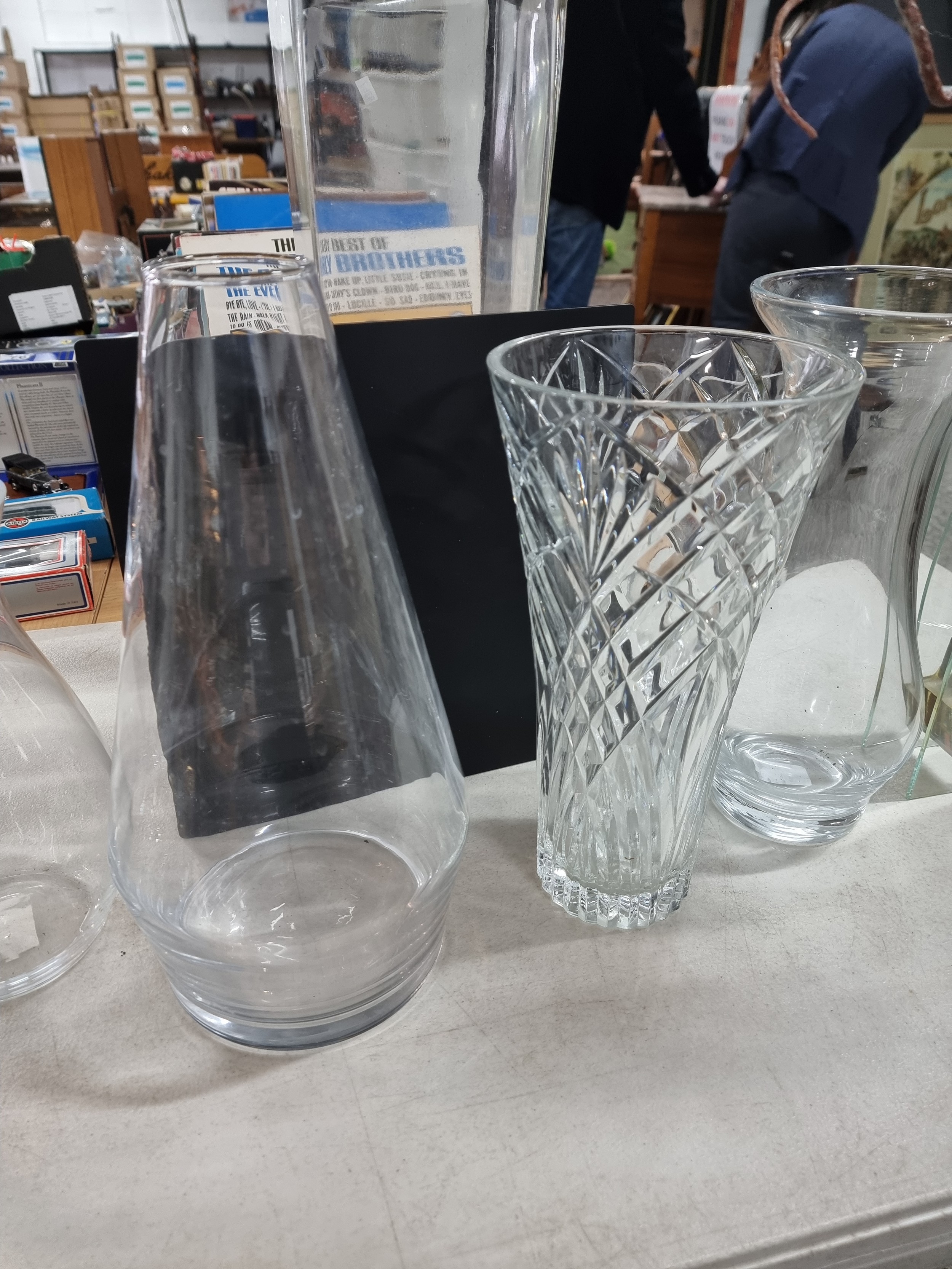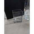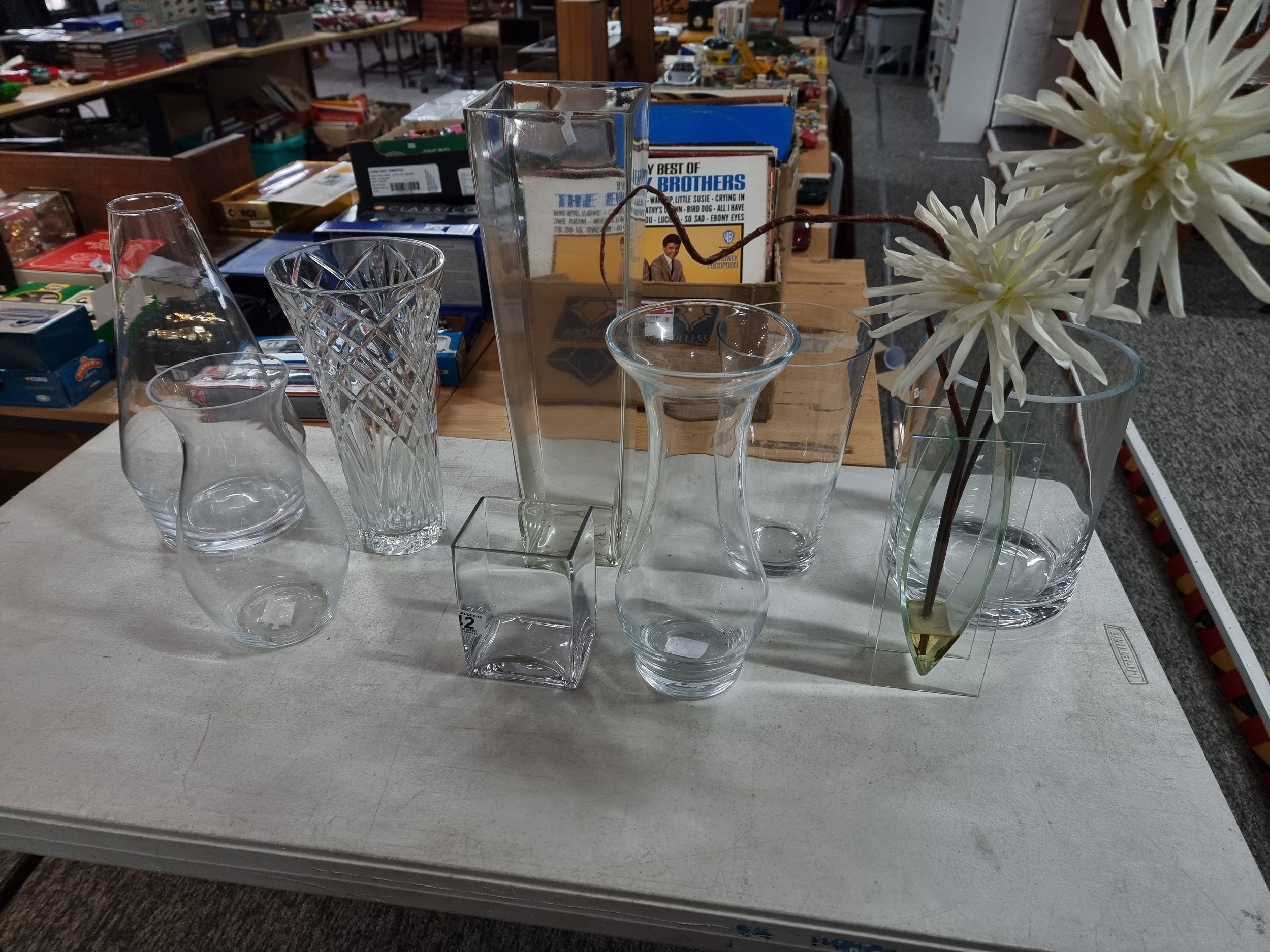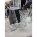 2x shelves containing a quality of modern glass vases inc a large cut glass crystal vase, a good quality heavy square vase, conical and cylindrical vases along with a vase containing plastic white flowers, largest vase measures 45cm high