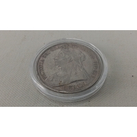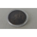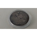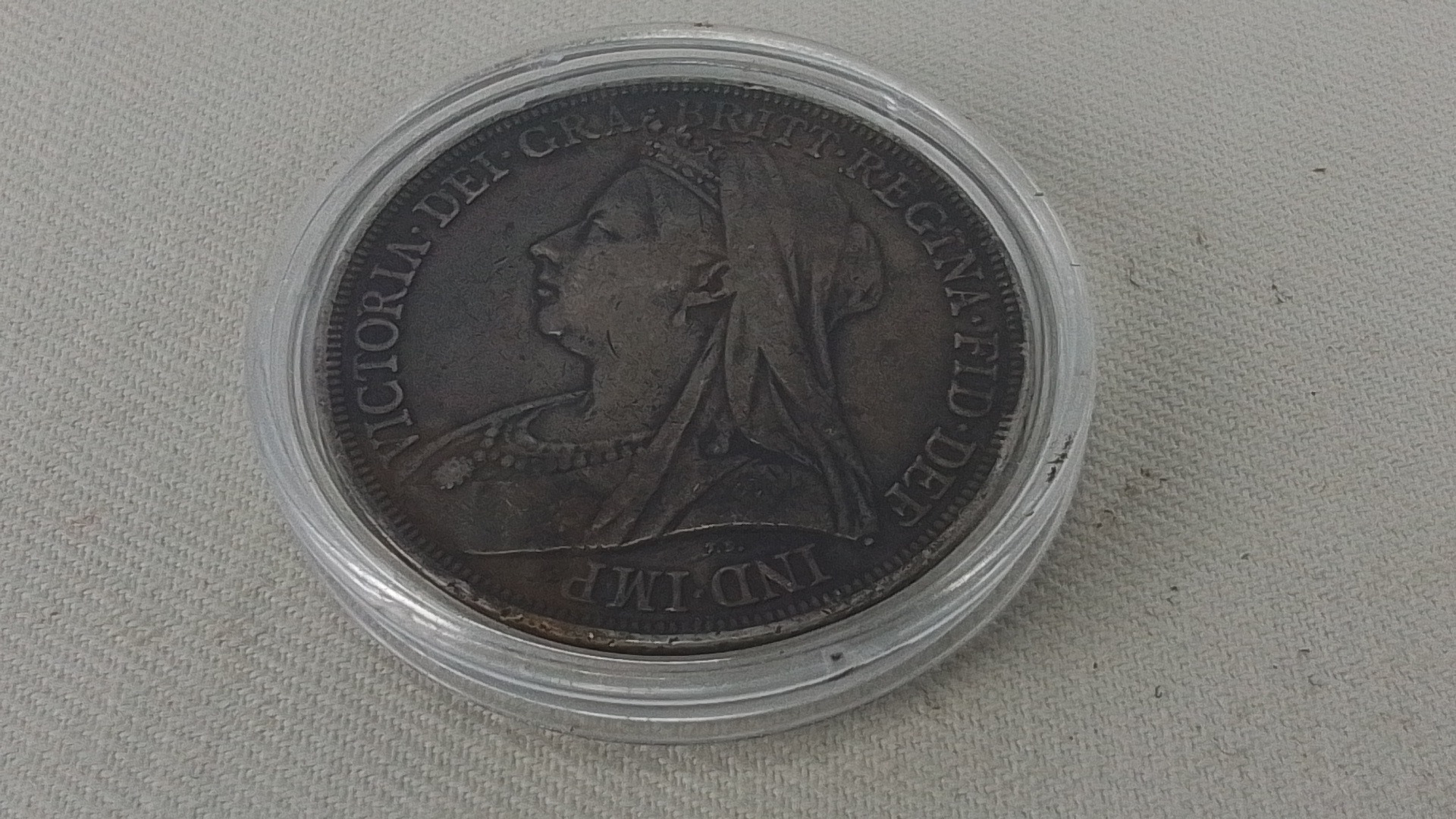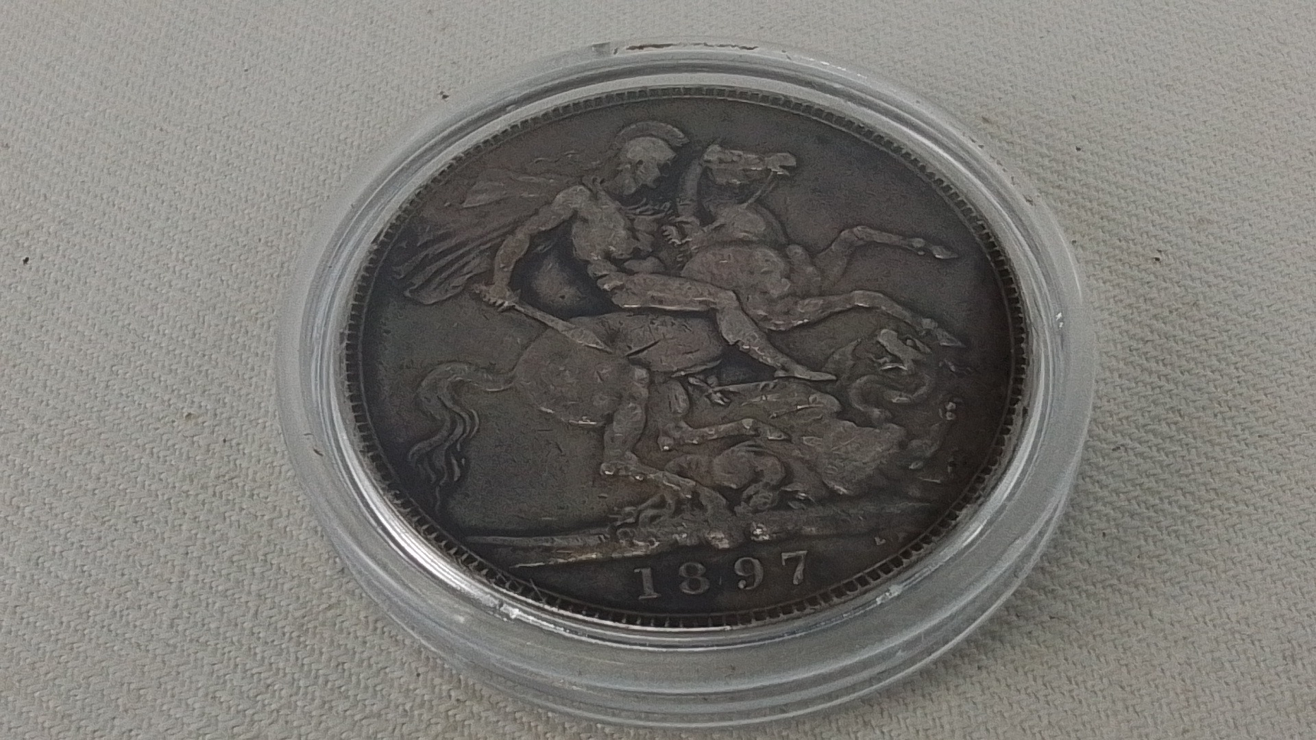 A Victorian crown coin, dated 1897, with veiled head portrait of Queen Victoria and St George and the Dragon reverse, presented in a plastic capsule.