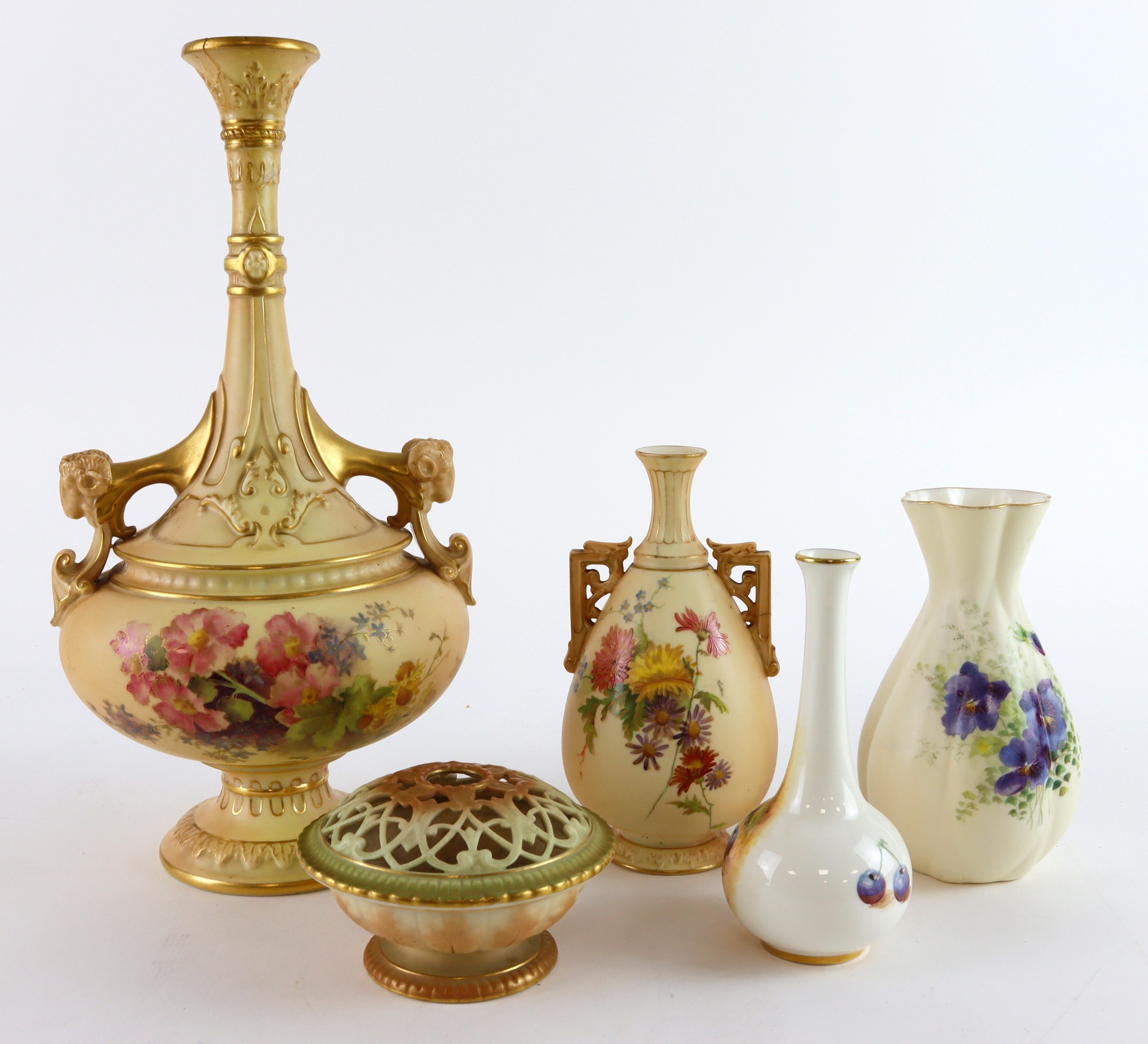 Four pieces of Royal Worcester porcelain, along with a Royal China Works Worcester Vase no G435, the Royal Worcester comprising Nos 1600, 1539, G302 and 2491, one piece with a decorator's name on it, and the two largest pieces with repairs (5)
