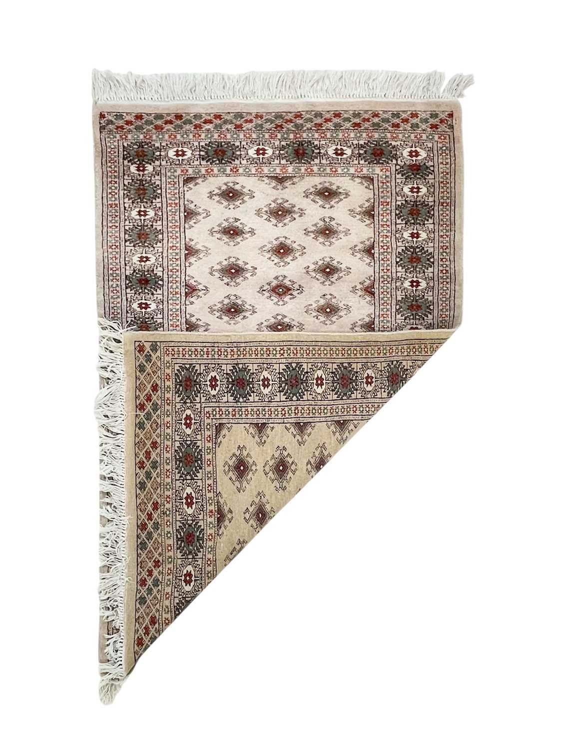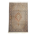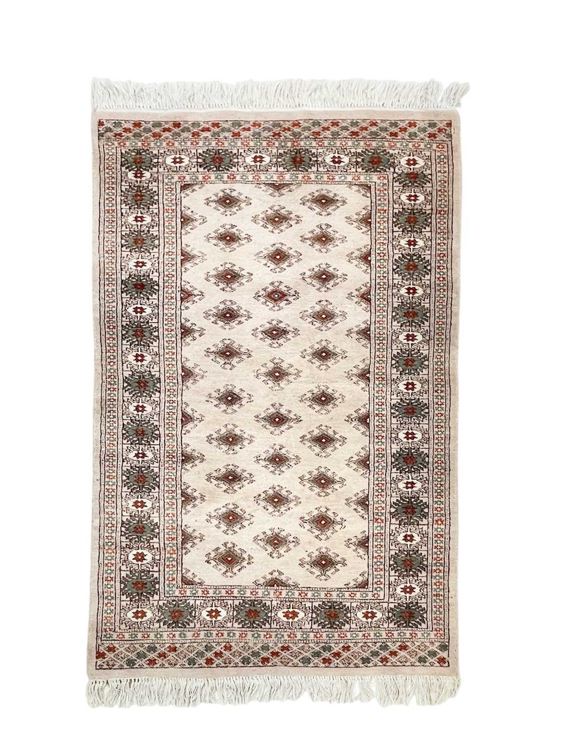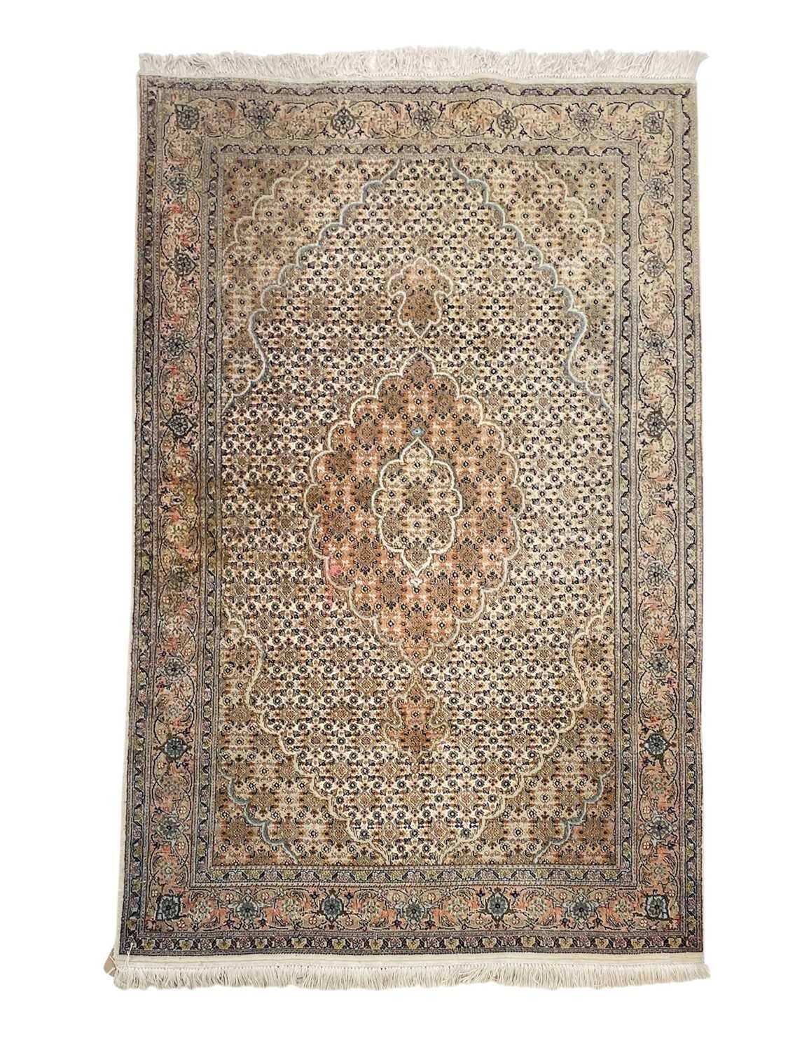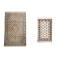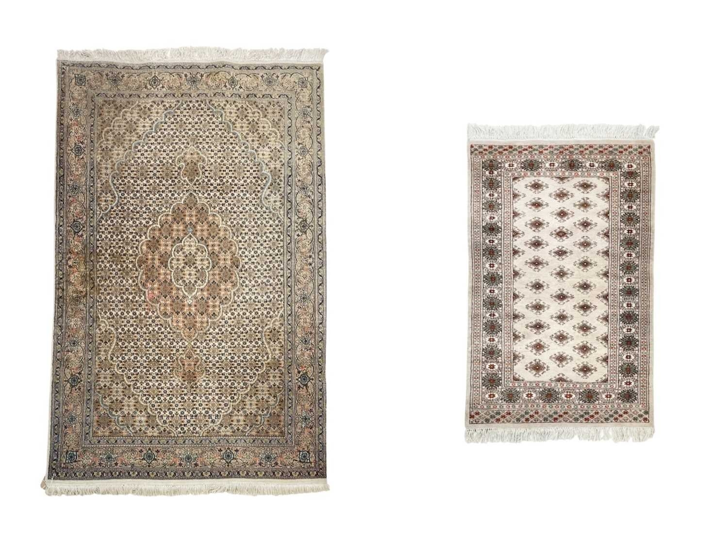 A wool pile Tabriz rug. In muted tones, central scalloped medallion within floral borders, 166cm x 106cm, with a Bokhara wool pile on cotton rug, 123cm x 80cm (2).