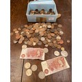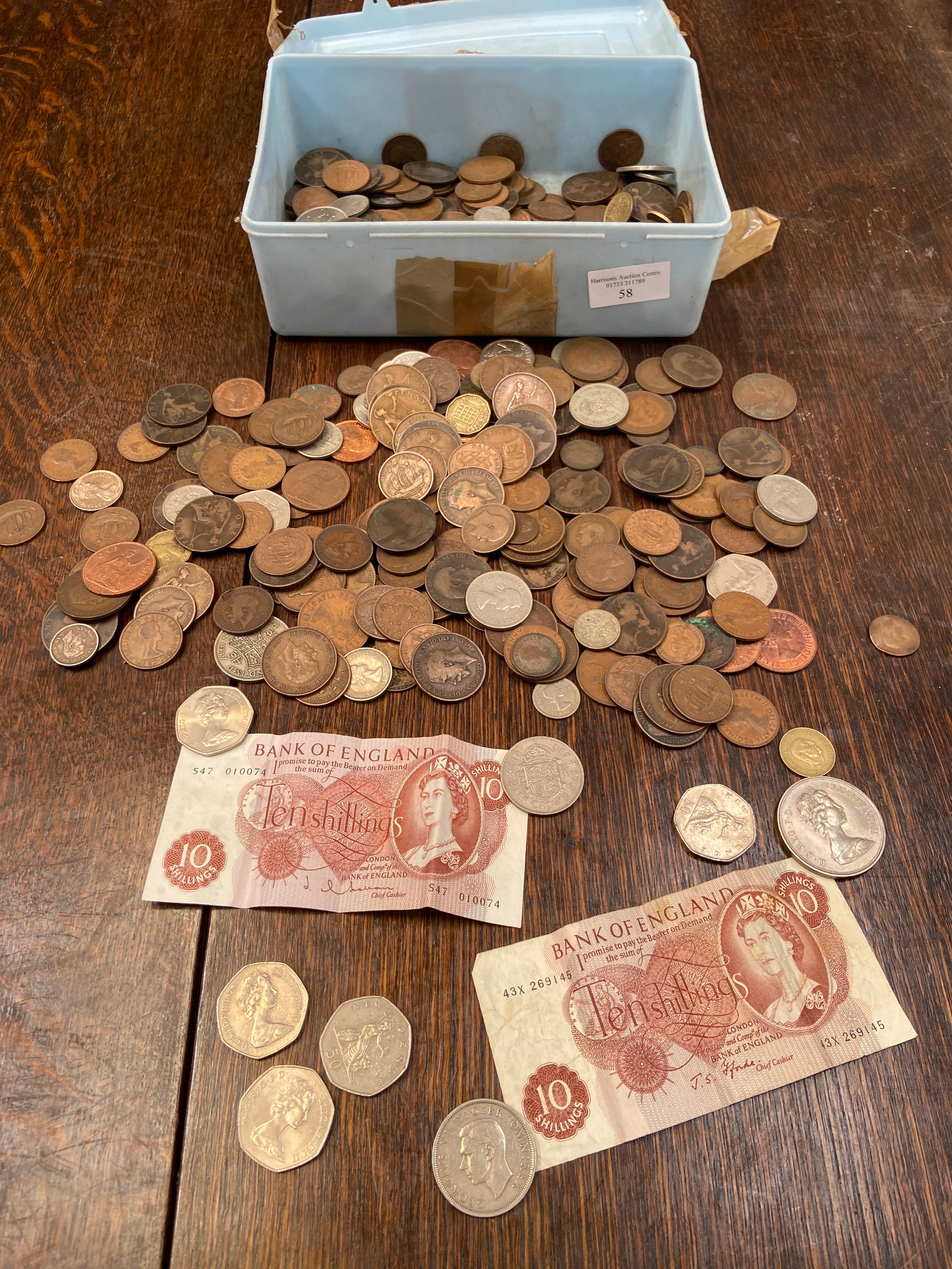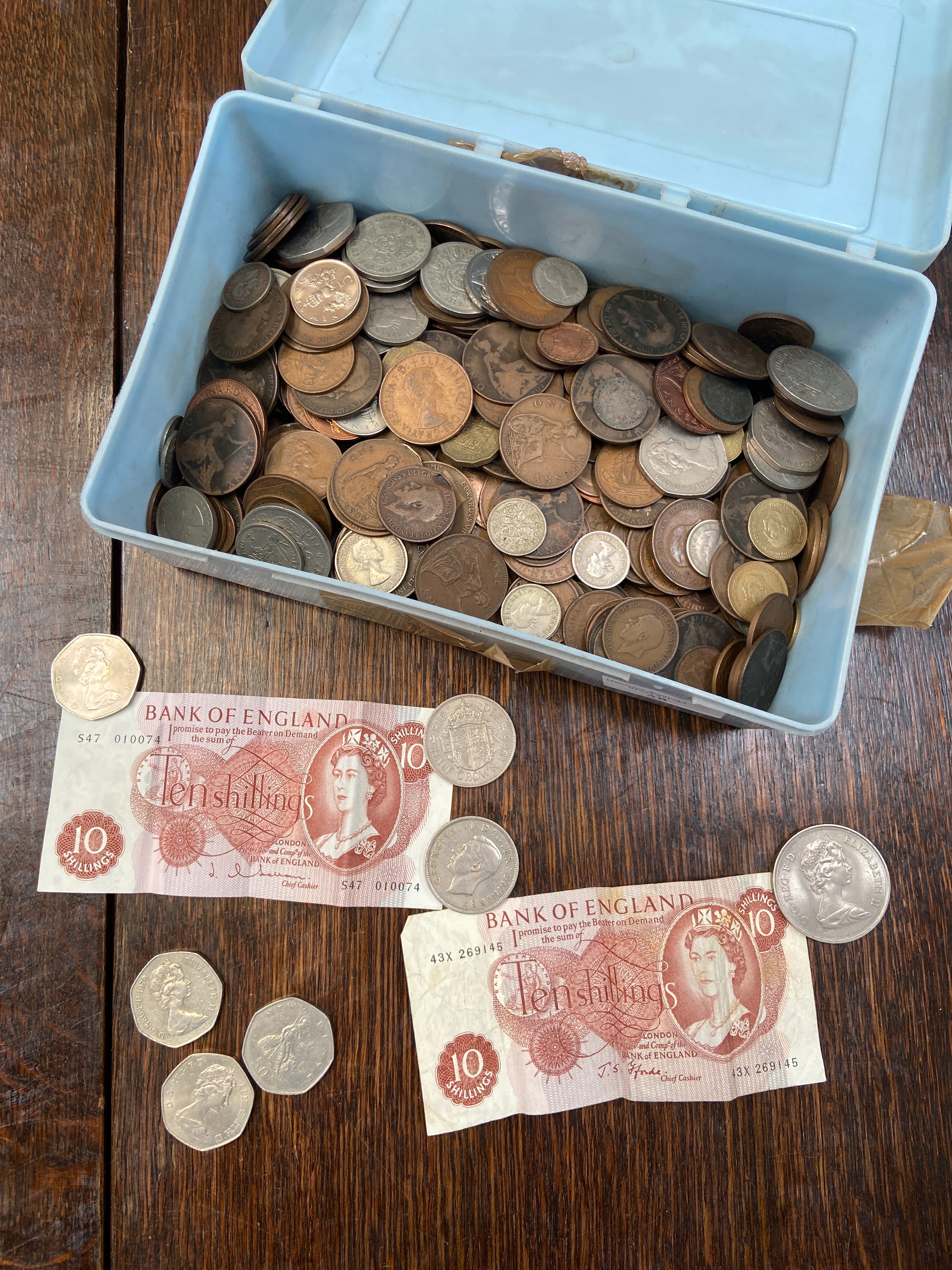 Tub of old coinage, including many Victorian pennies, Shillings etc. Also early 'New' 50p's and 2x Ten Shilling notes.