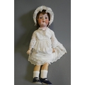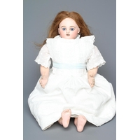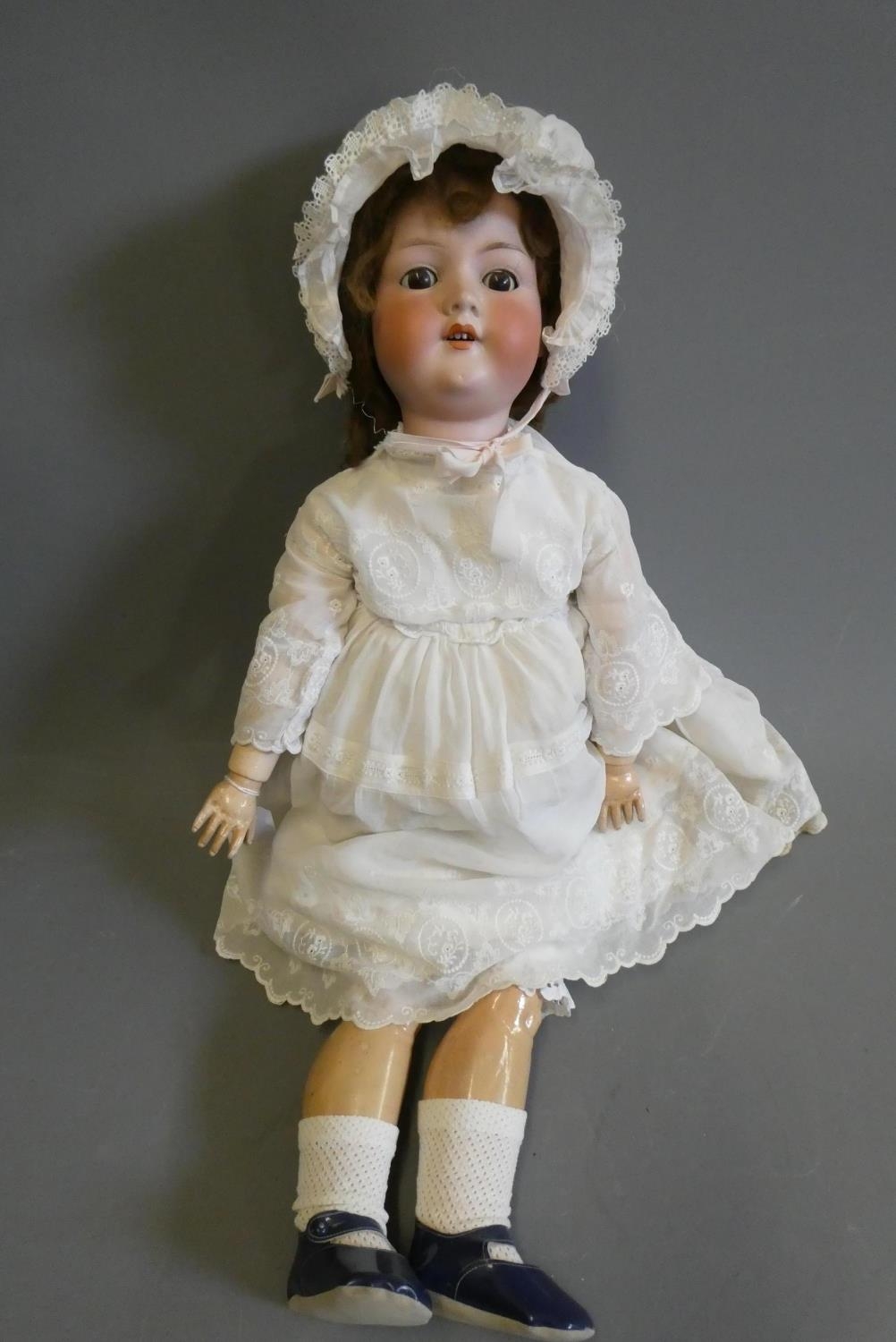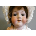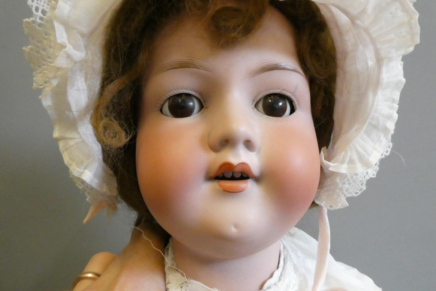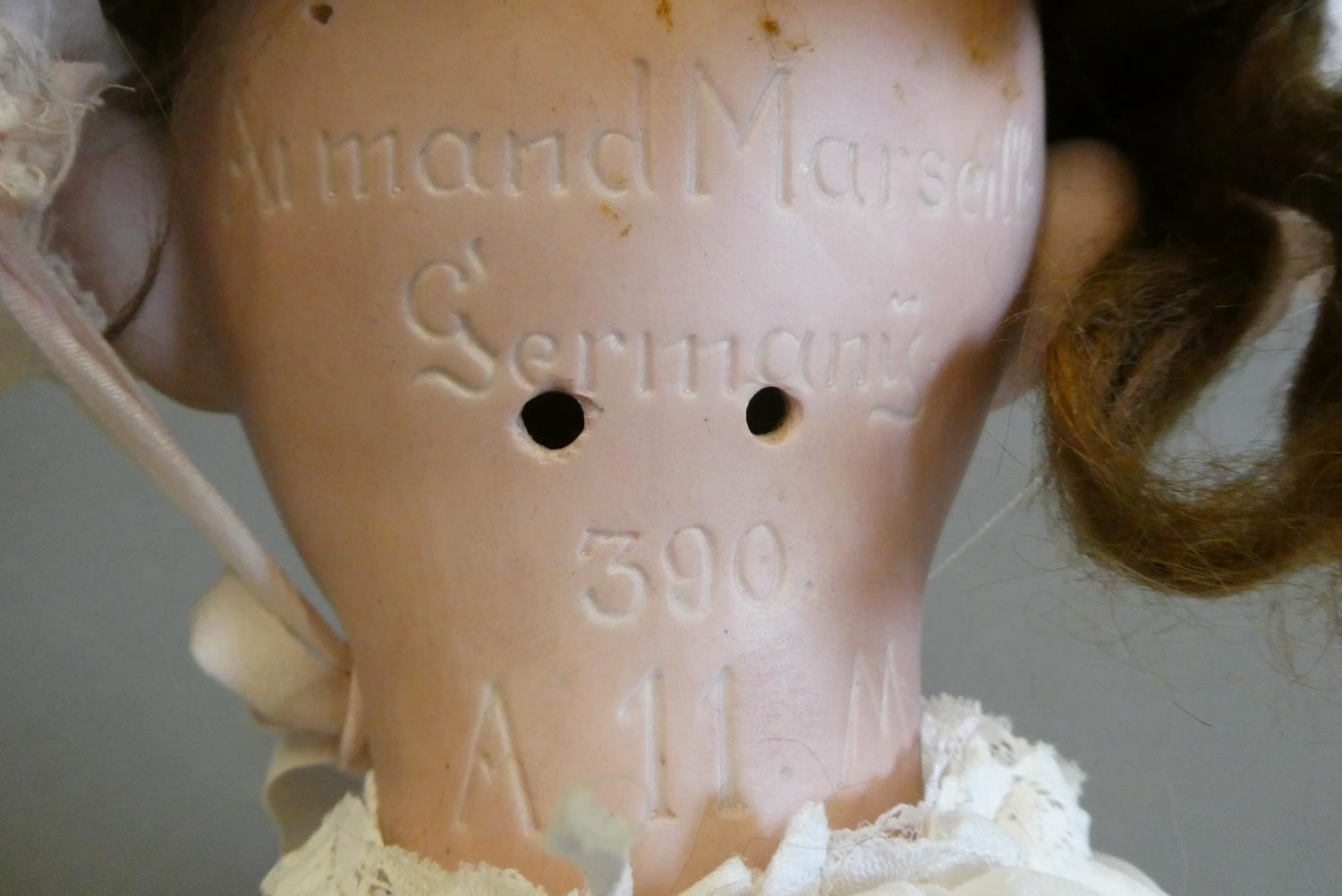 A large Armand Marseille bisque socket head doll, with brown glass sleeping eyes, open mouth, teeth, wood and composition jointed body, white dress and bonnet, numbered 390 11, 29 3/4" long