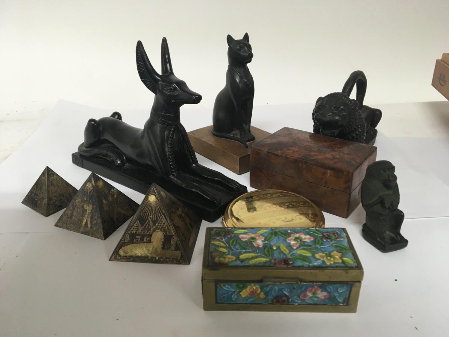 A Chinese enamel Box a collection of Egyptian inspired ornaments.