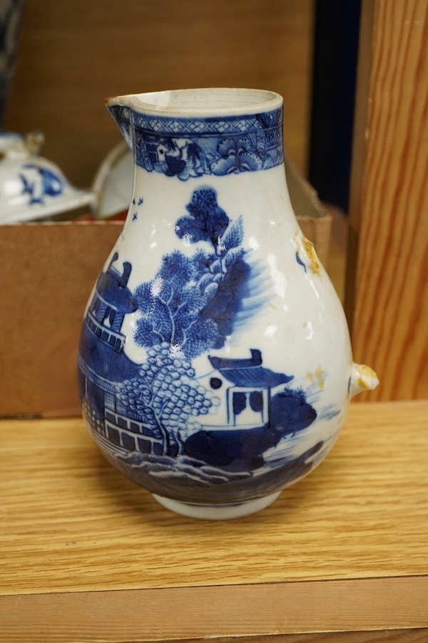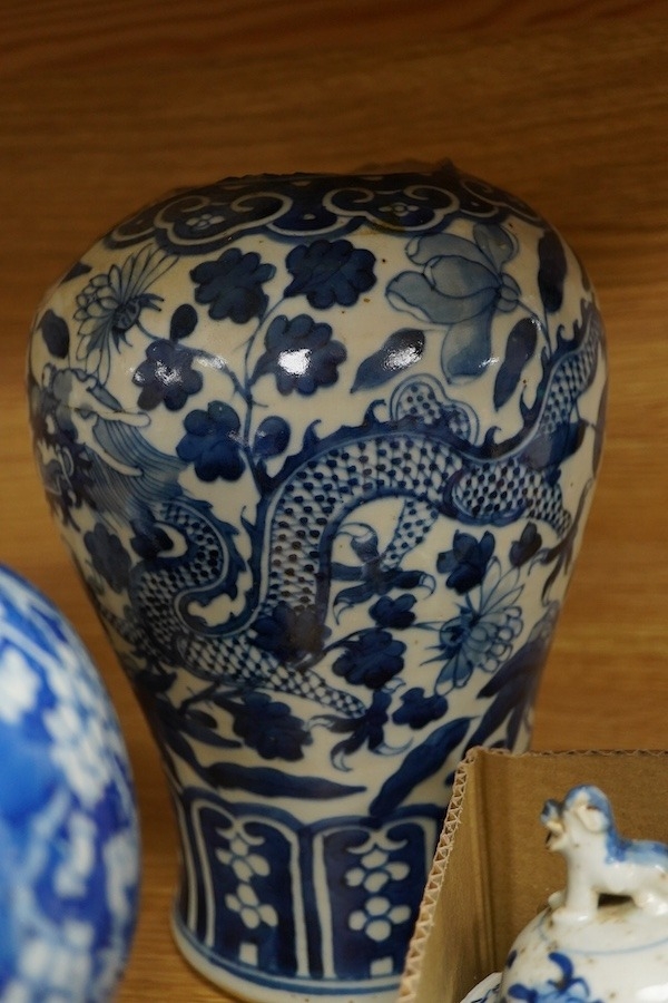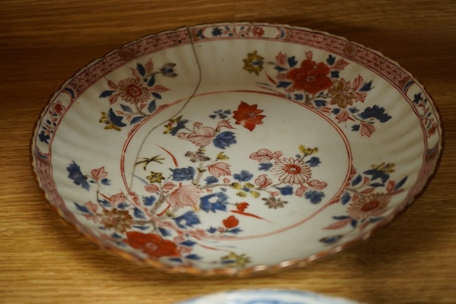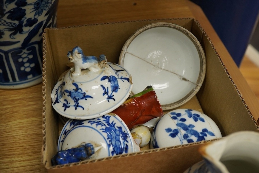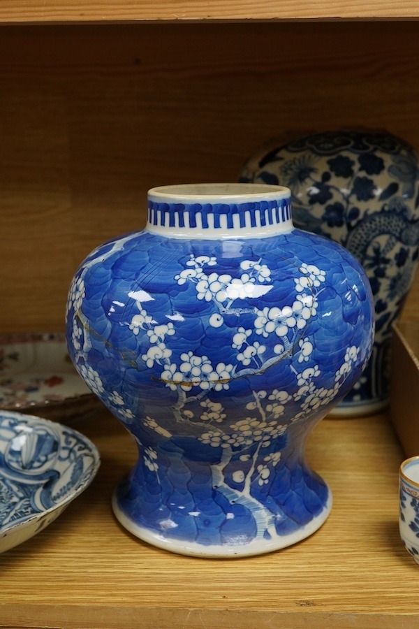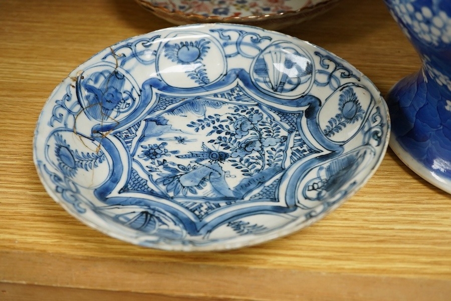 A group of Chinese porcelain, 17th19th century, including a kraak blue and white dish, c.1640, two large jars, tallest 25.5cm - damage throughout