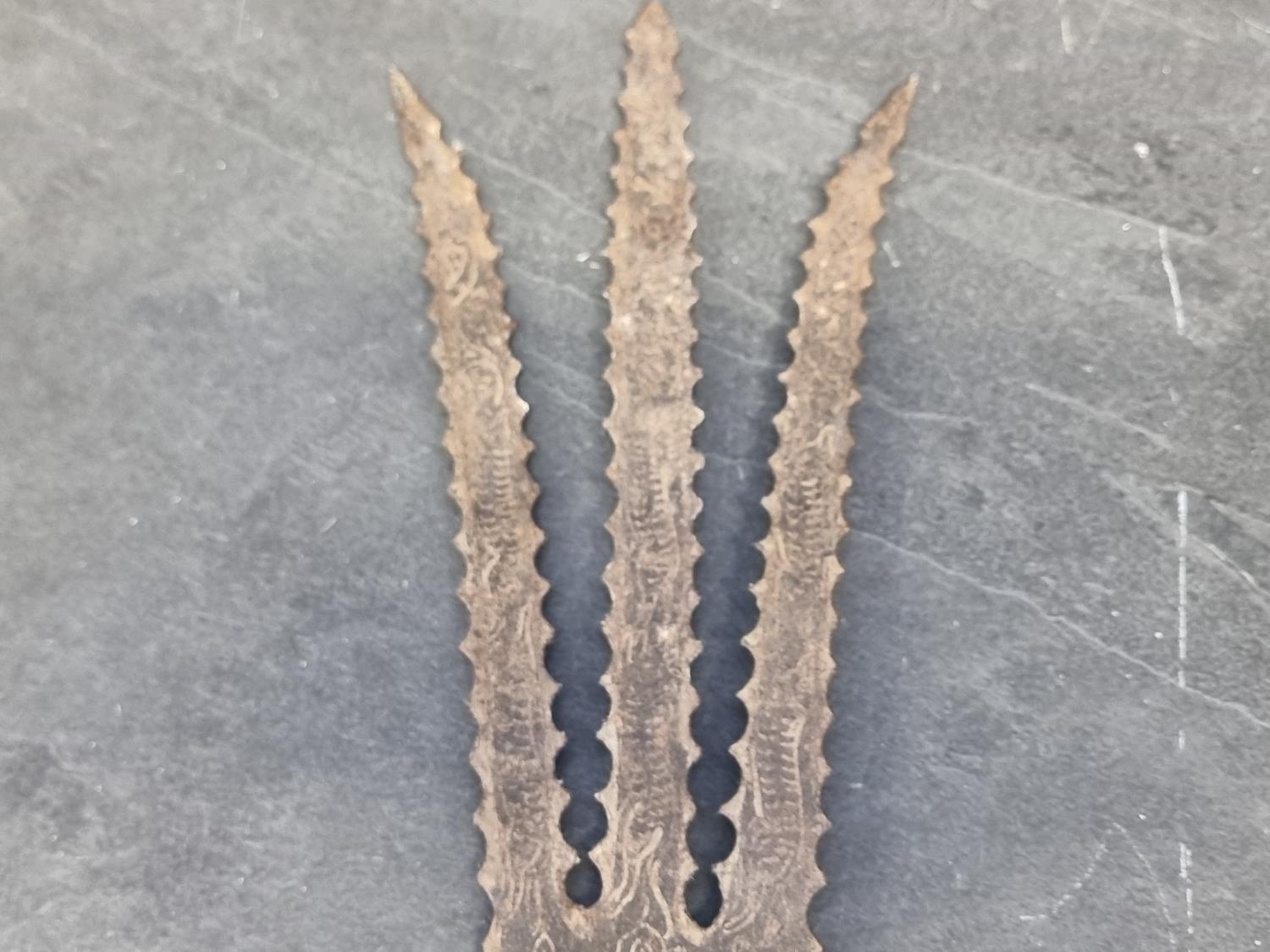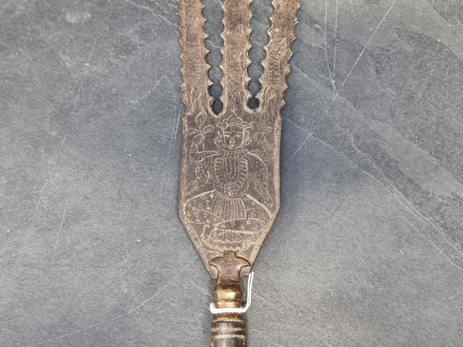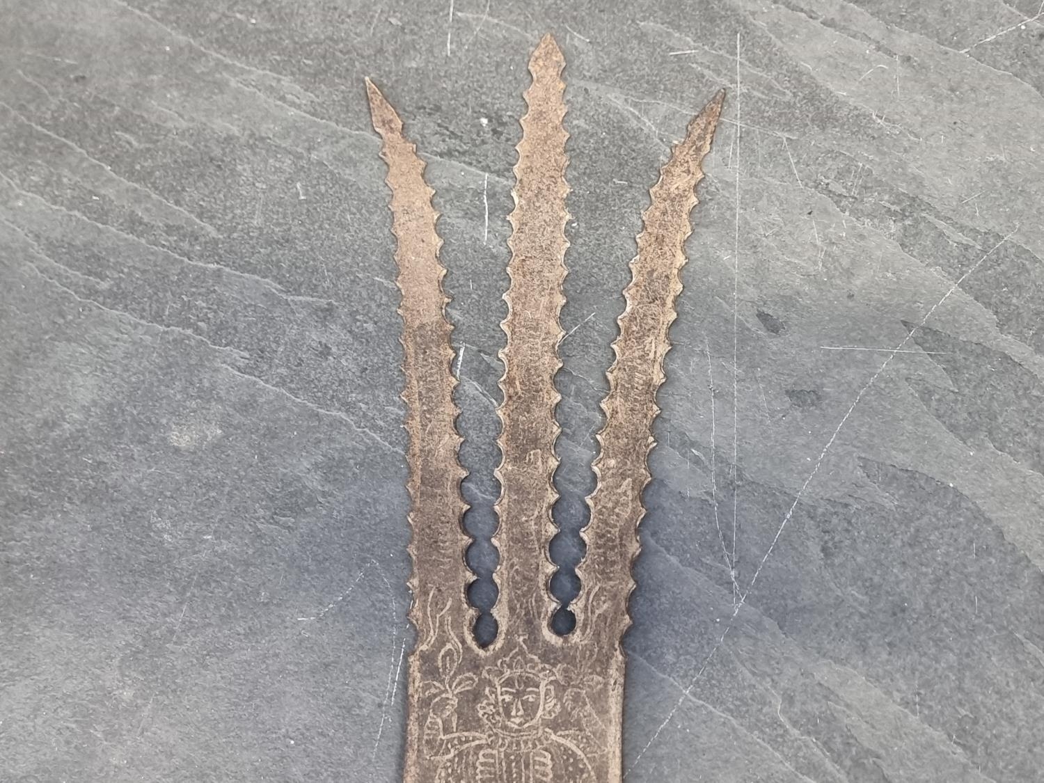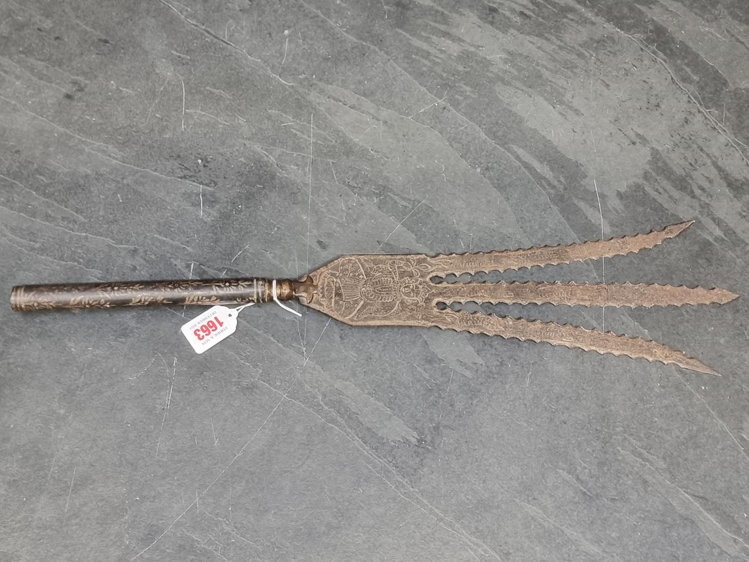 An Eastern three pronged spear, decorated with seated figures, 58cm.