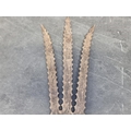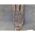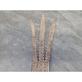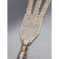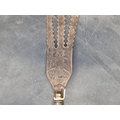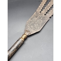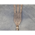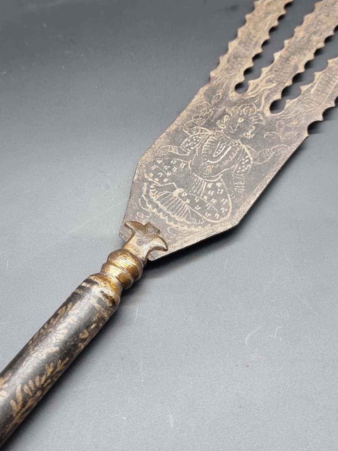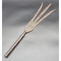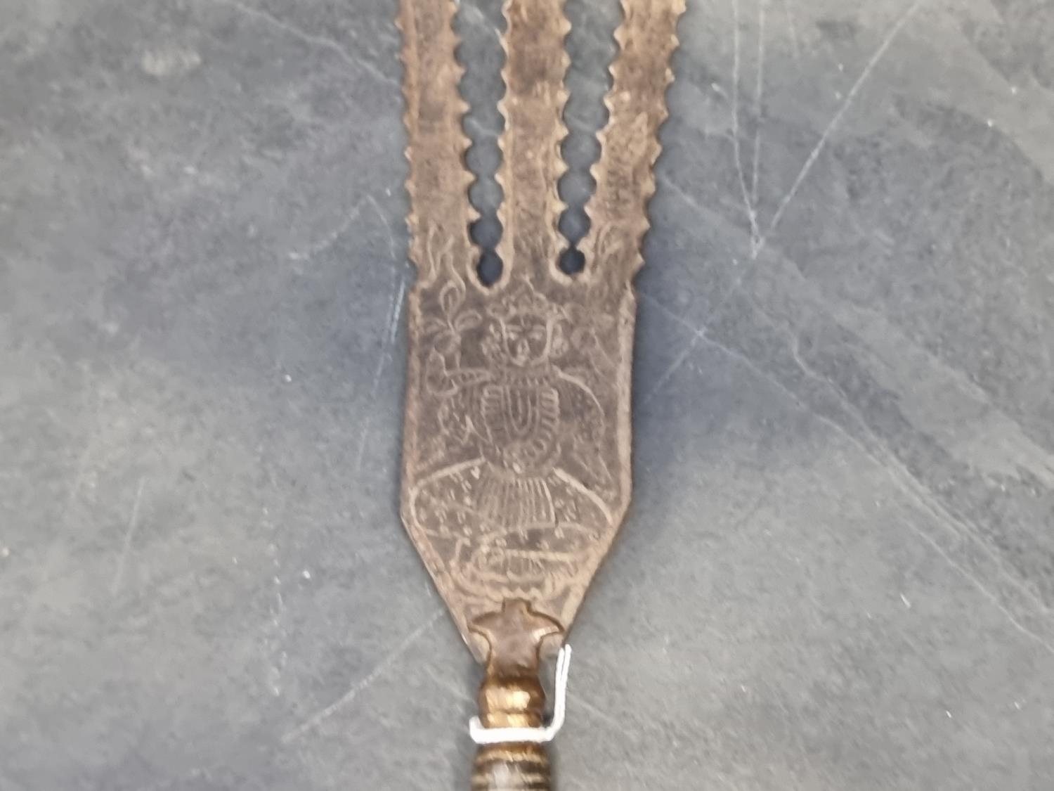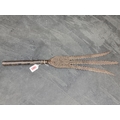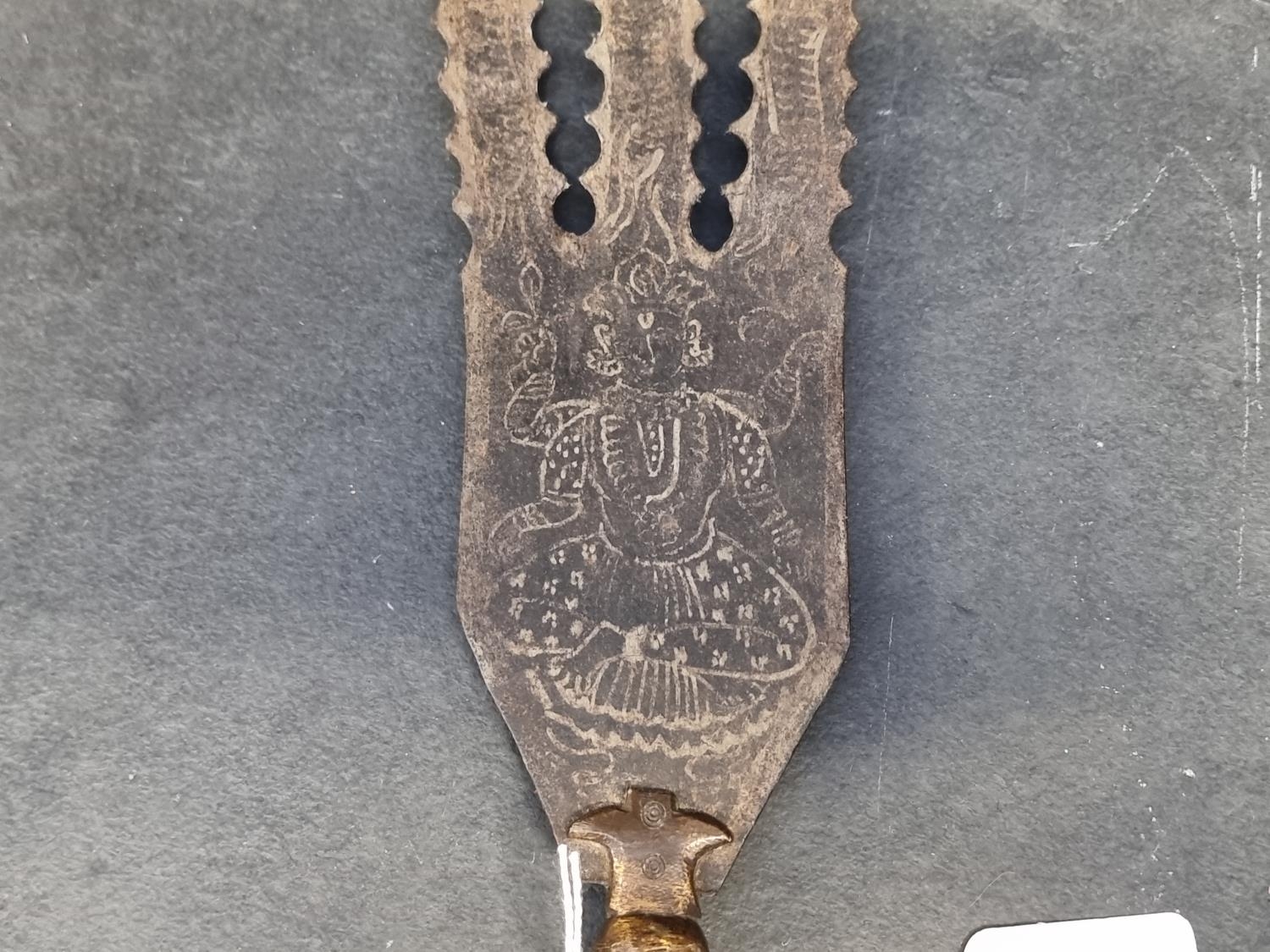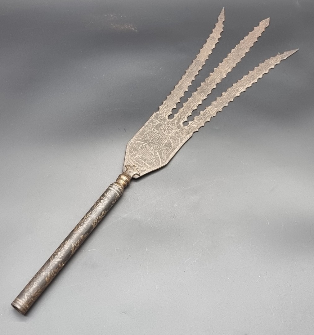 An Eastern three pronged spear, decorated with seated figures, 58cm.