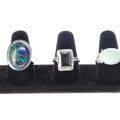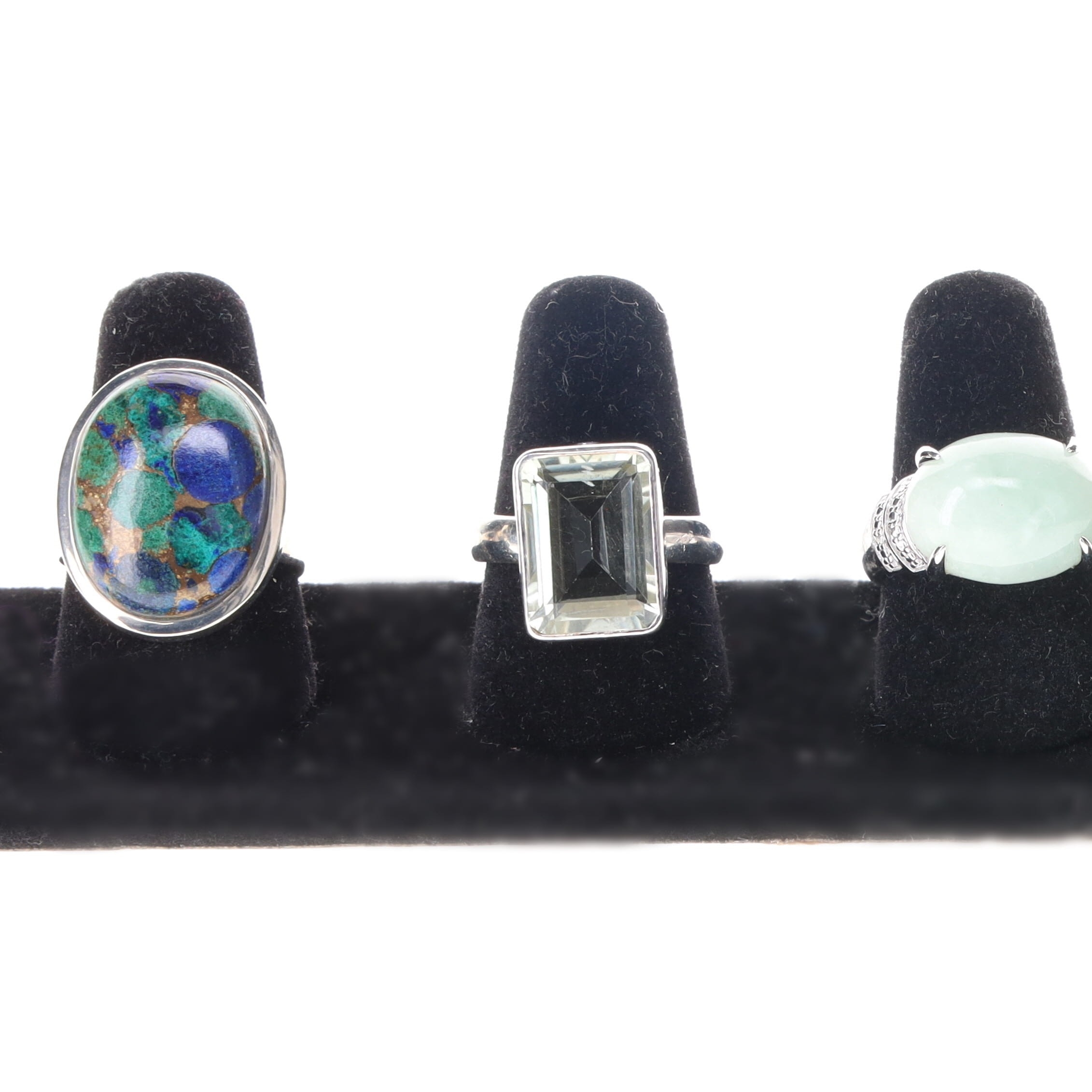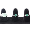 Sterling Silver TGGC Gemstone Ring Collection incl. Emerald, Jade. Each ring is stamped. Some minor surface wear to large cabochon stones, all stones are secure, minimal band misshaping. Weighs in total 25.8g.