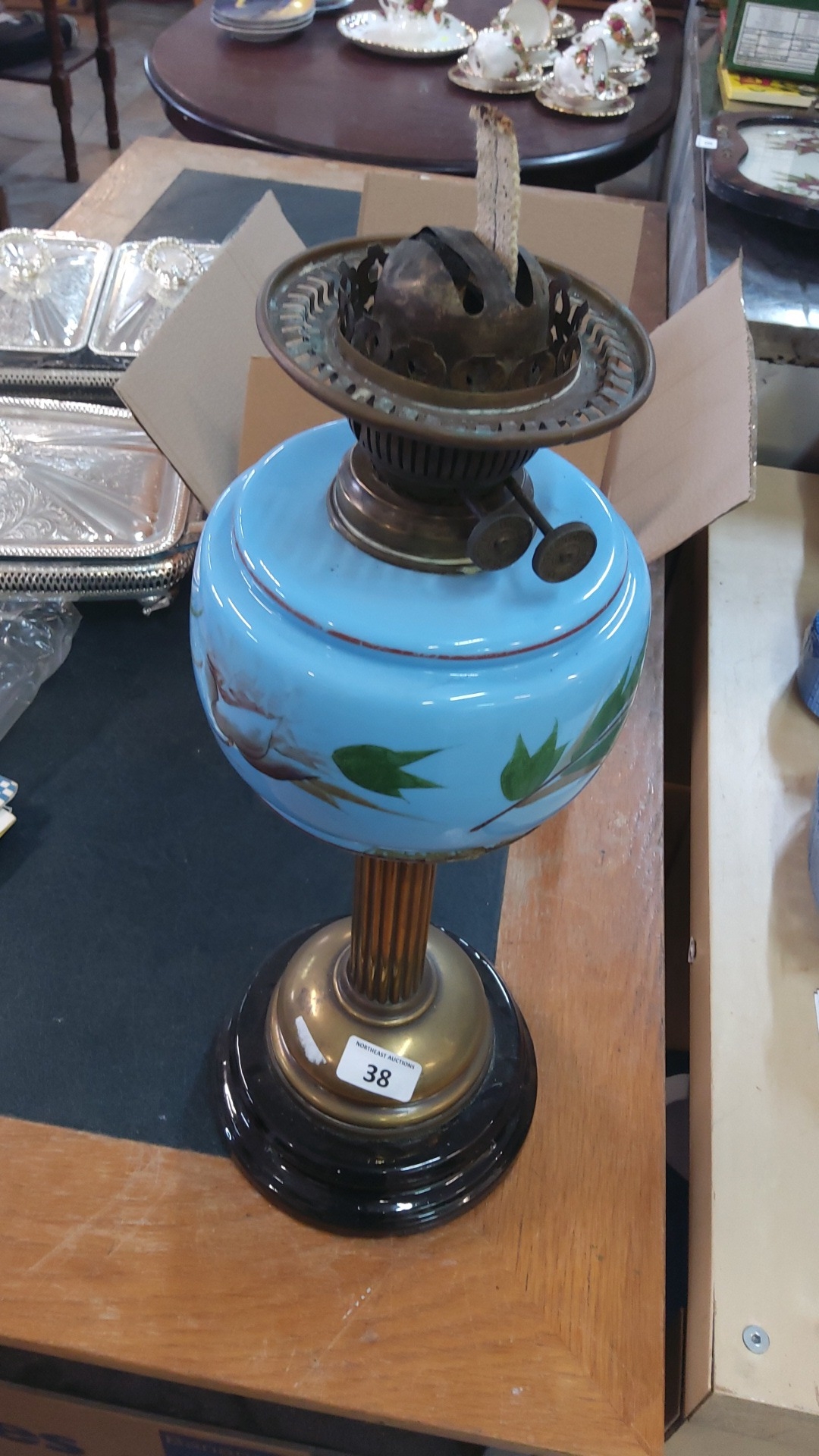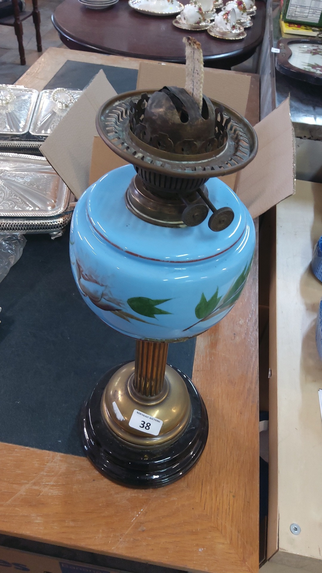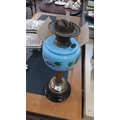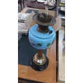 A Victorian-style oil lamp with brass burner and chimney gallery, the blue opaline glass font enamelled with foliate sprays, raised on a fluted brass column and circular black base.