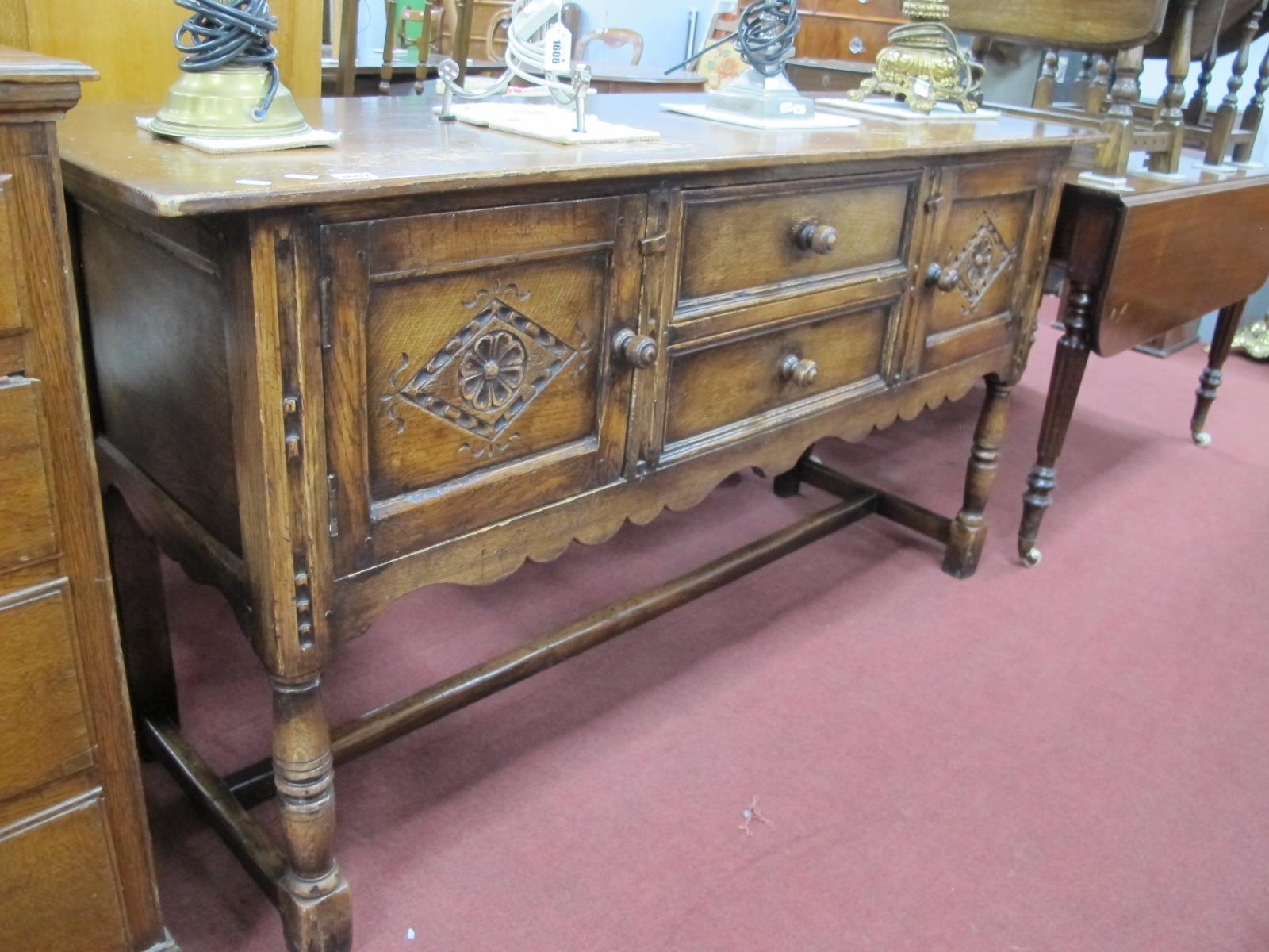 A XVII Century Style Oak Sideboard, with two central drawers flanking cupboard doors with lozenge decoration, on turned and block supports, 152cm wide.