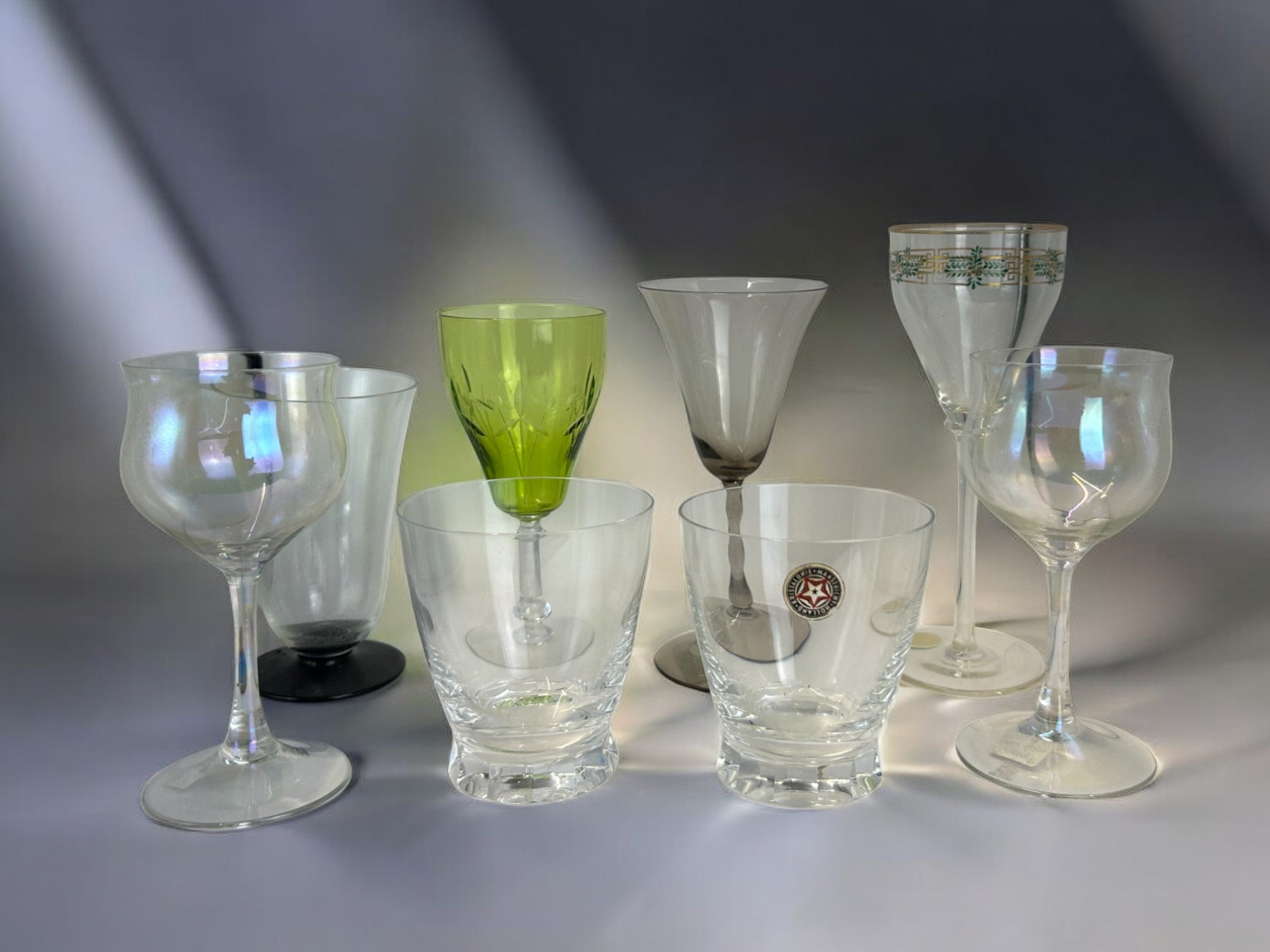Including a pair of Copier Leerdam lustre glasses, Art Deco Simon Gatefor (Orrefors) Sandvick Astrid wine glass, pair of Kristalunie, Maastricht tumblers and more.