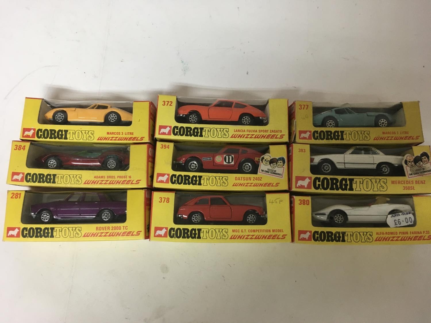 Corgi toys, boxed Diecast vehicles, Whizzwheels. Including #377 Marcos 3 litre x2, #384 Adams bros probe 16, #281 Rover 2000 TC, #372 Lancia Fulvia sport Zagato, #394 Datsun 240Z, #378 MGC GT competition model, #393 Mercedes Benz 350SL and #380 Alfa Romeo pinin Farina P33, boxed