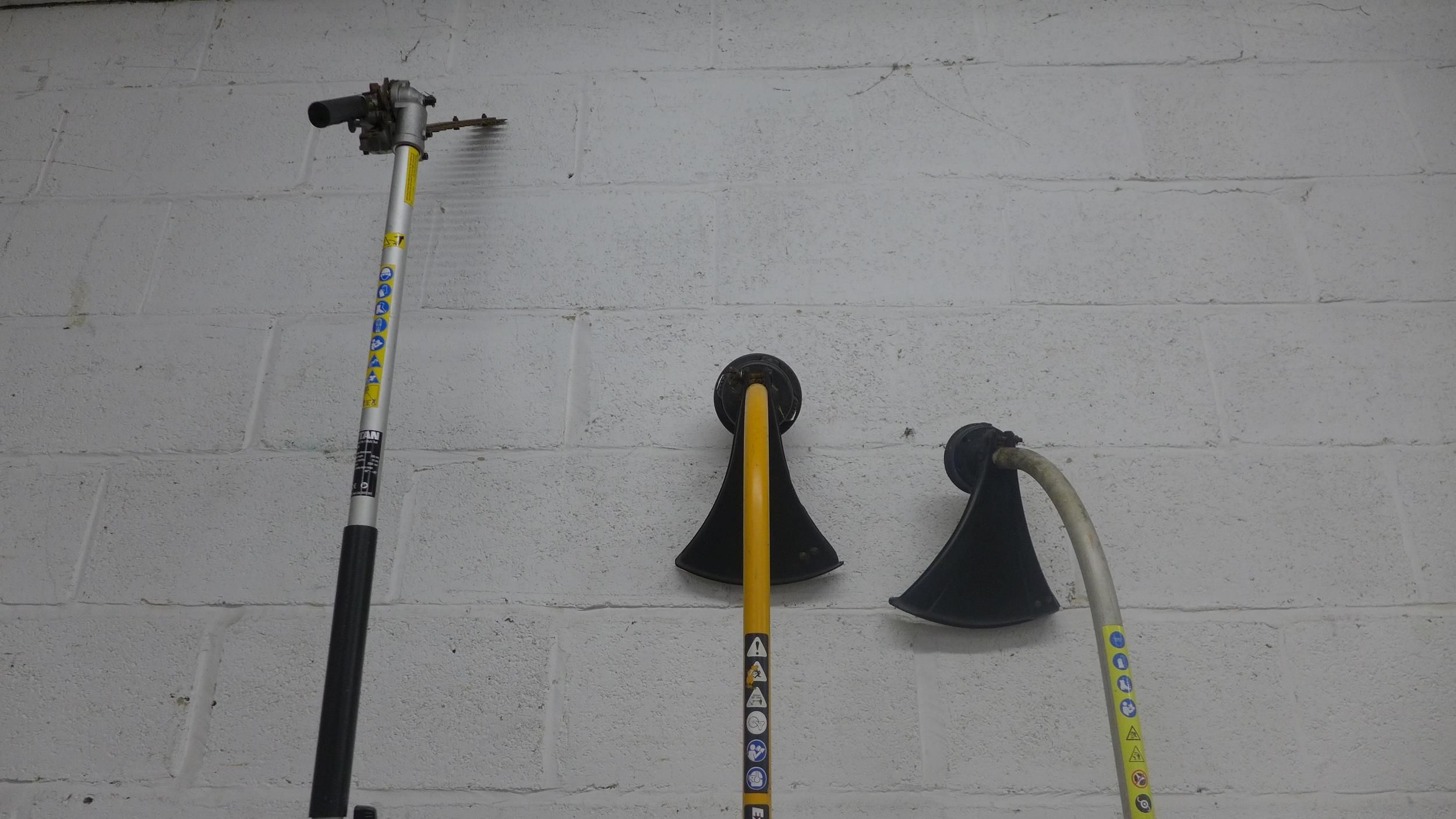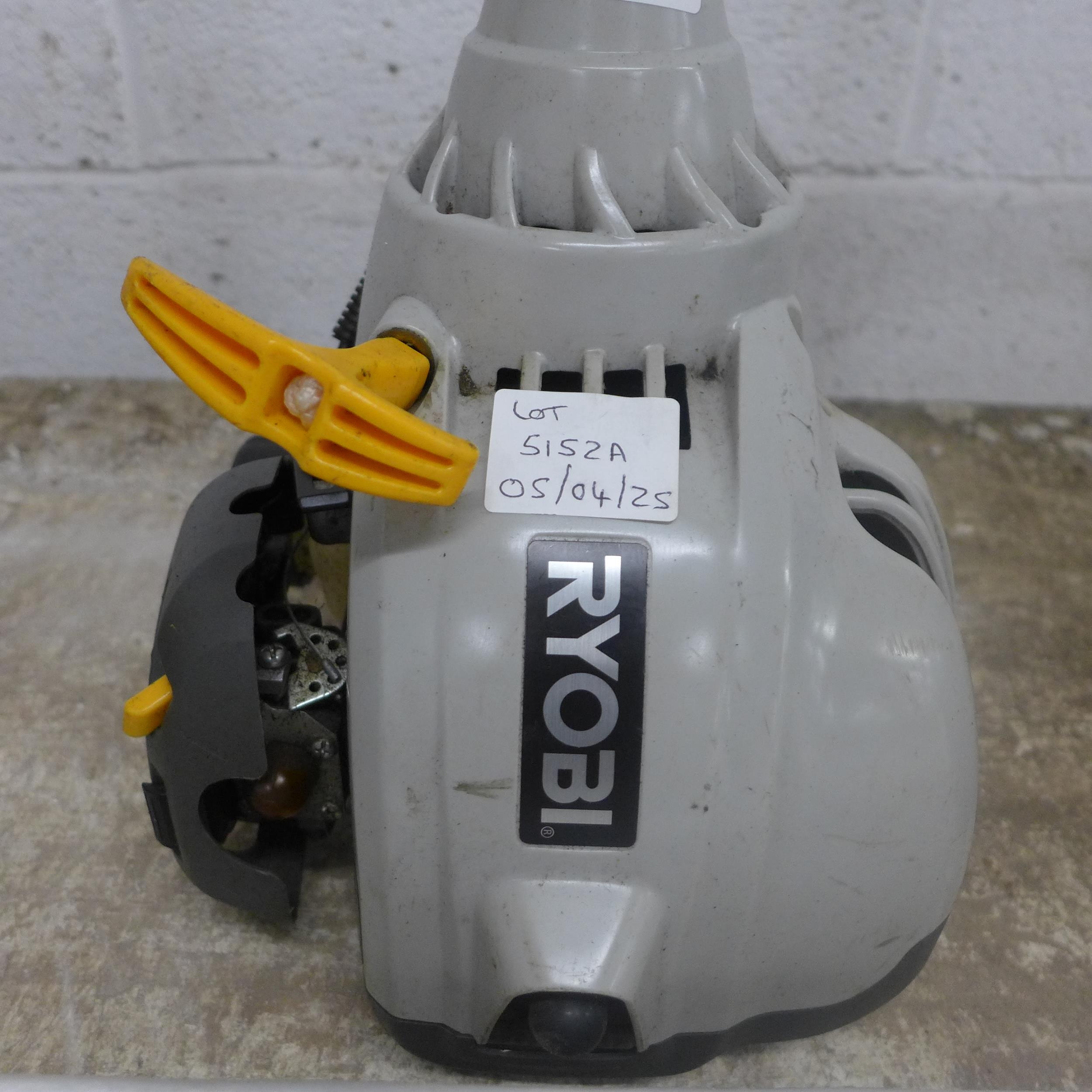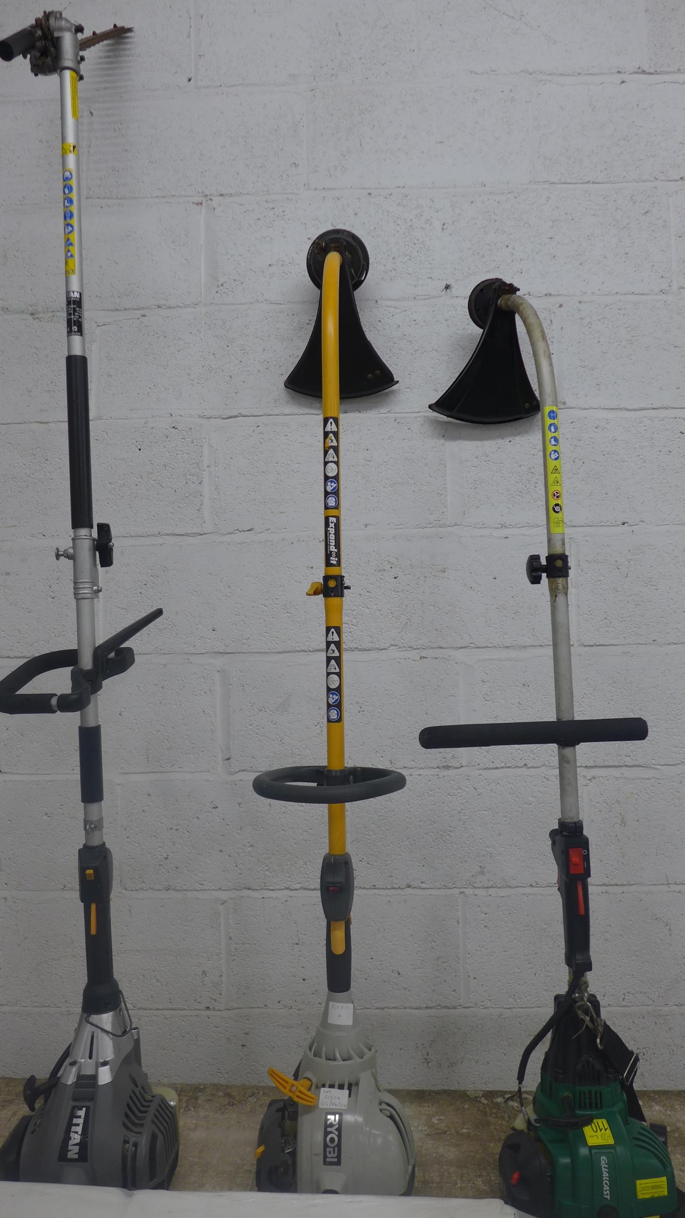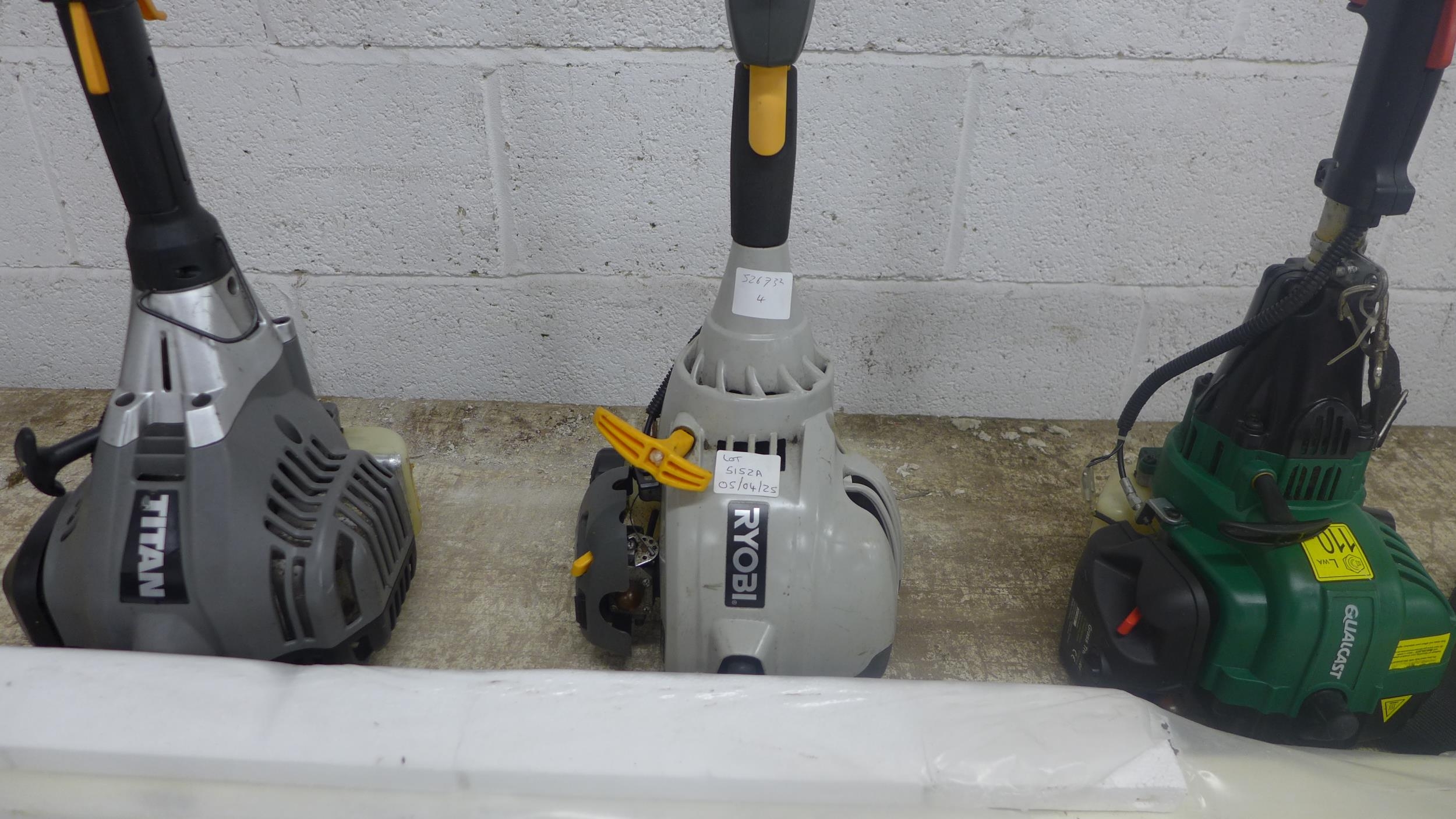 Three petrol garden tools including Qualcast CDB30A 29.9cc grass strimmer, a Ryobi CS30 strimmer and a Titan TTL488GDO long reach hedge trimmer *This lot is a police repossession
