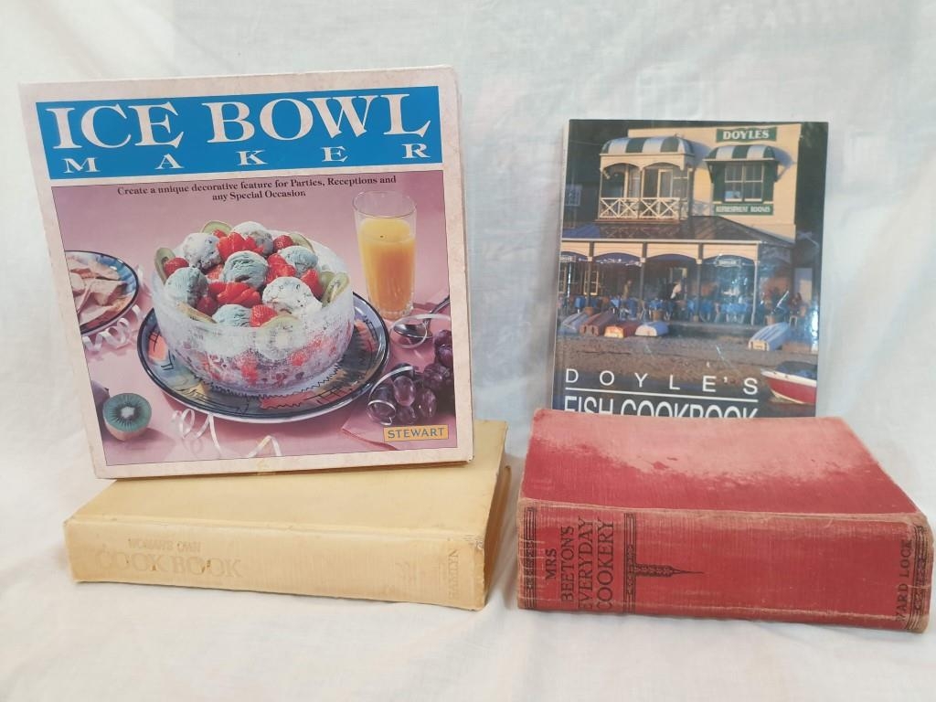 Doyle's Fish Cookbook Signed by Alice & jack Doyle, Vintage Women's Own Cookery Book, Mrs Beetons Everyday Cookbook and Boxed "Ice Bowl" Maker with Instruction (4)