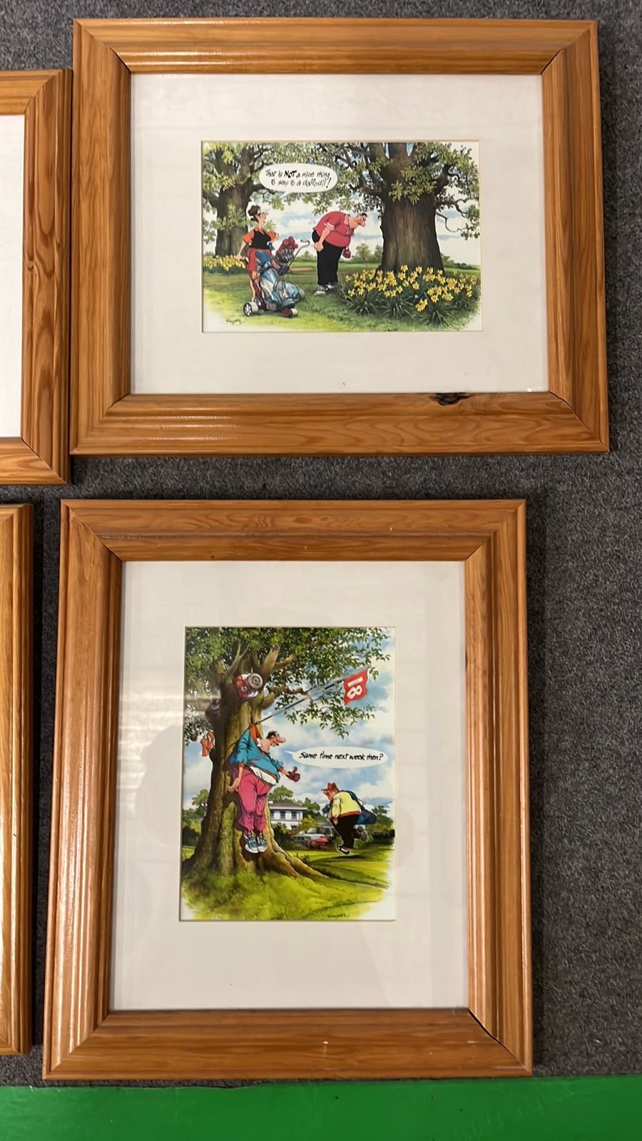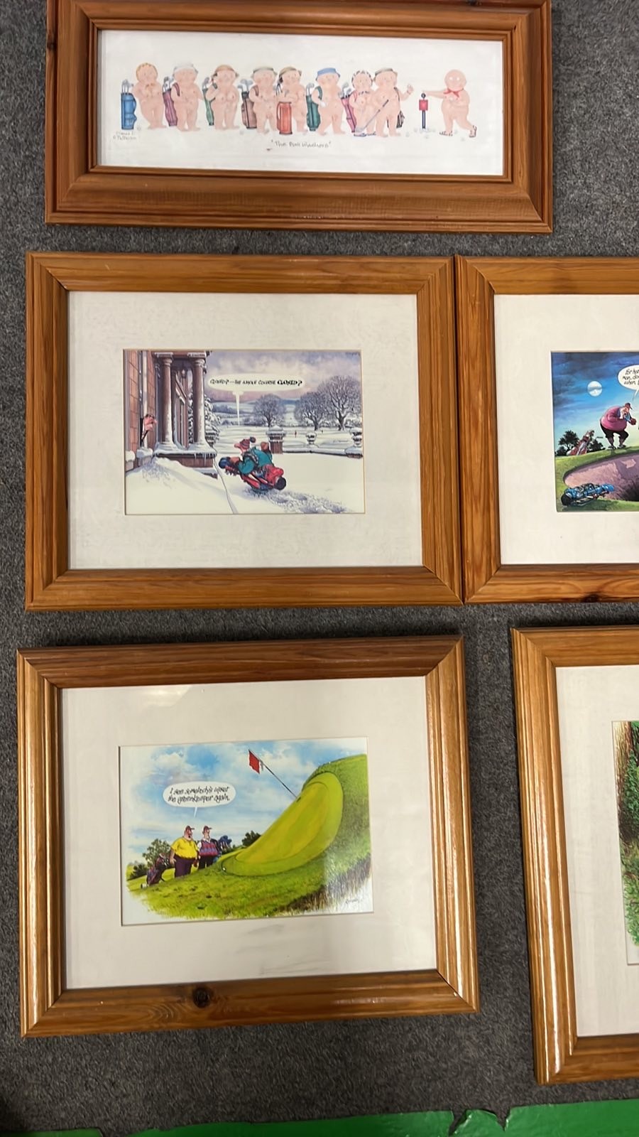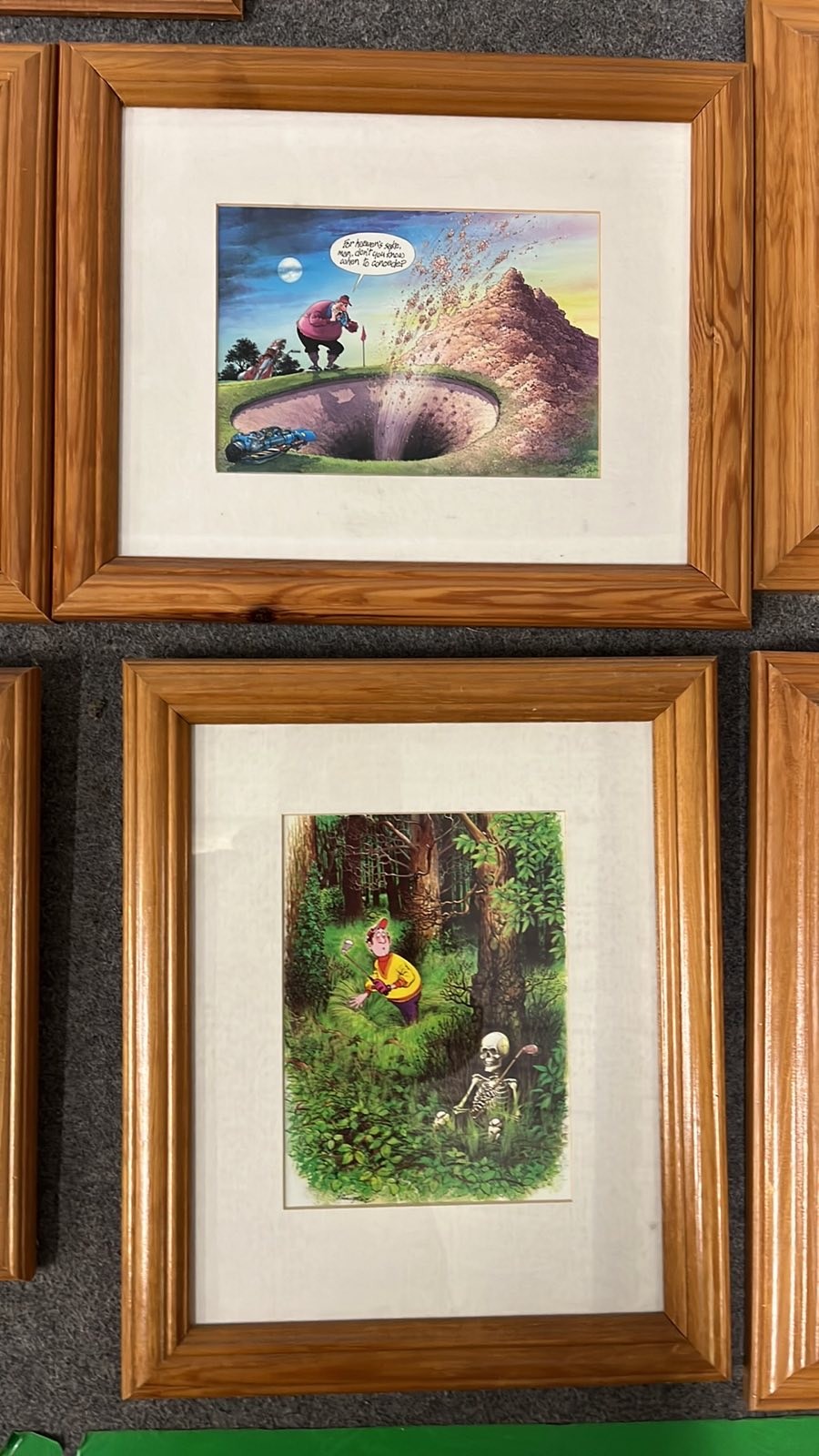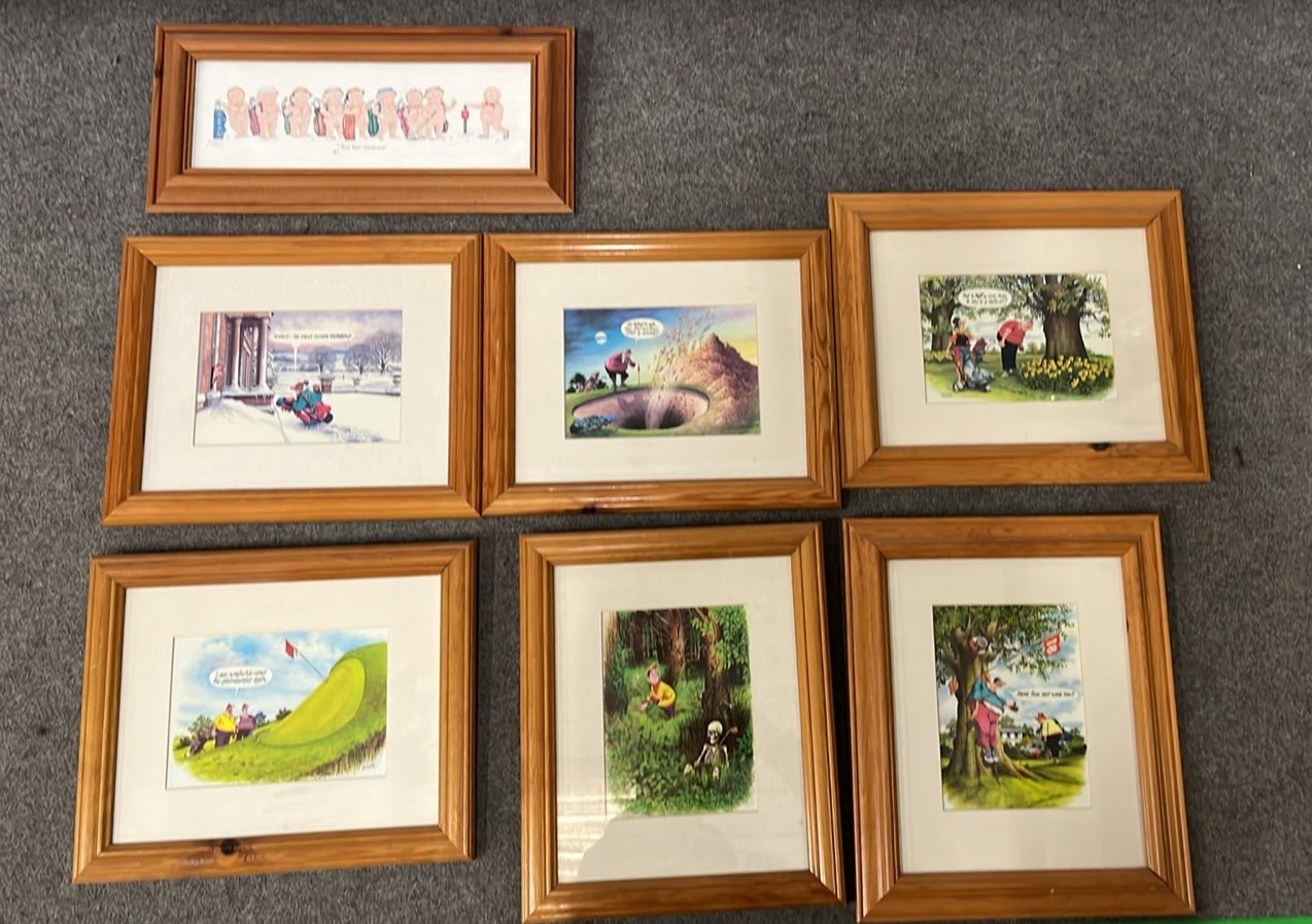 7 X PINE FRAMED HUMOROUS GOLF ART WORKS