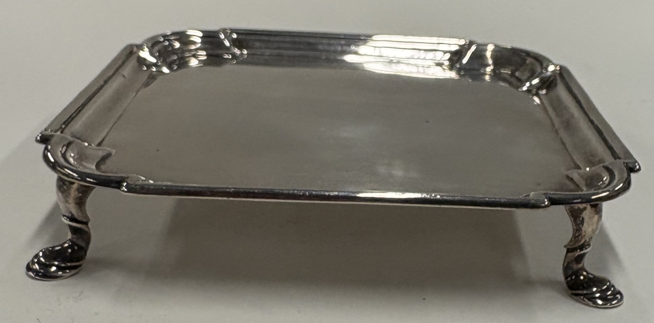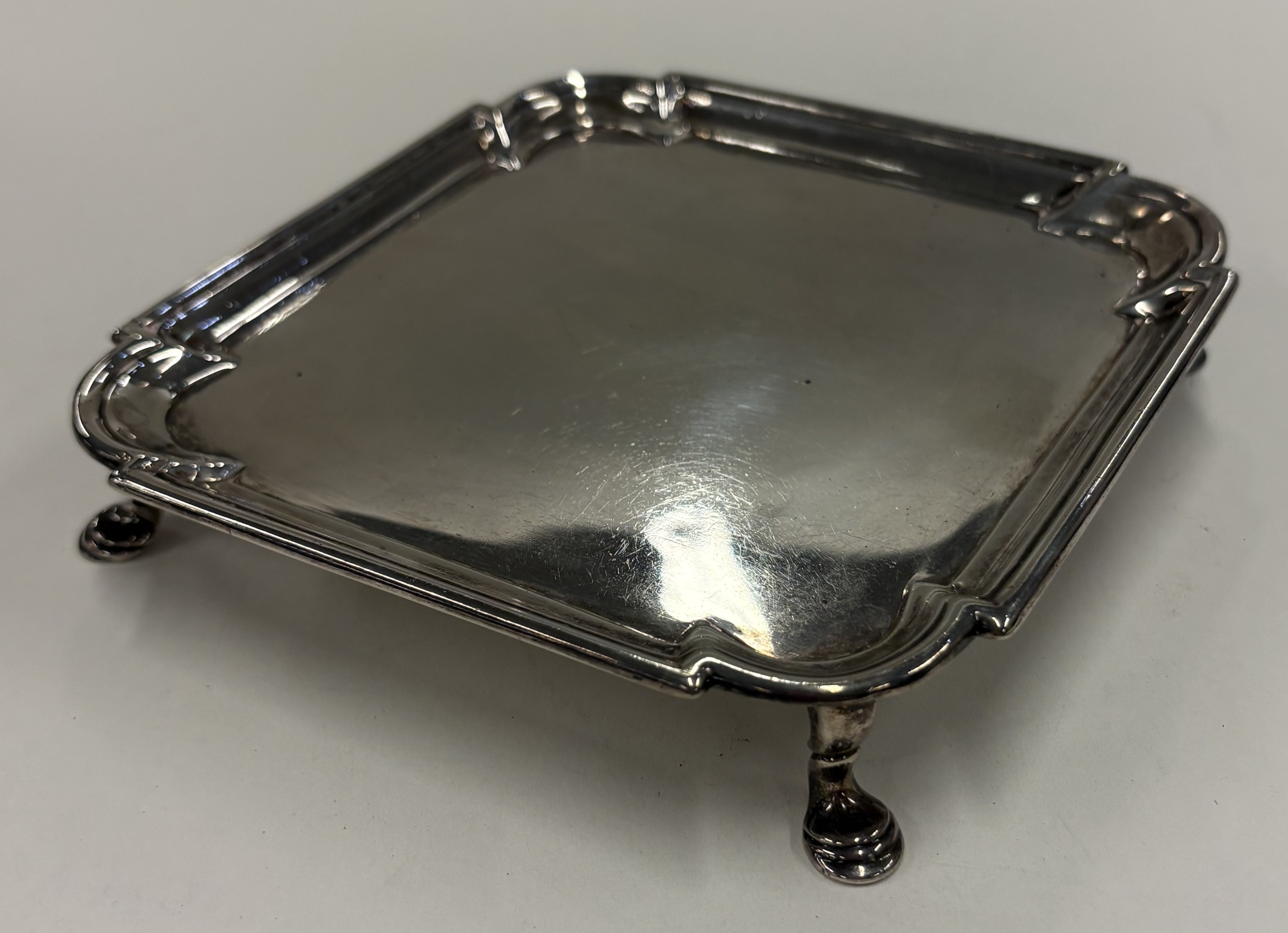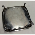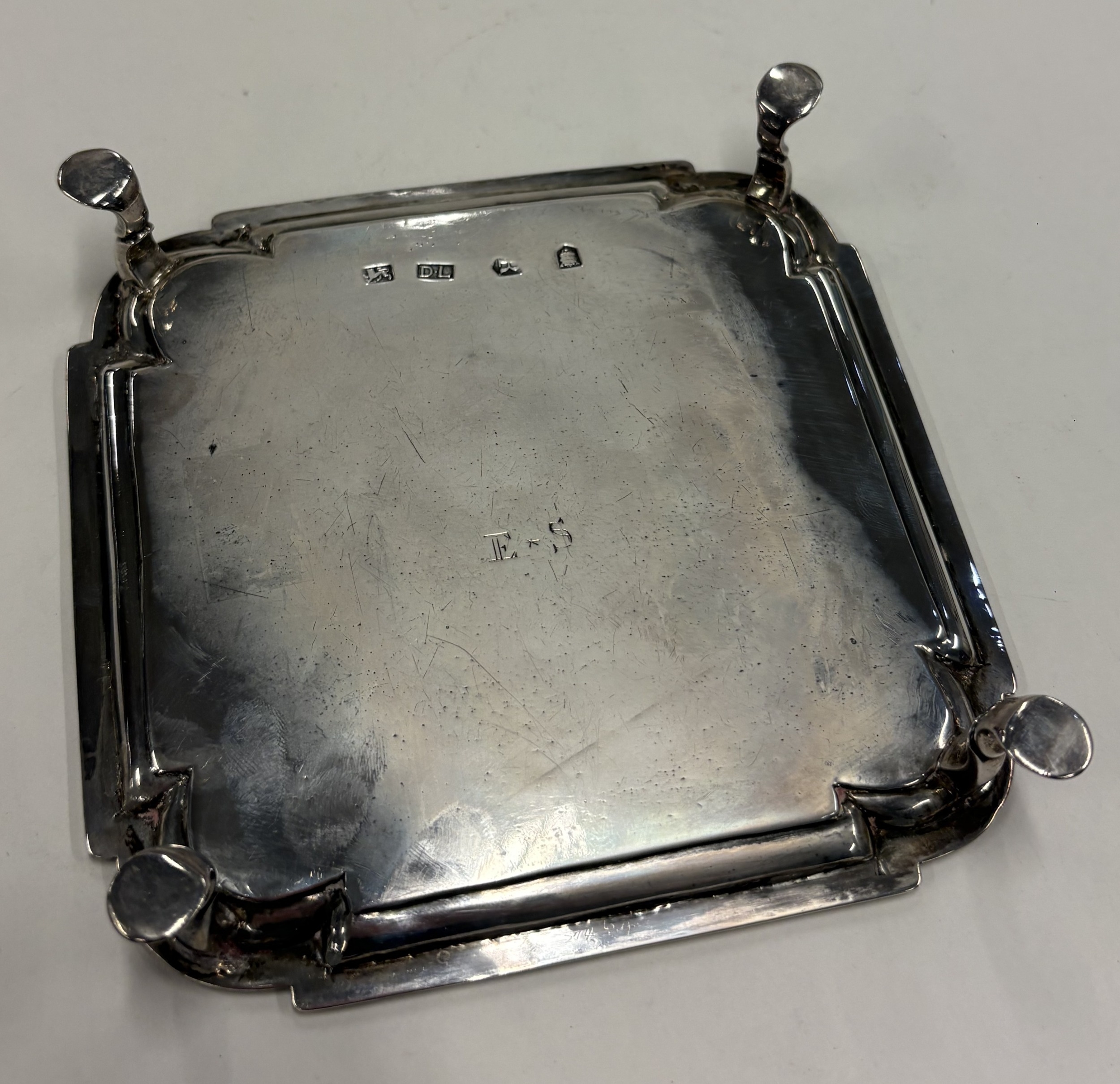 A square 18th Century silver salver on feet. London 1723. By Dennis Langton. Approx. 222 grams. Est. £600 - £800.