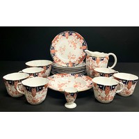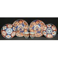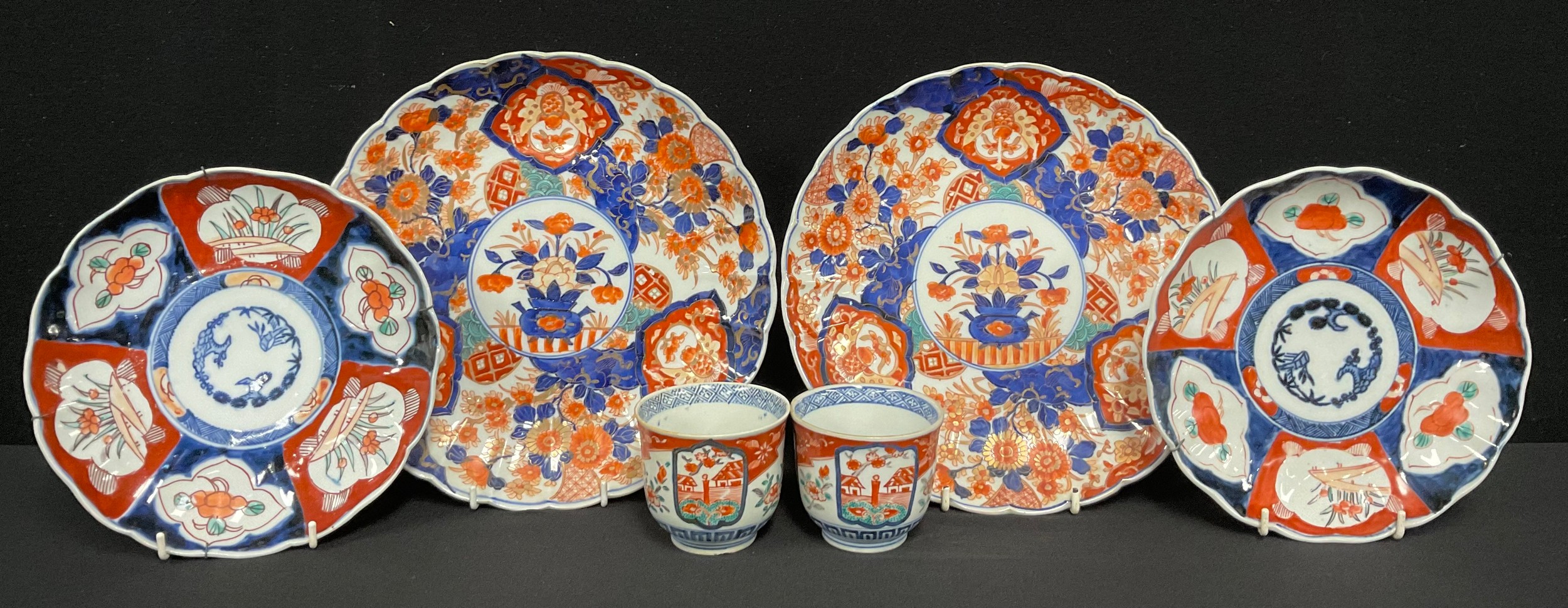 A pair of 19th century Japanese Imari palette shaped circular chargers, 28cm; another pair of smaller Japanese export ware plates, later, 22cm; a pair of similar Japanese beakers, each with character marks in blue, 7.5cm (6)