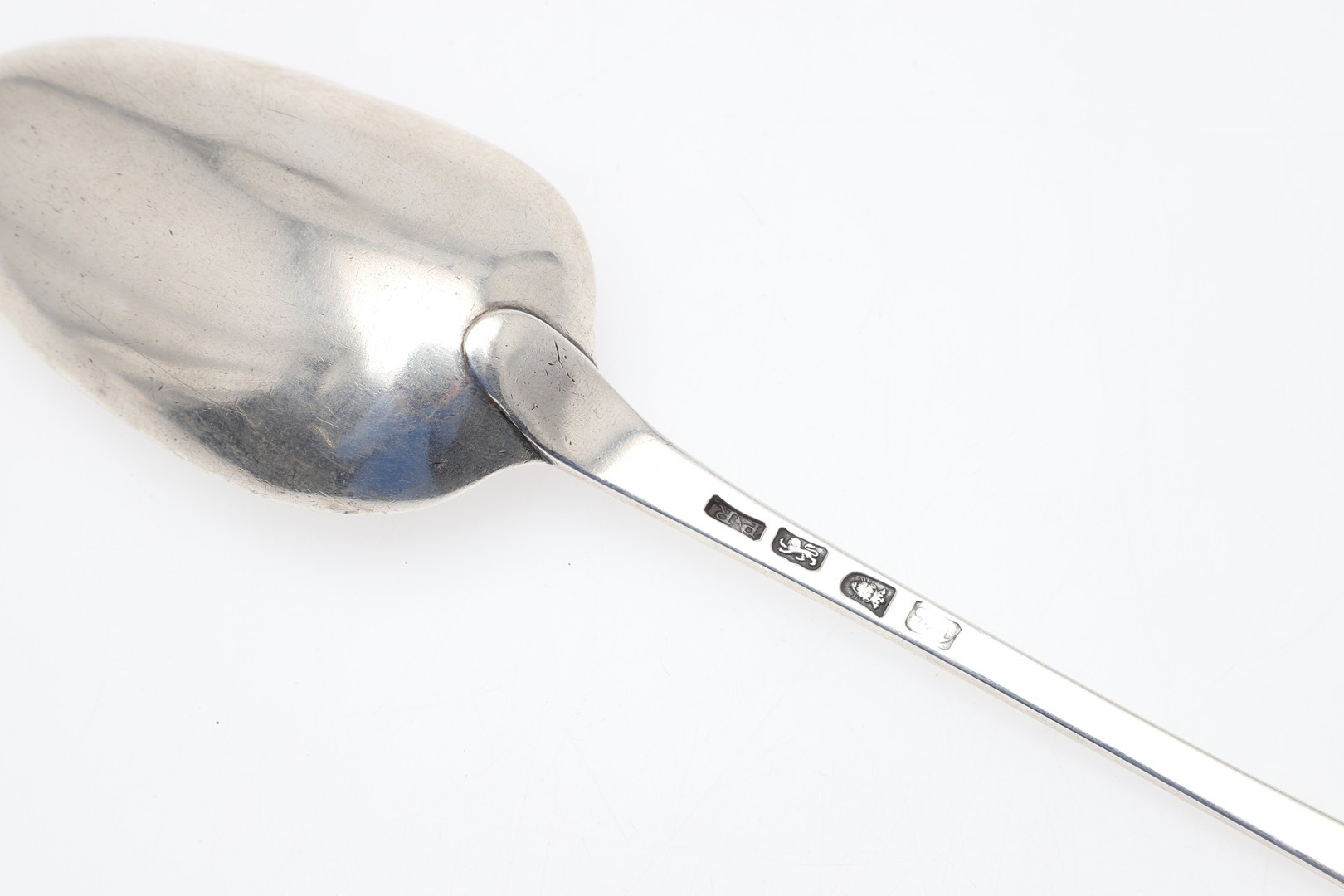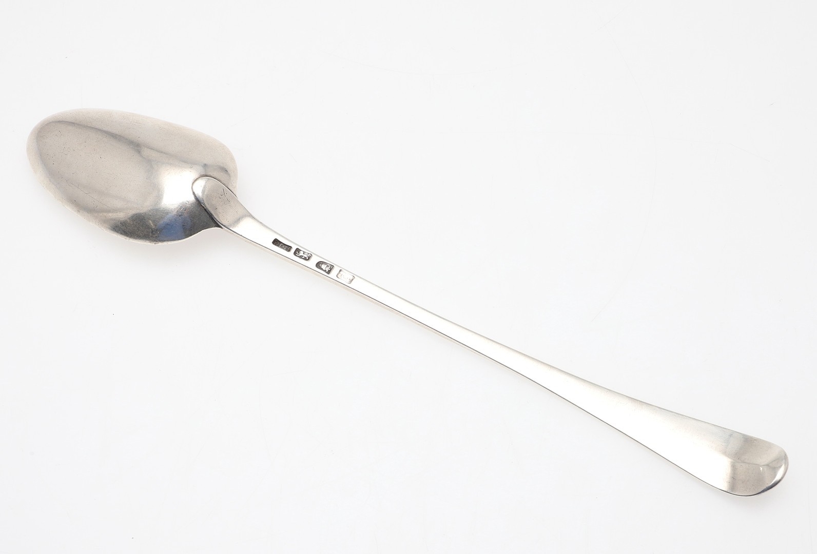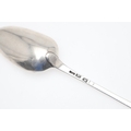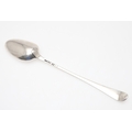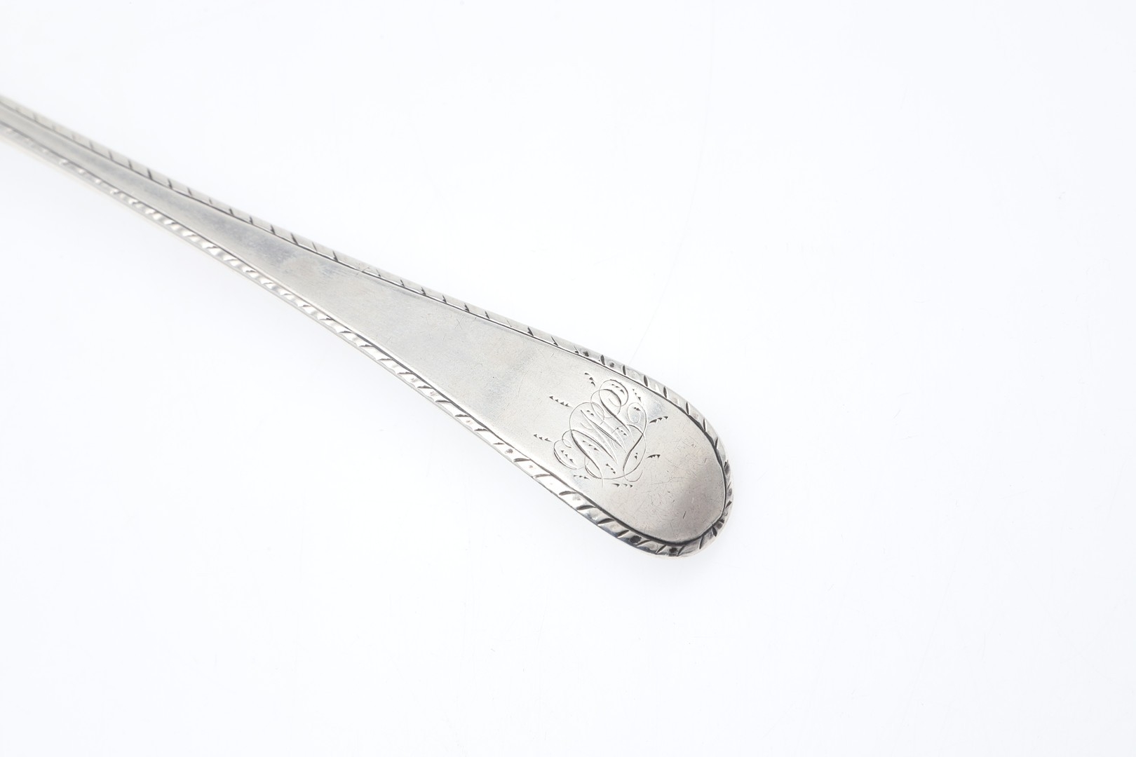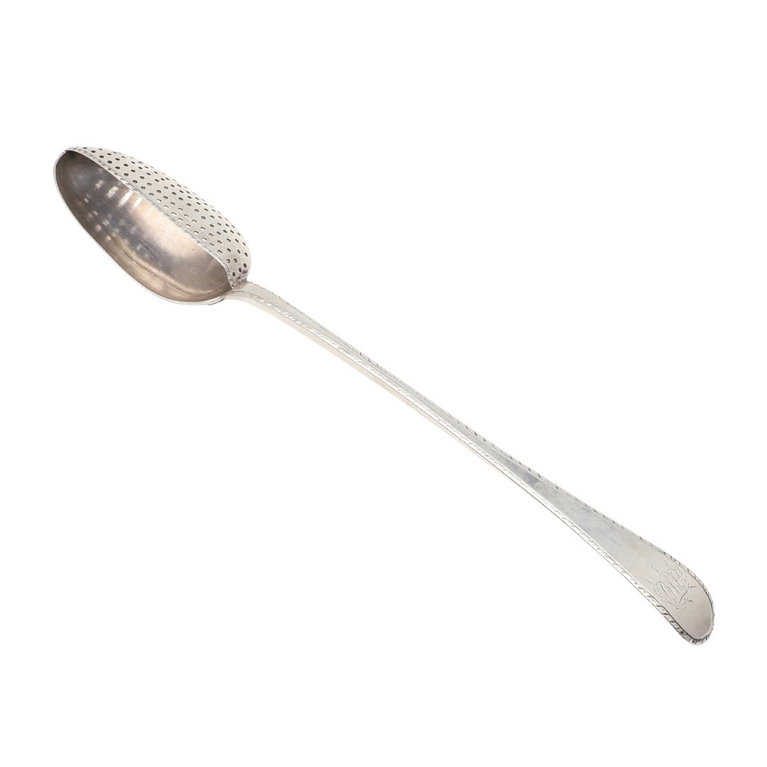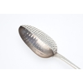 A GEORGE III SILVER OLD ENGLISH FEATHER EDGE PATTERN STRAINING SPOON. With initials to the handle, hallmarked Philip Roker, London, 1774. Length 29cm, weight 3.5ozt.