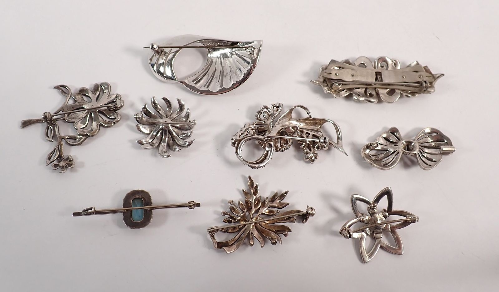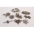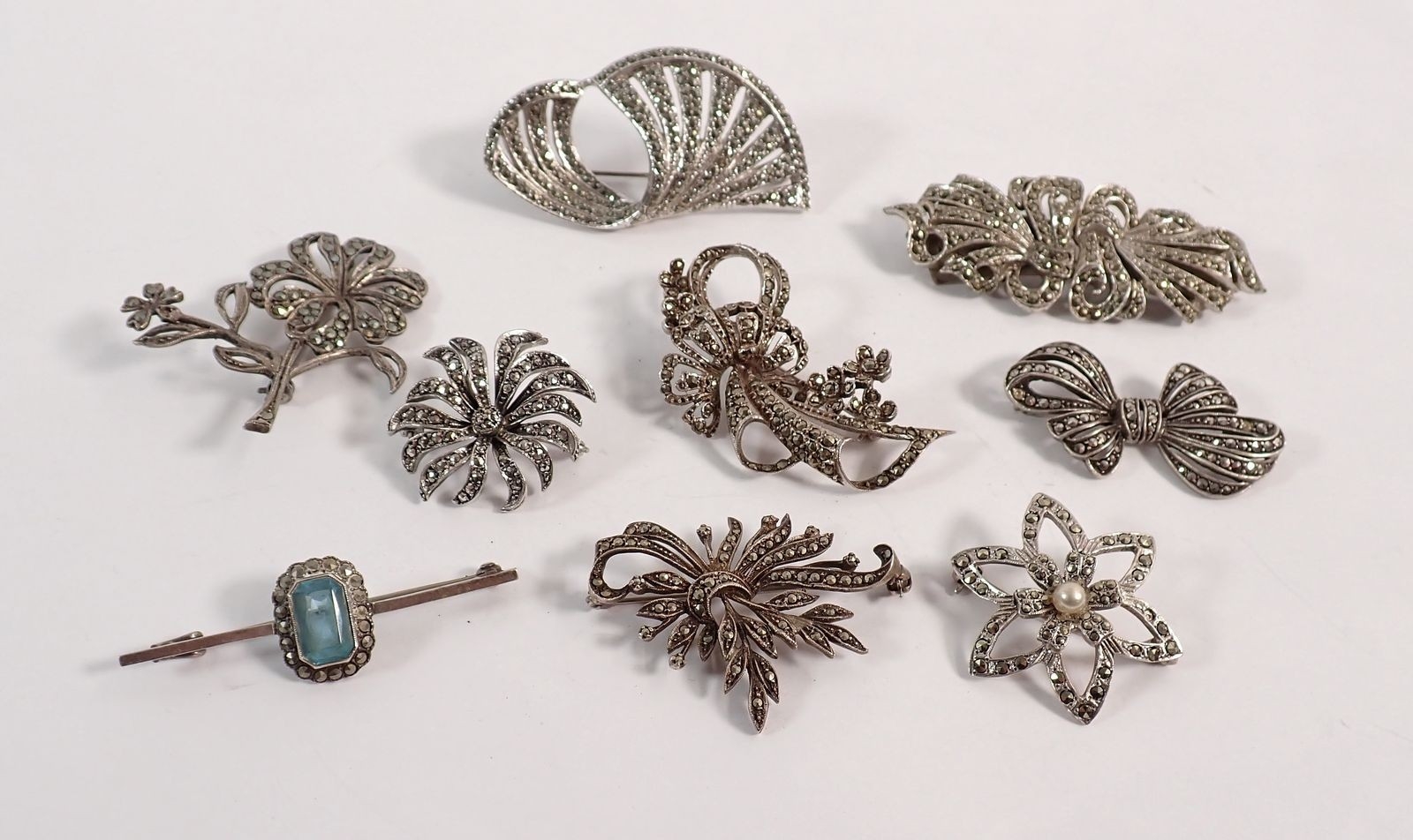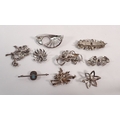 A collection of marcasite brooches including four silver ones