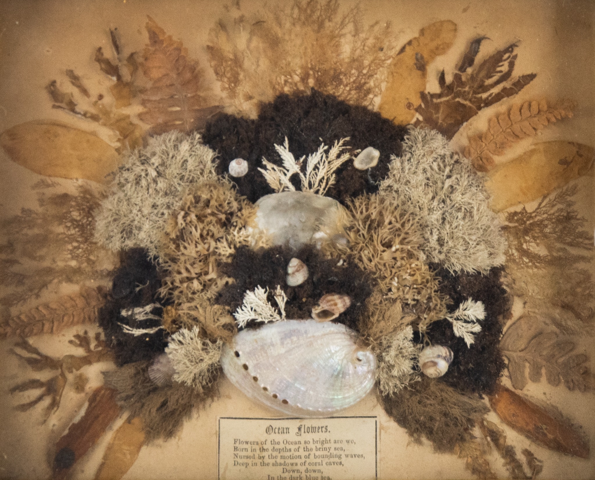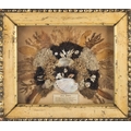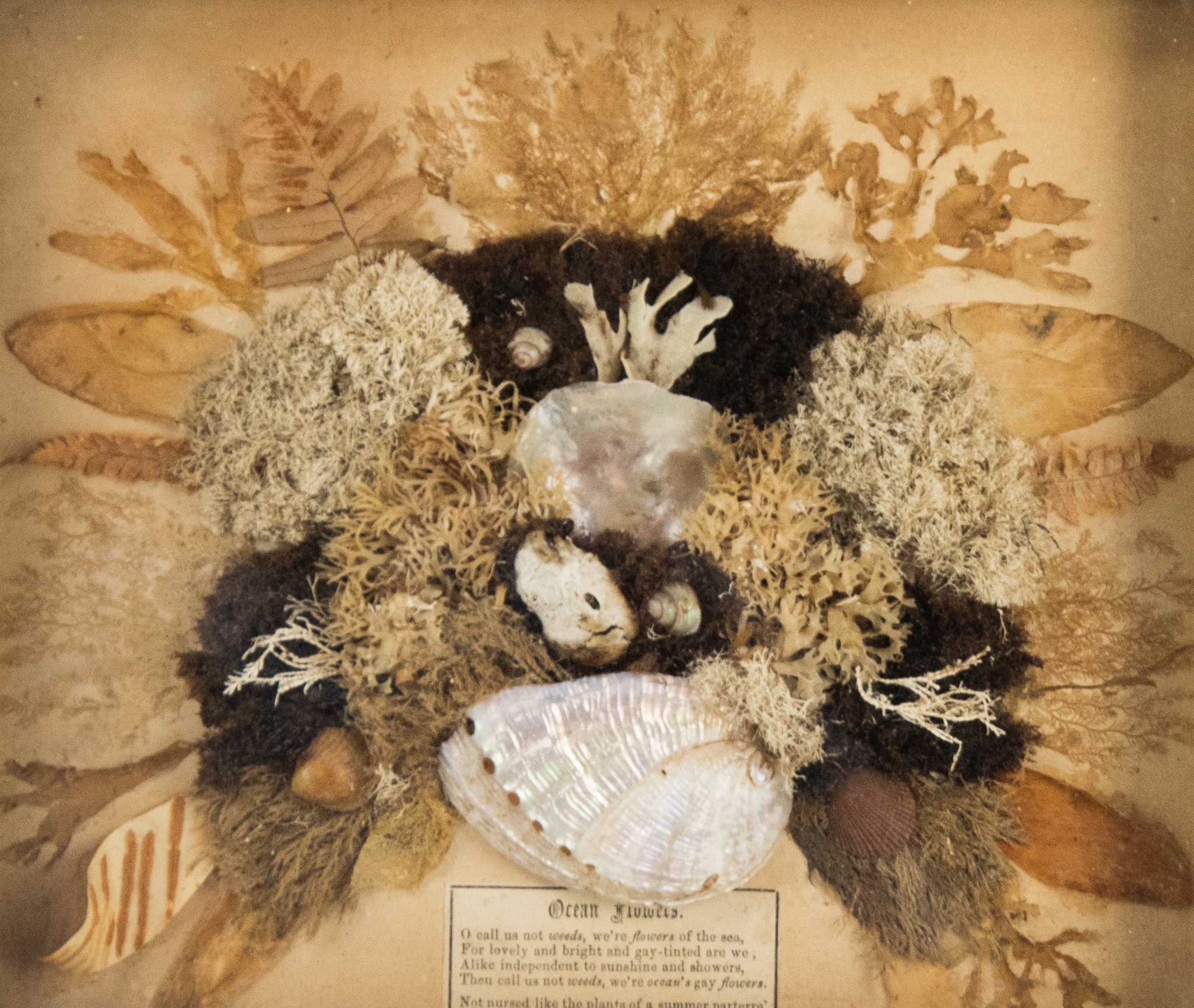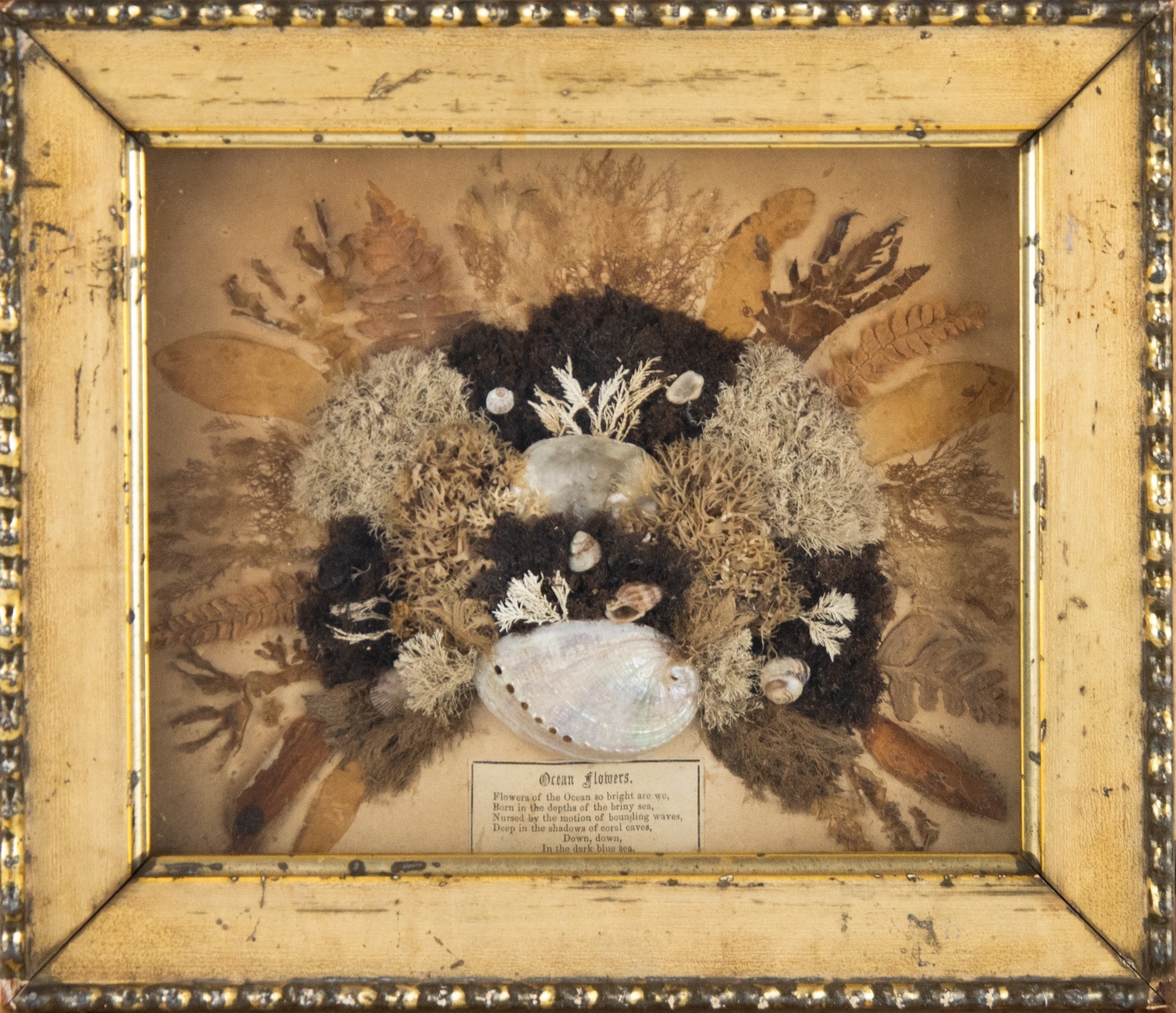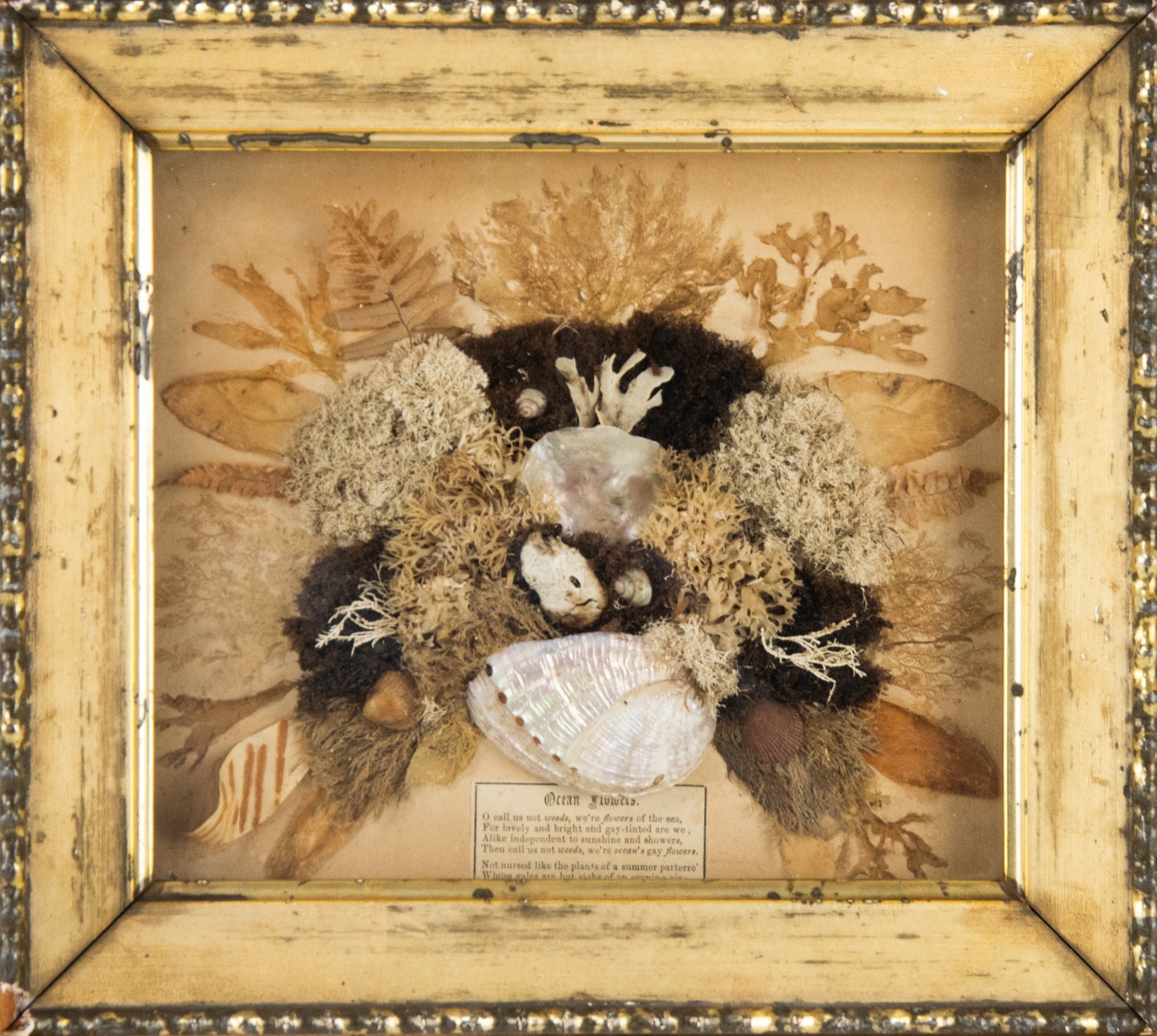 PAIR OF VICTORIAN ‘OCEAN FLOWERS’ SHELL, SEAWEED AND LEAF ARRANGEMENTS, 7” x 8 ½” (17.8cm x 21.6cm), framed and glazed, (2)