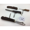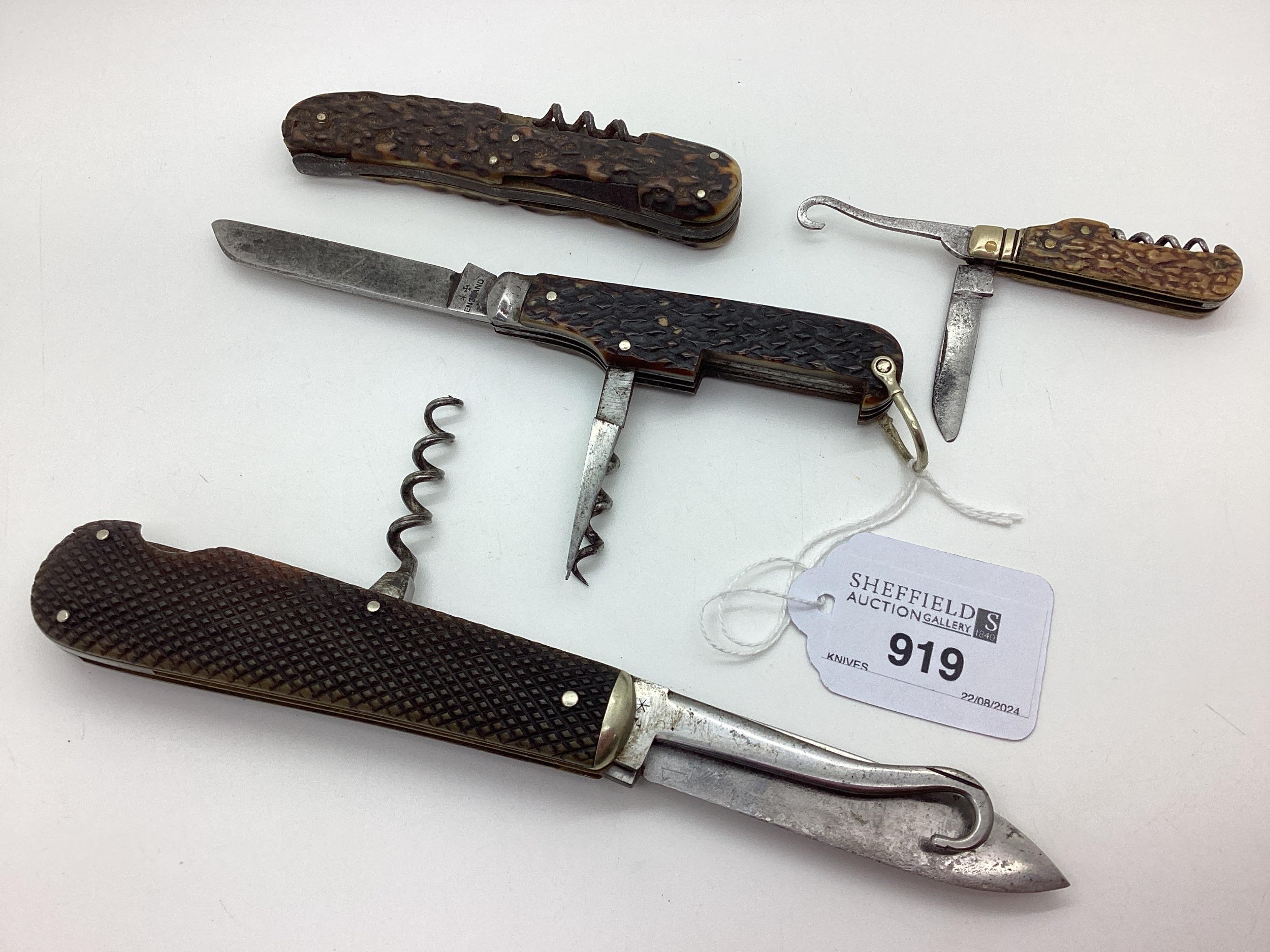 A Single Blade Folding Knife, blade stamped "Joseph Rodgers & Sons", with button hook and corkscrew (11.2cm closed); A Two Blade Folding Pocket Knife, with corcksrew; a multi tool folding pocket knife (rust); a small folding pocket knife (5.2cm closed). (4)