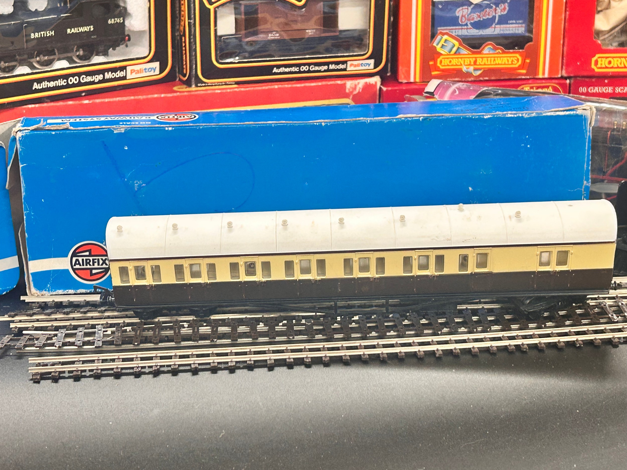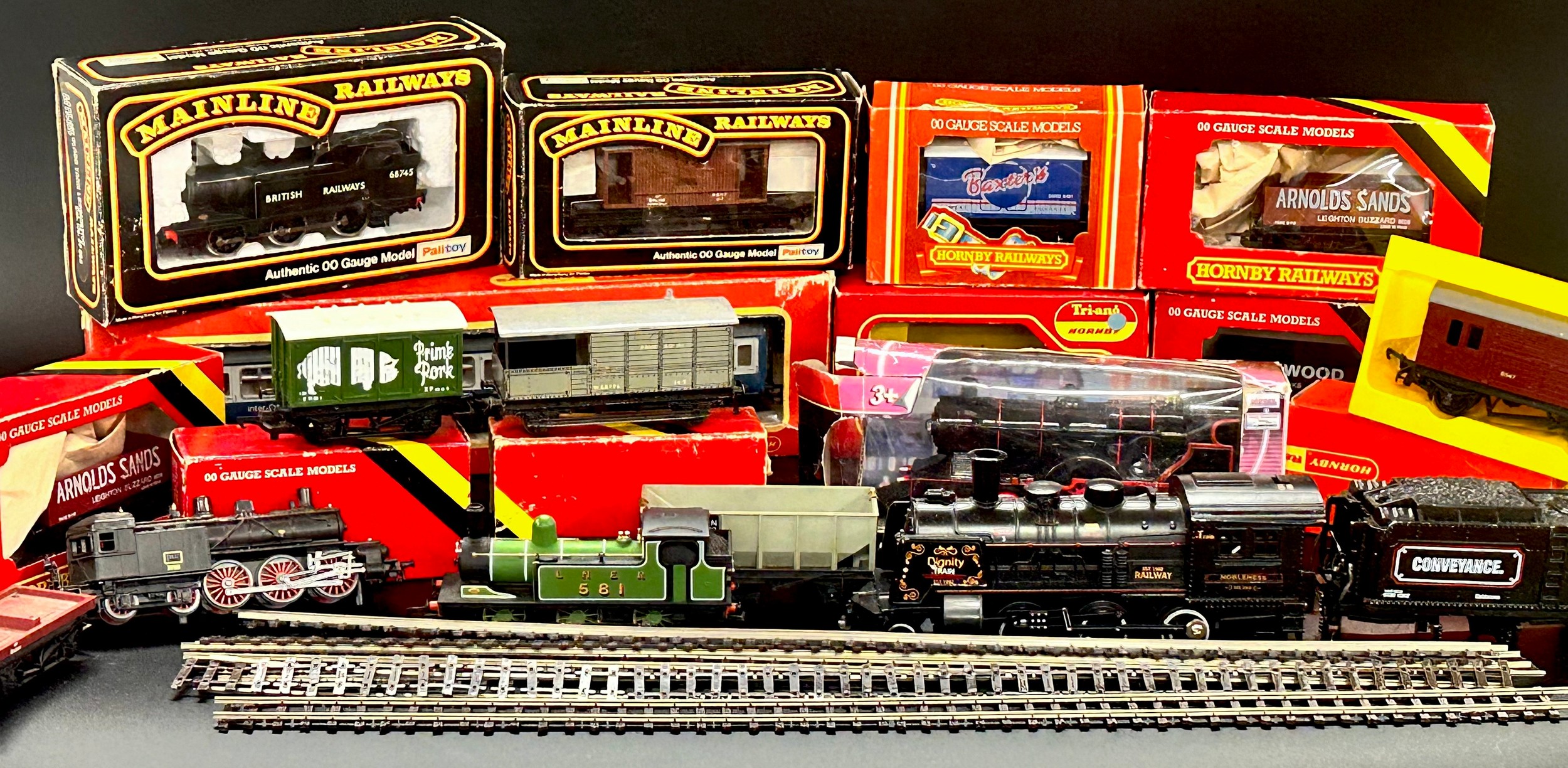 A large collection of model railway, Hornby, Mainline, Airfix, 00 gauge locos, coaches, goods wagon, track, etc.,