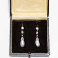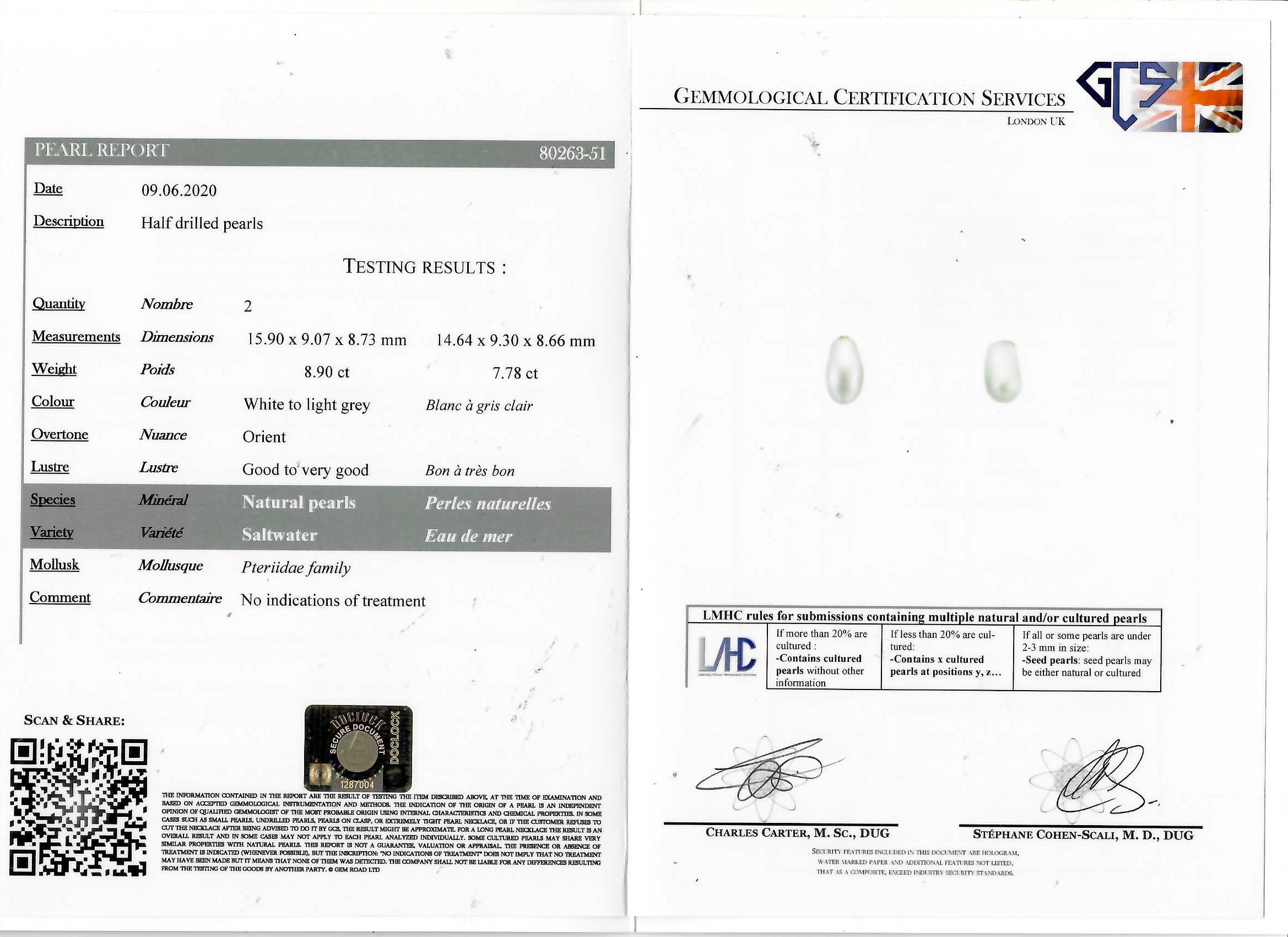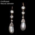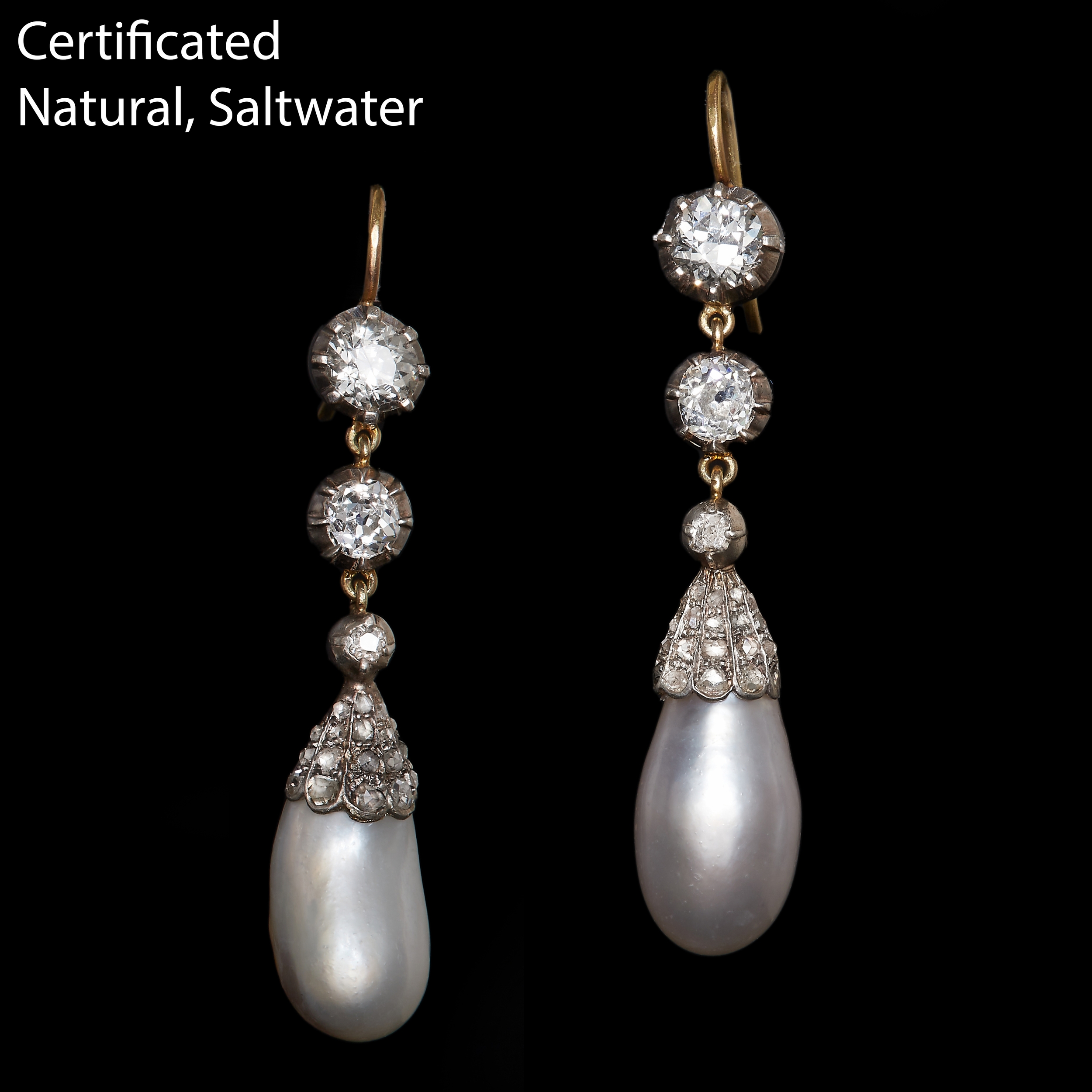 IMPORTANT PAIR OF NATURAL SALTWATER PEARL AND DIAMOND DROP EARRINGS, each with a diamond set top and drop, ending in a natural saltwater pearl. Diamonds totalling approx. 1.90 ct. L. 4.5 cm. 8.5 grams. With a fitted box. Accompanied by GCS London report No. 80263-51 stating that the pearls are 8.90 ct (15.9 x 9.07 x 8.73) and 7.78 ct (14.64 x 9.30 x 8.66), Natural Saltwater.