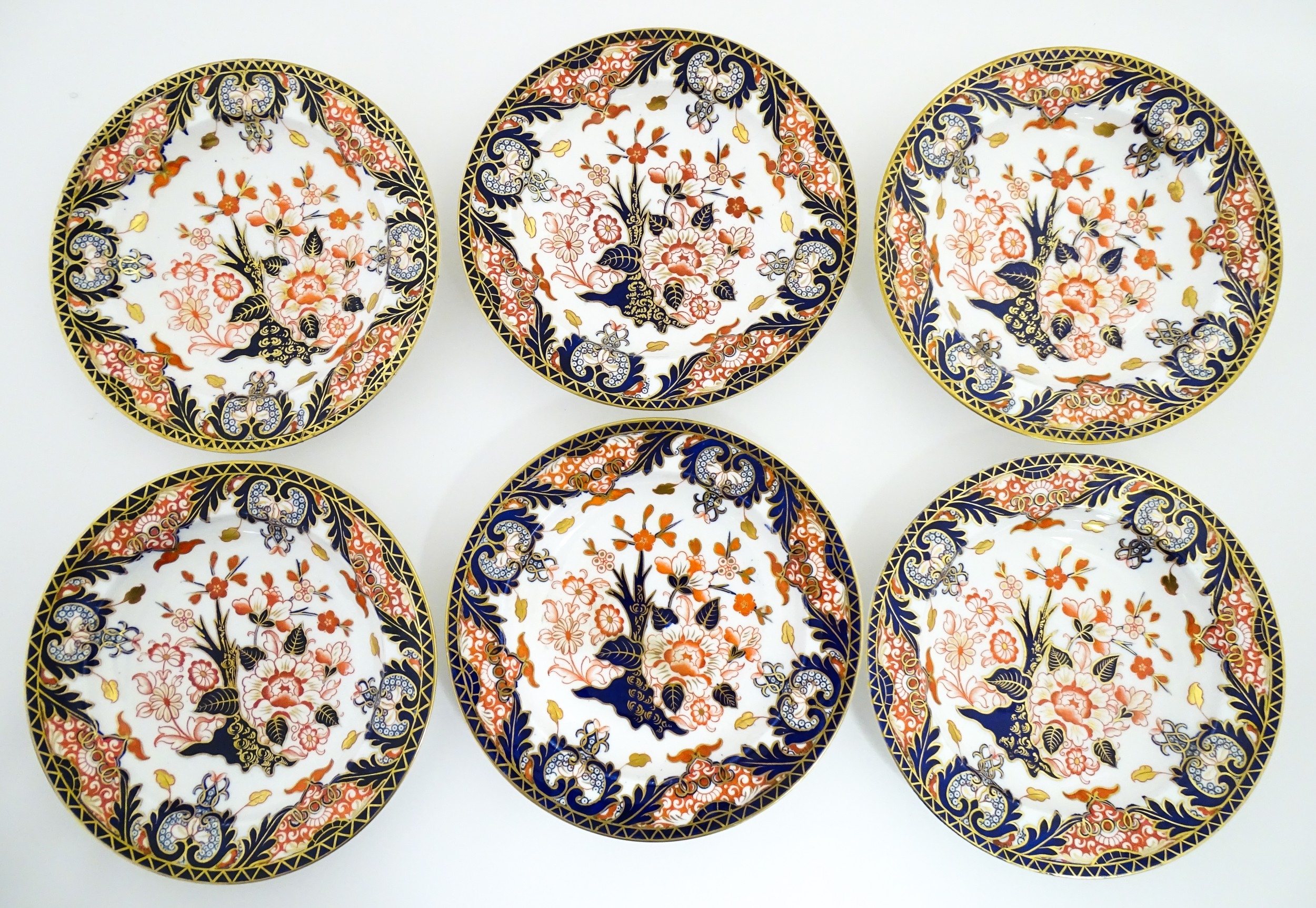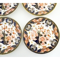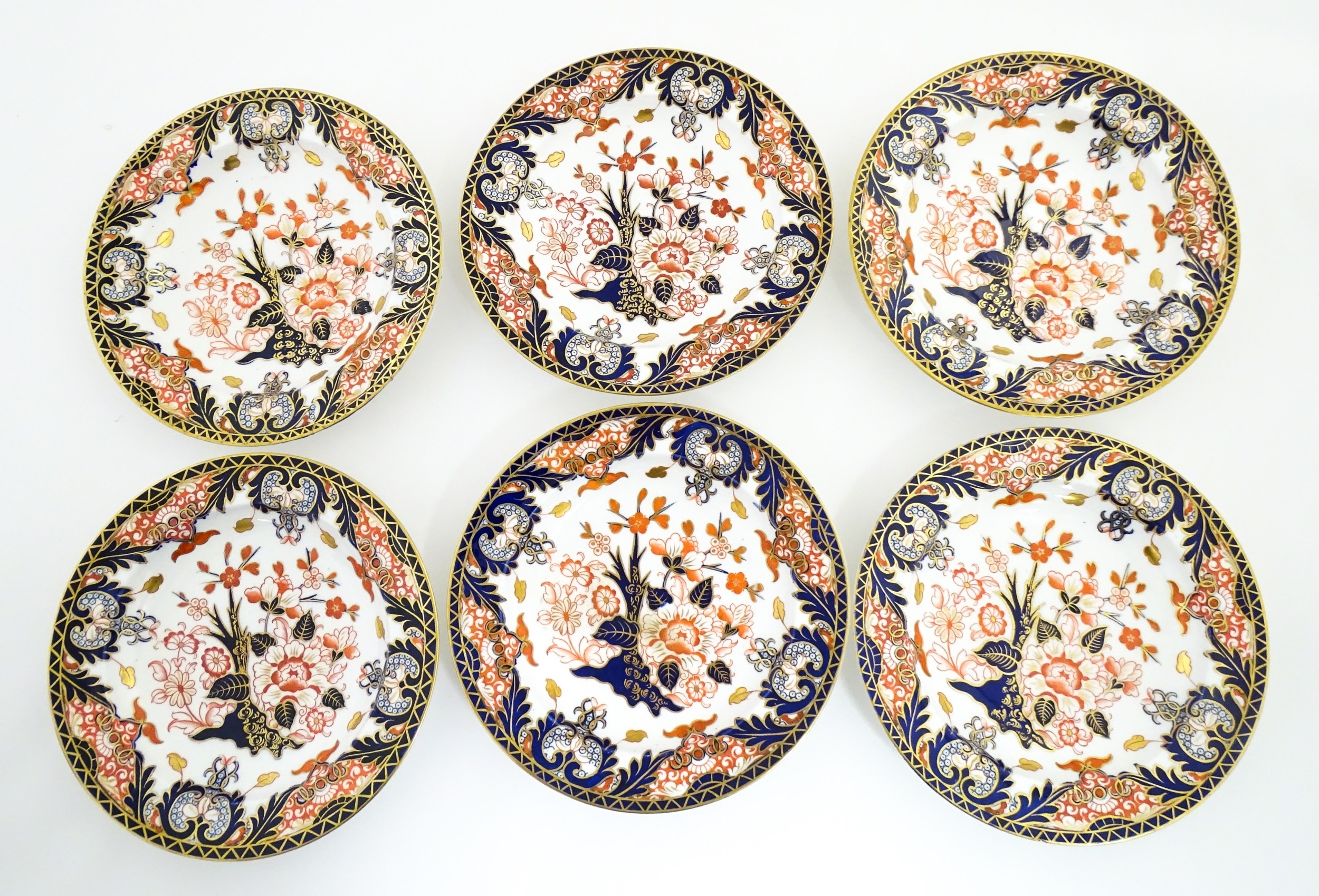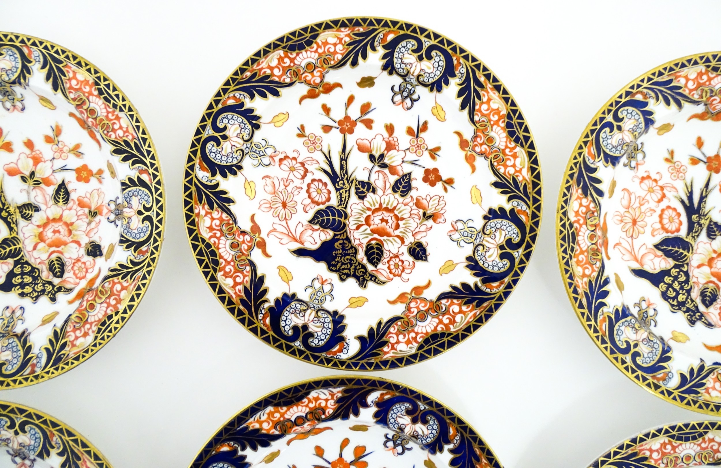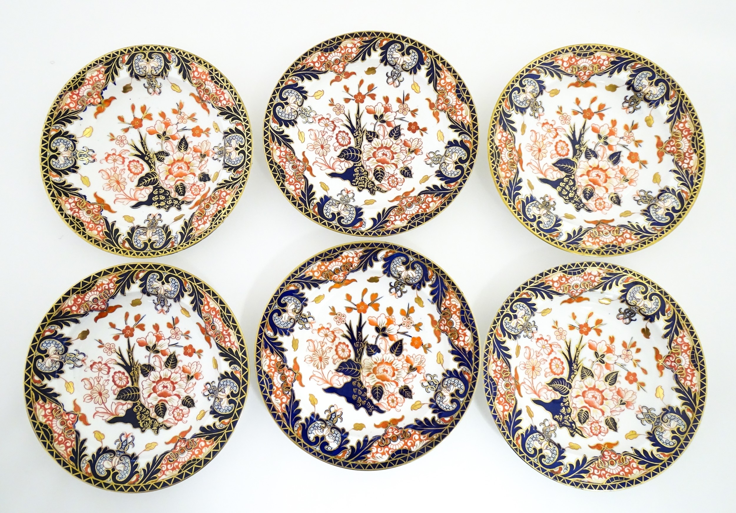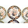 Six Royal Crown Derby dishes decorated in the Imari pattern. Marked under. Approx. 10 1/2" wide (6)