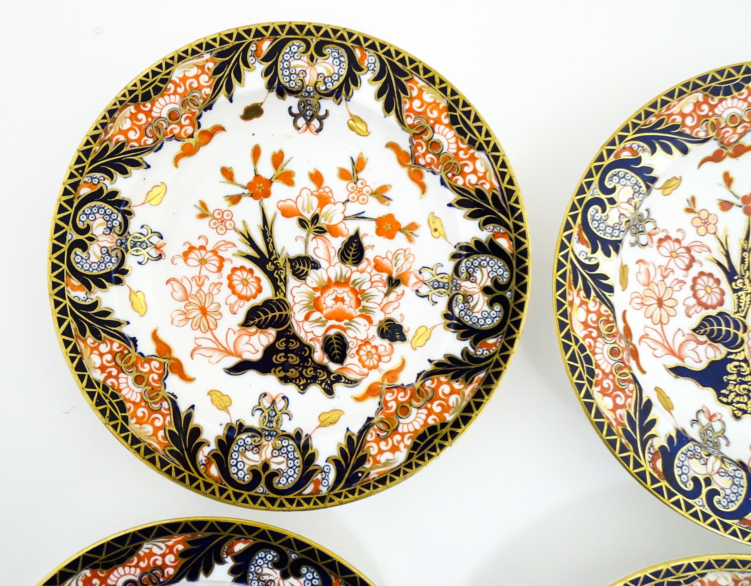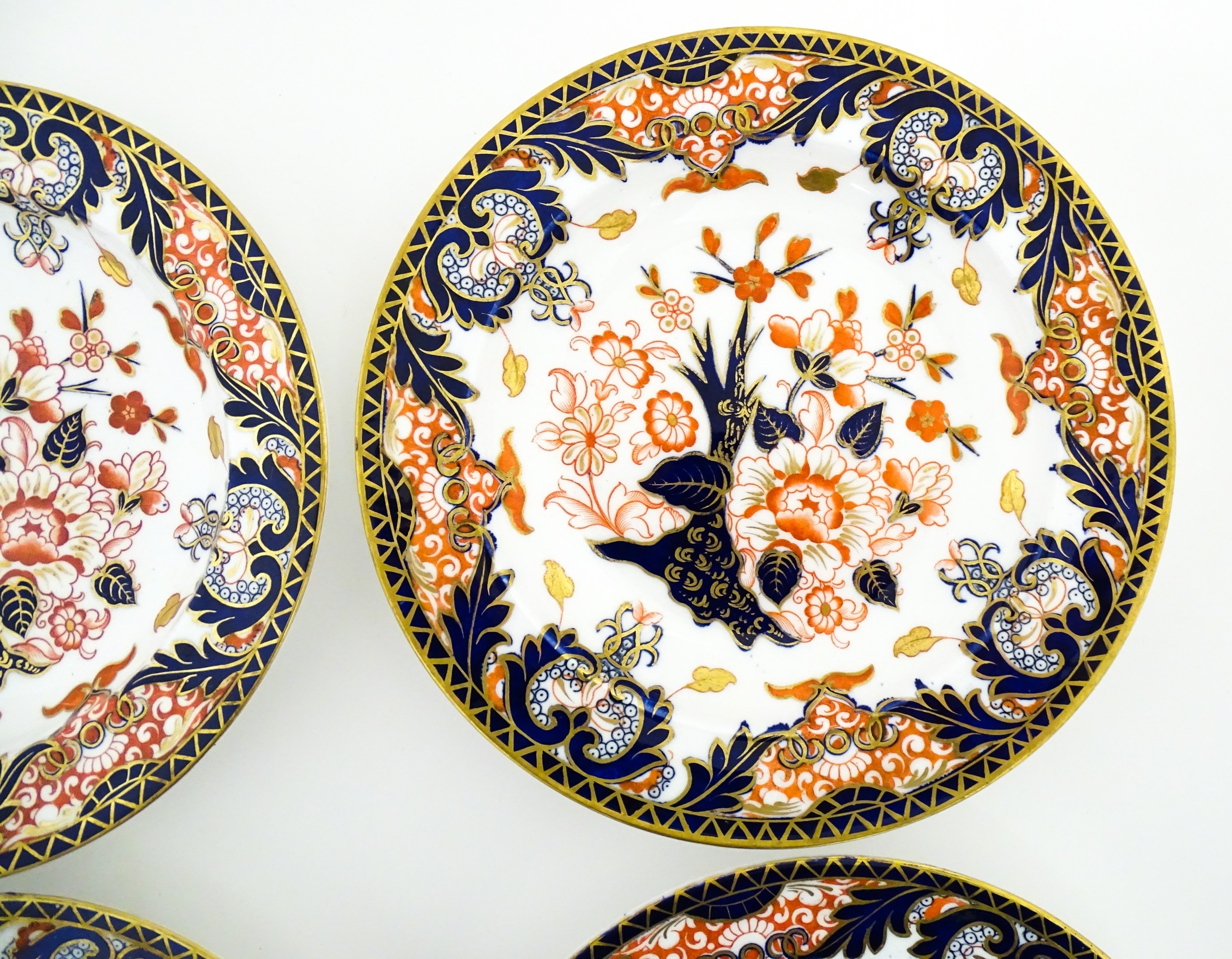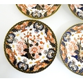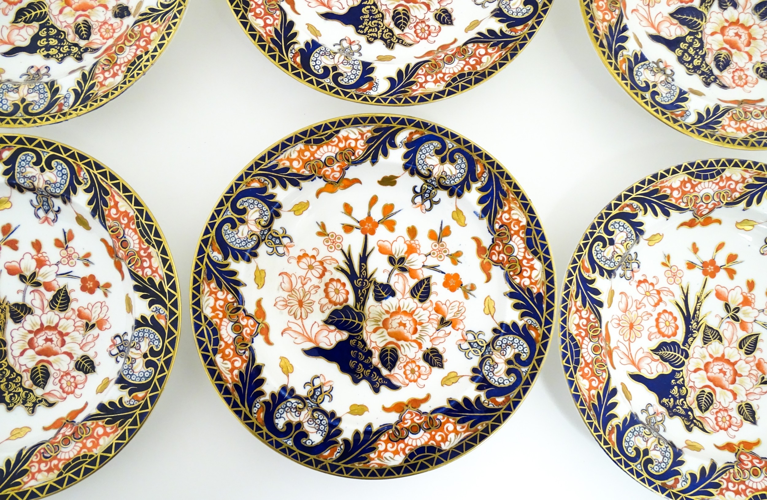 Six Royal Crown Derby dishes decorated in the Imari pattern. Marked under. Approx. 10 1/2" wide (6)