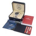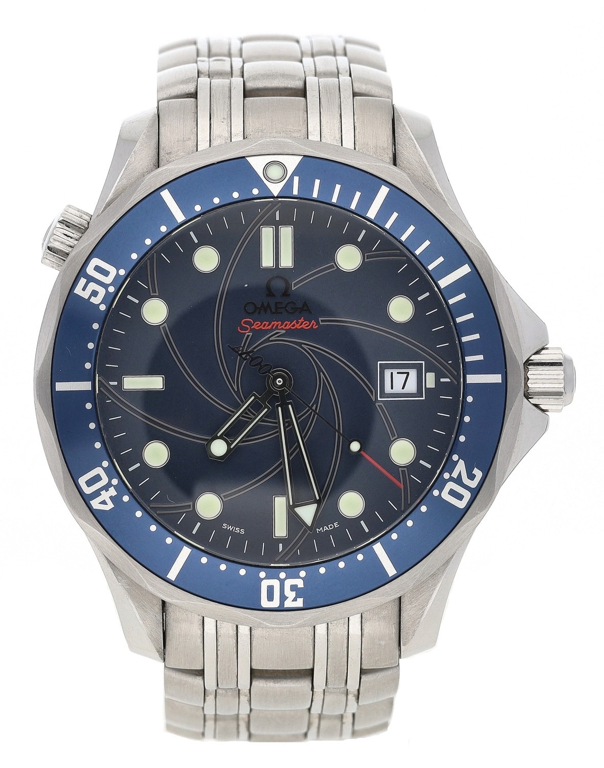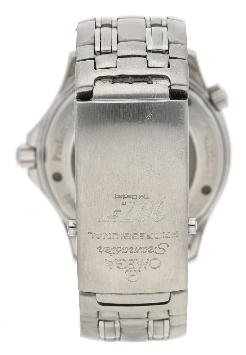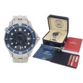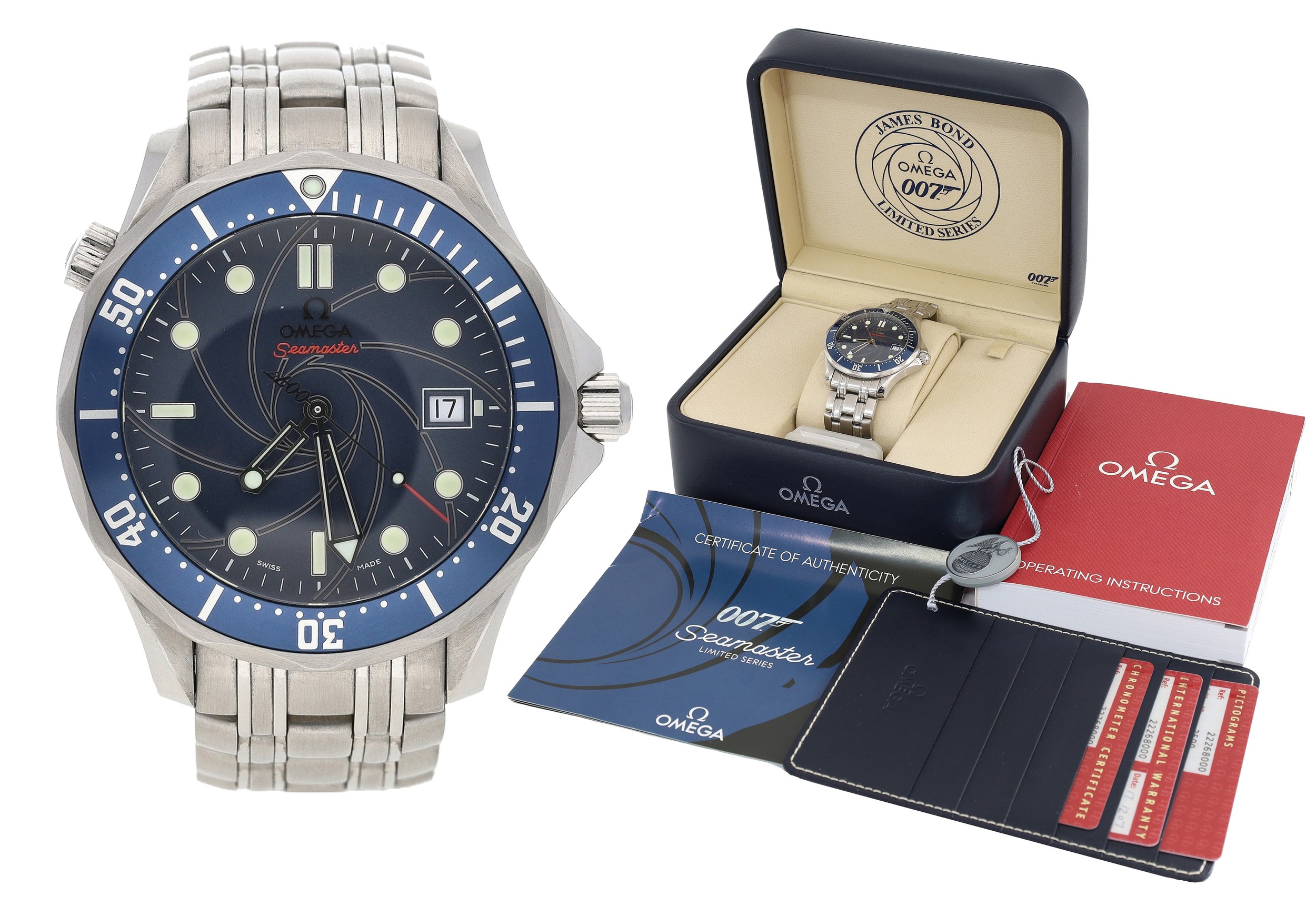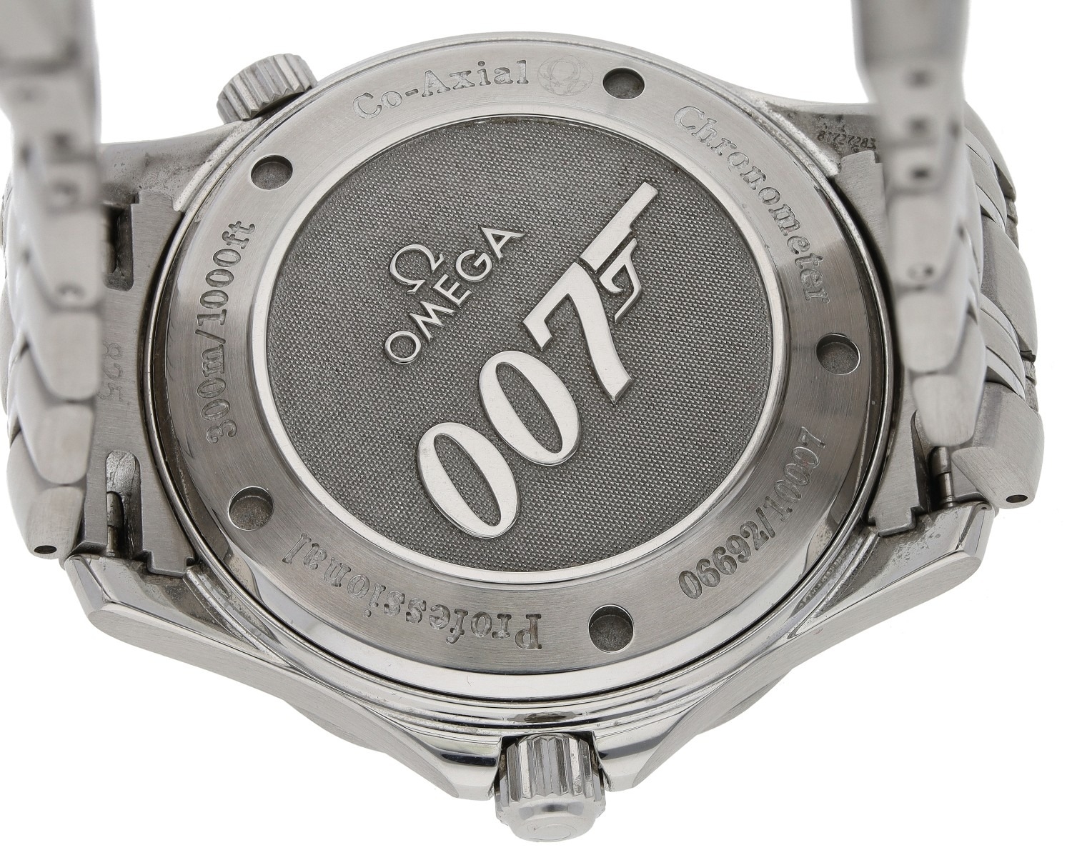 ** Omega James Bond 007 Limited Series box with outer cover, card sleeve, International warranty card dated 17.12.07 and stamped Market Cross Jeweller Middlesborough, chronometer certificate, pictograms card, Omega Seamaster 007 Limited Series certificate of authenticity, operating instructions booklet, tag, two spare links