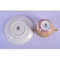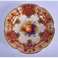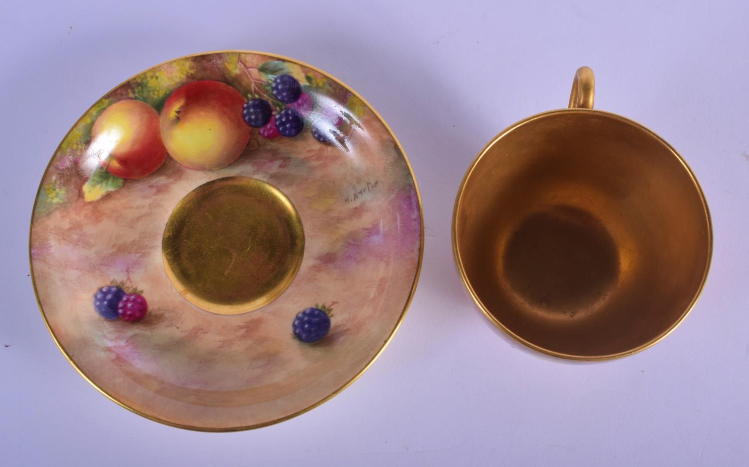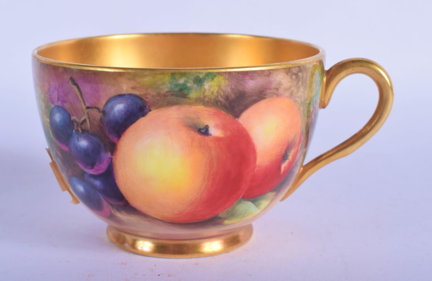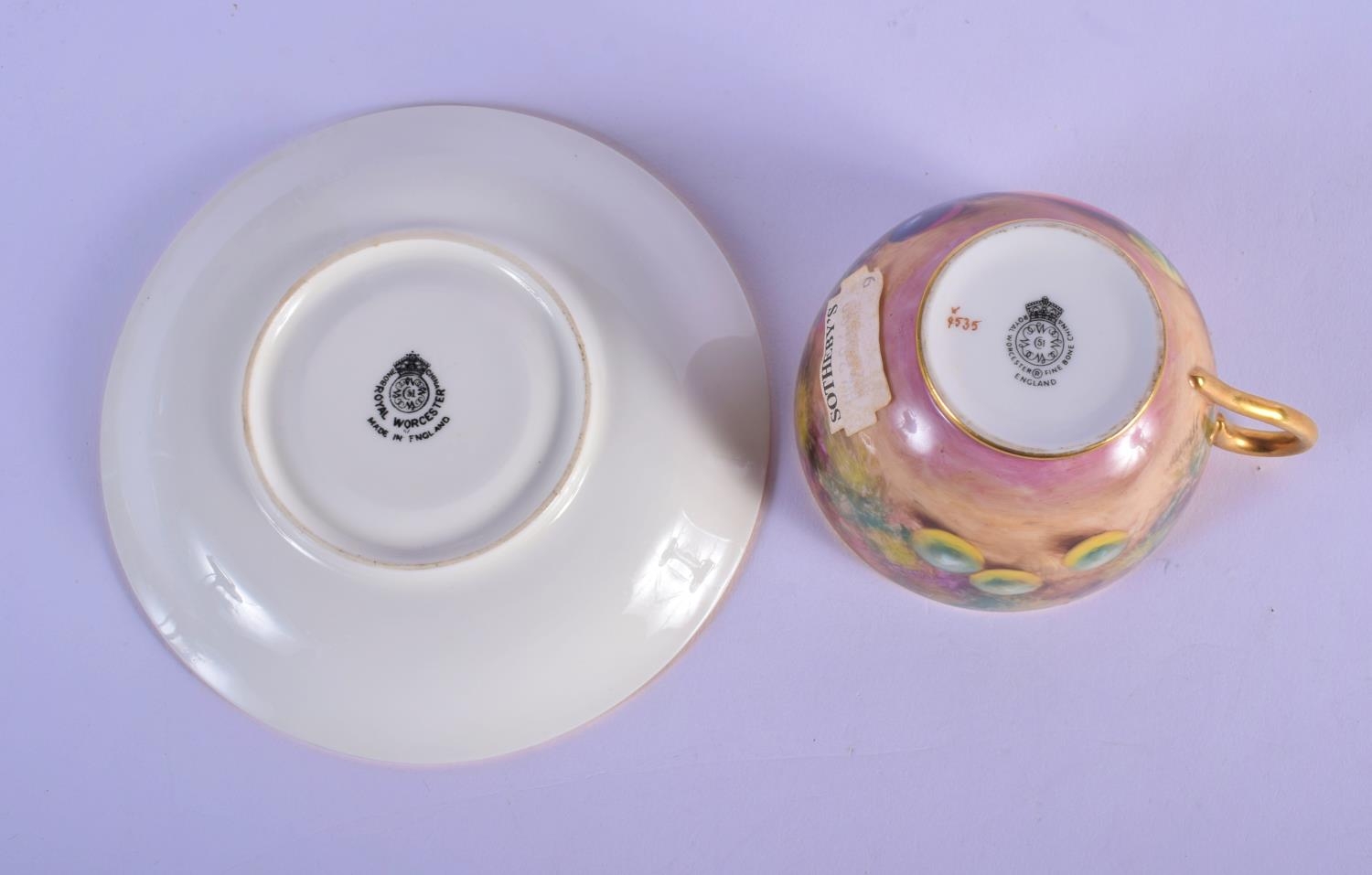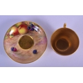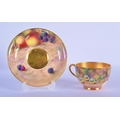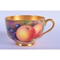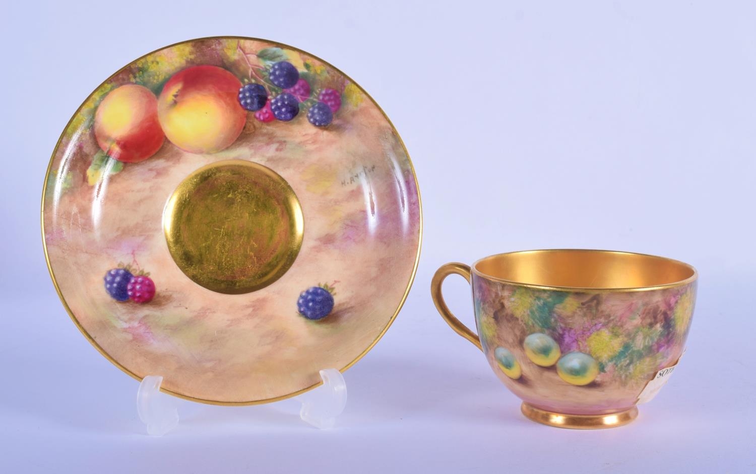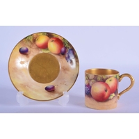 Royal Worcester teacup and saucer painted with fruit Ayrton and Smith, black mark to both. Cup 6cm High, Saucer 14.5cm Diameter (2)