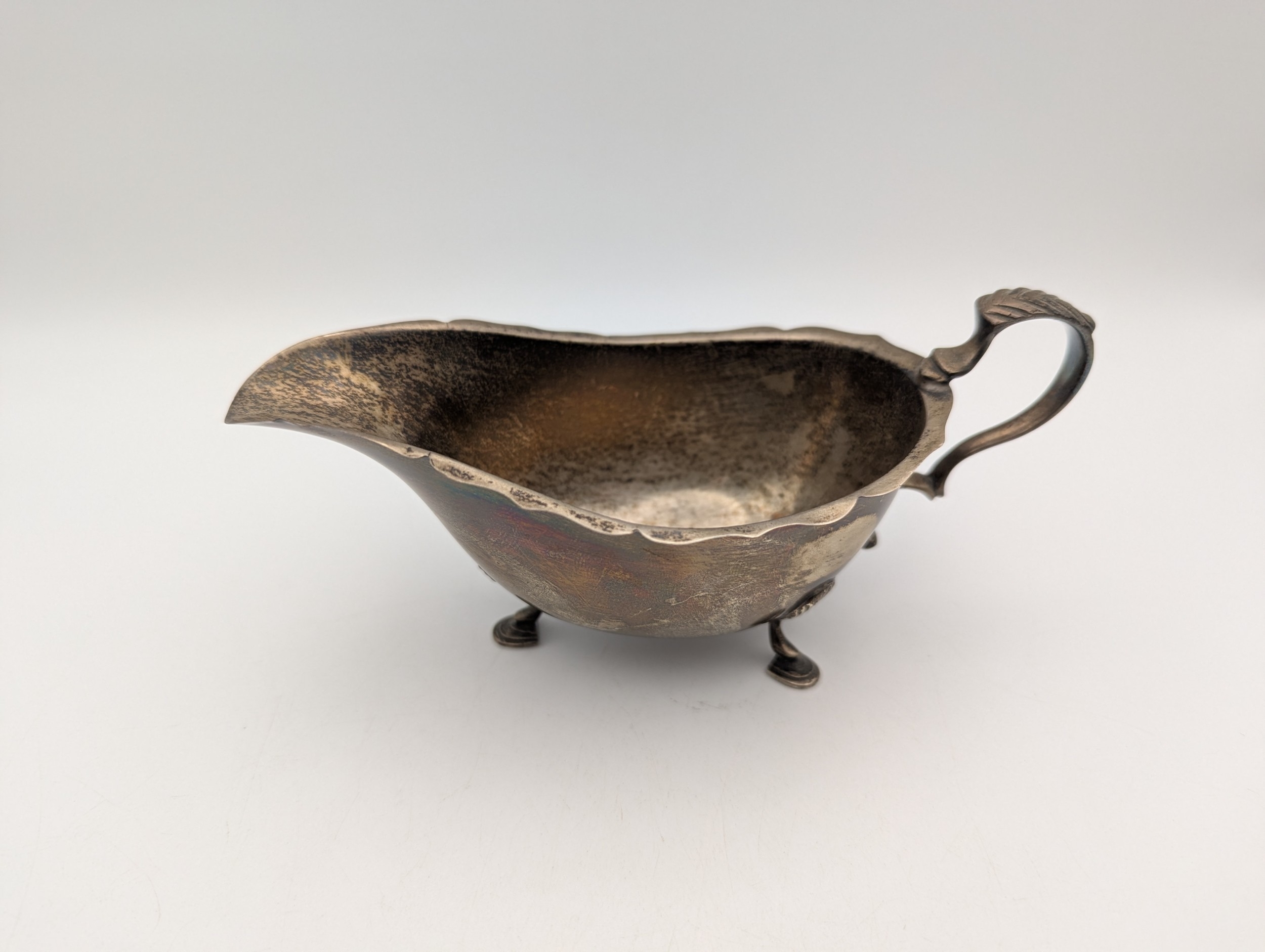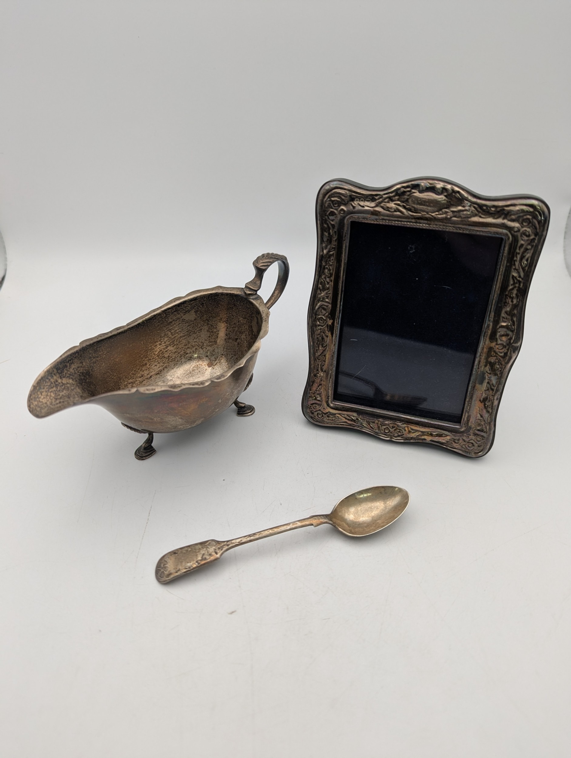 Silver to include a sauce boat hallmarked Birmingham 1962, 71g, a silver fronted photo frame and a teaspoon, 12.2g