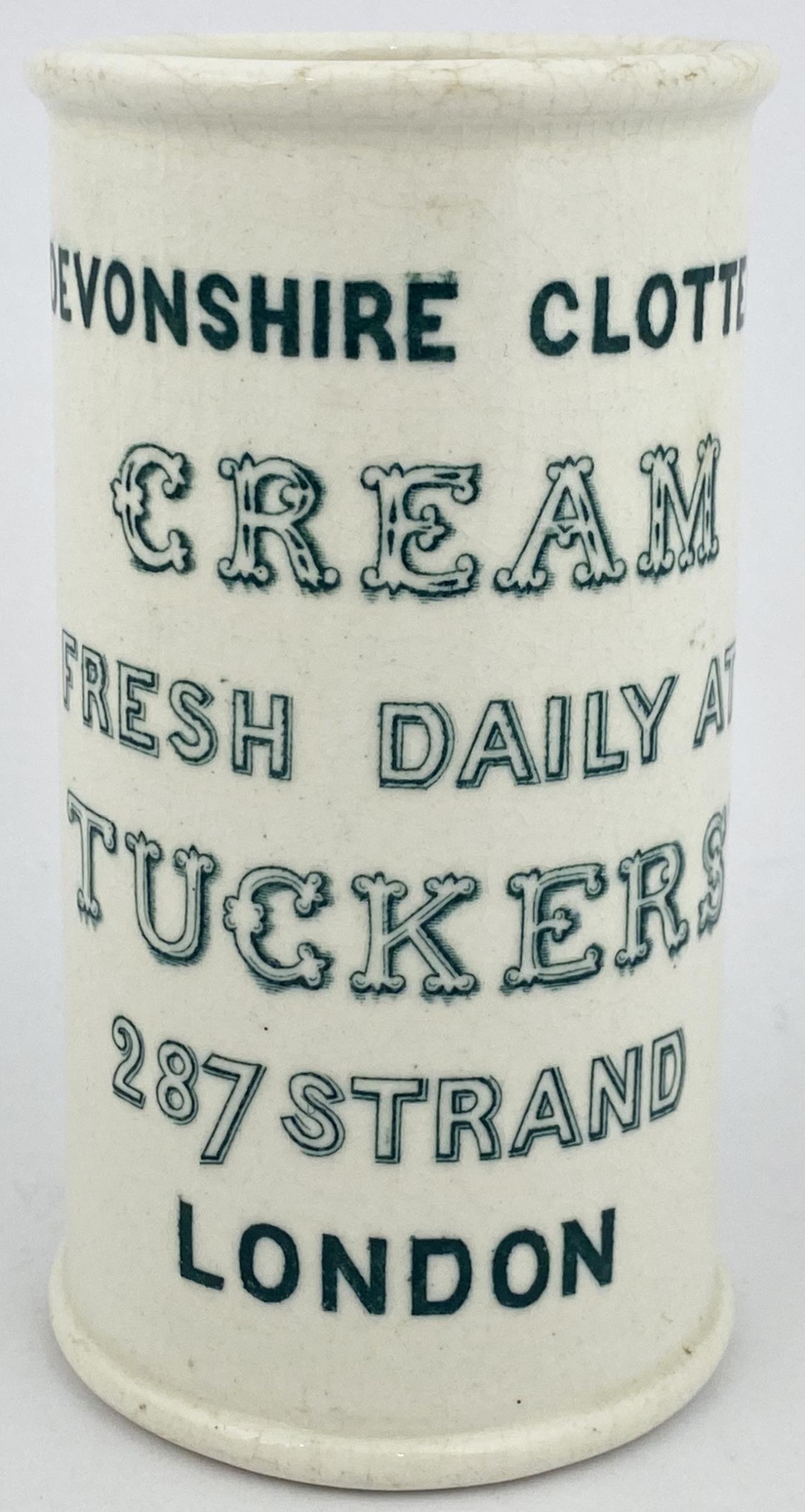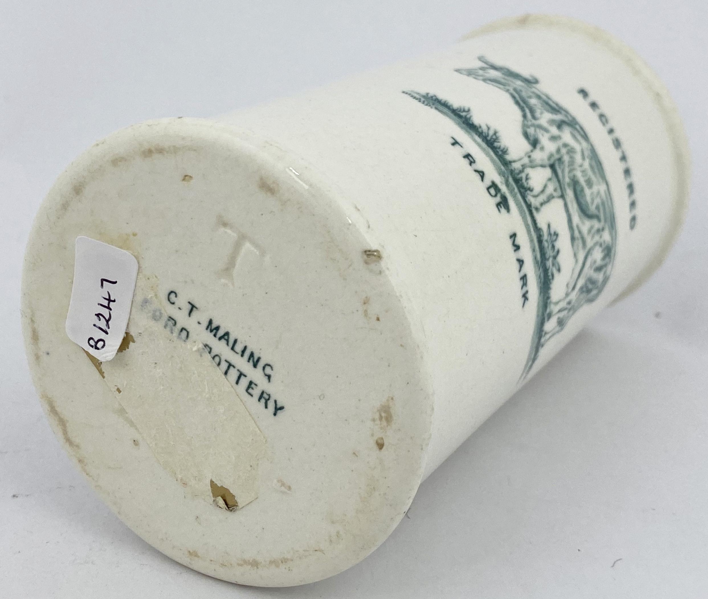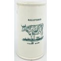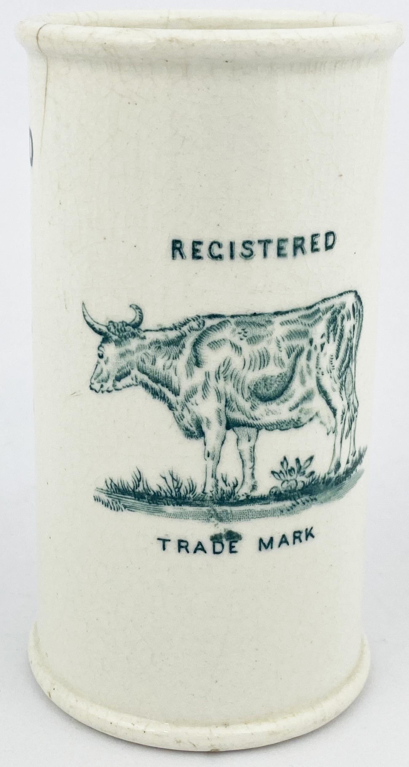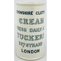 DEVONSHIRE CLOTTED CREAM POT. 4.8ins tall. Large size, printed both sides in strong green - six lines to front, cow pict. REGD/ TRADE MARK to other. C T MALLING FORD POTTERY base transfer. RB 7. Short side hairline.