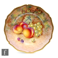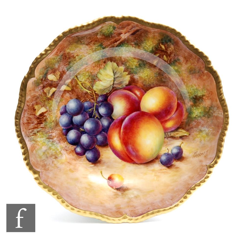 A Royal Worcester Fallen Fruits cabinet or wall plate decorated by Freeman with hand painted peaches and red grapes, signed, black printed mark, diameter 23.5cm.