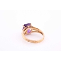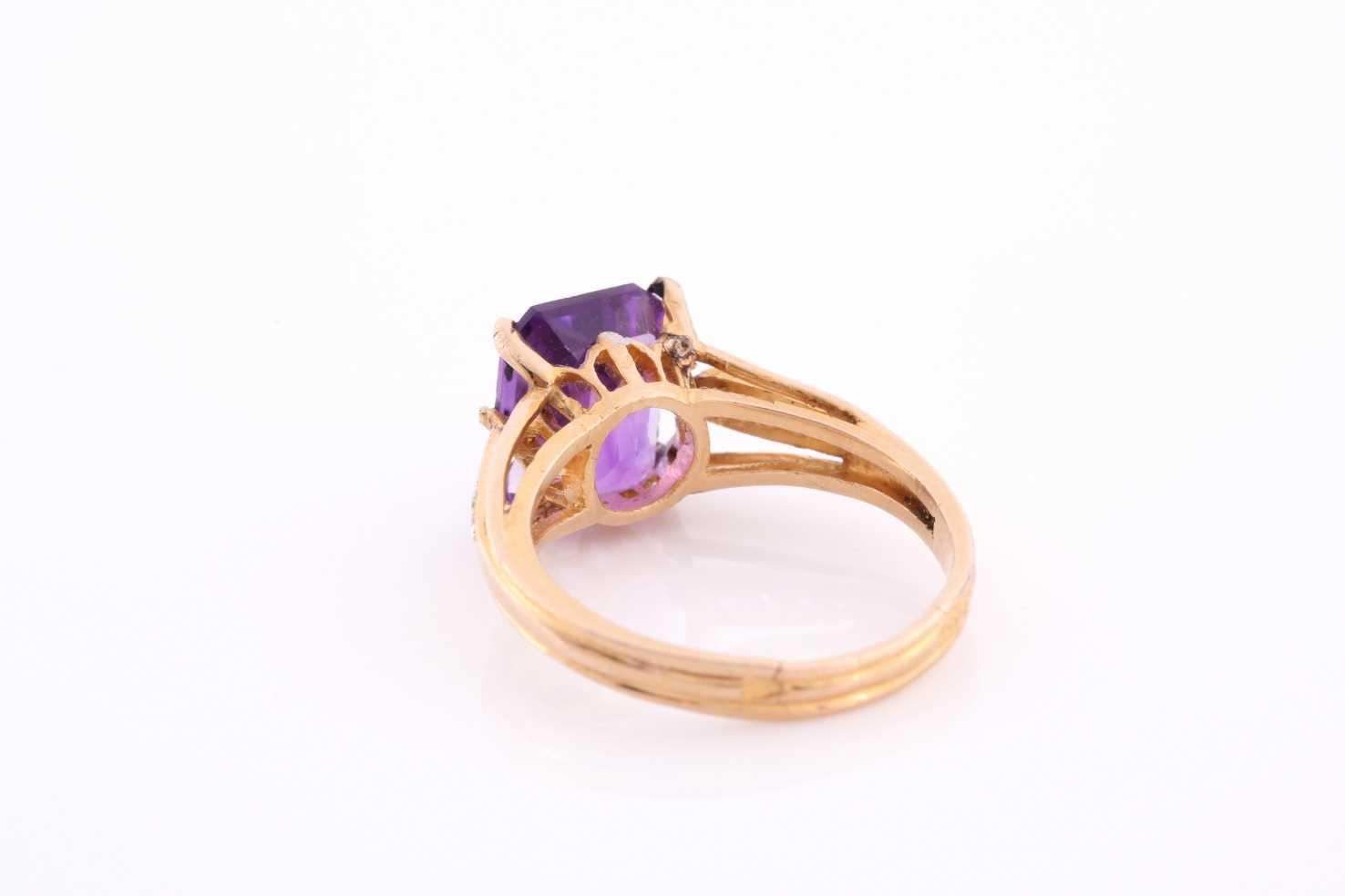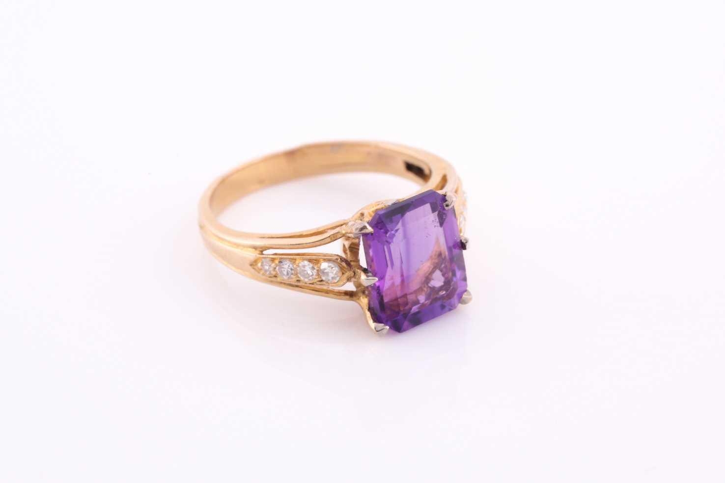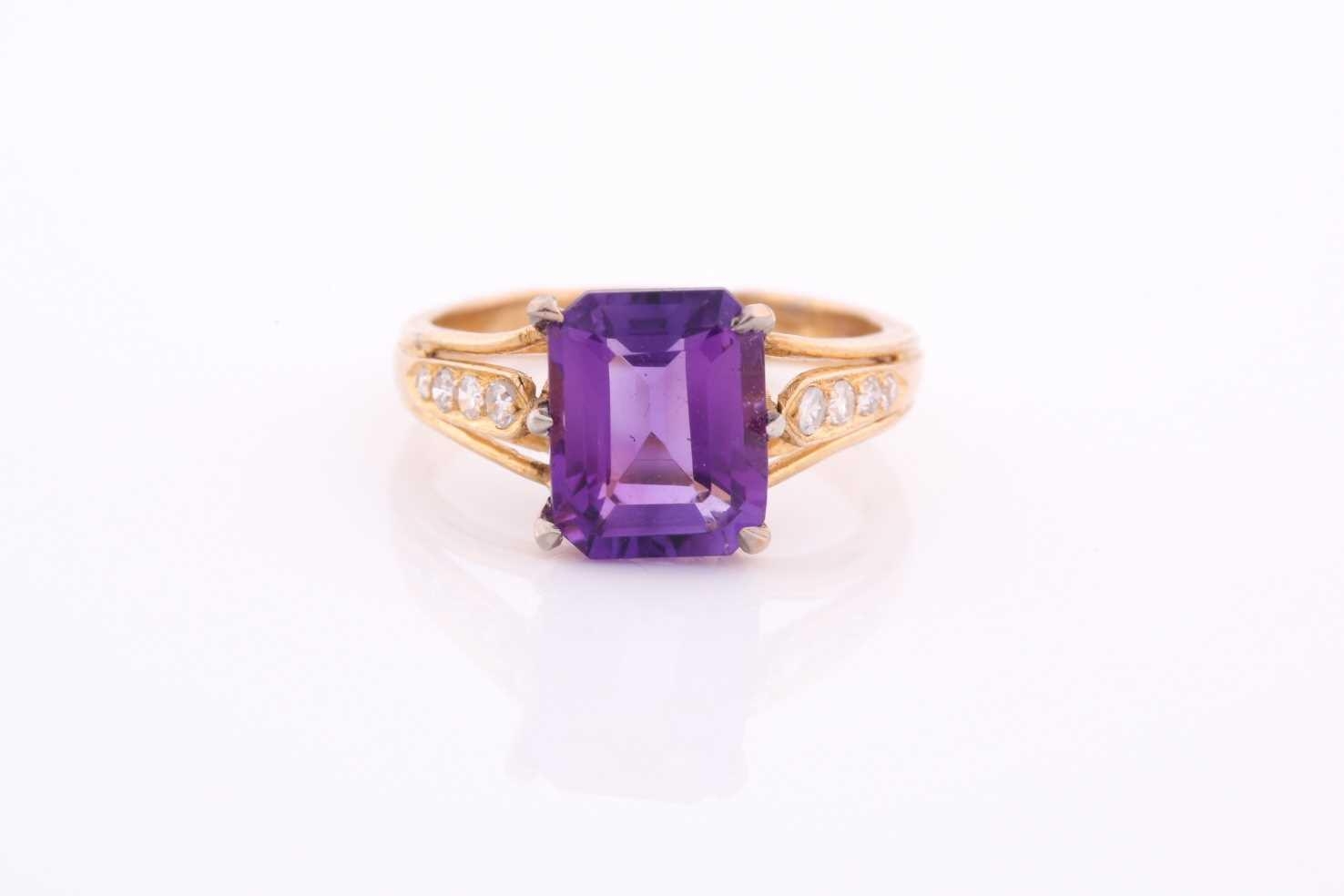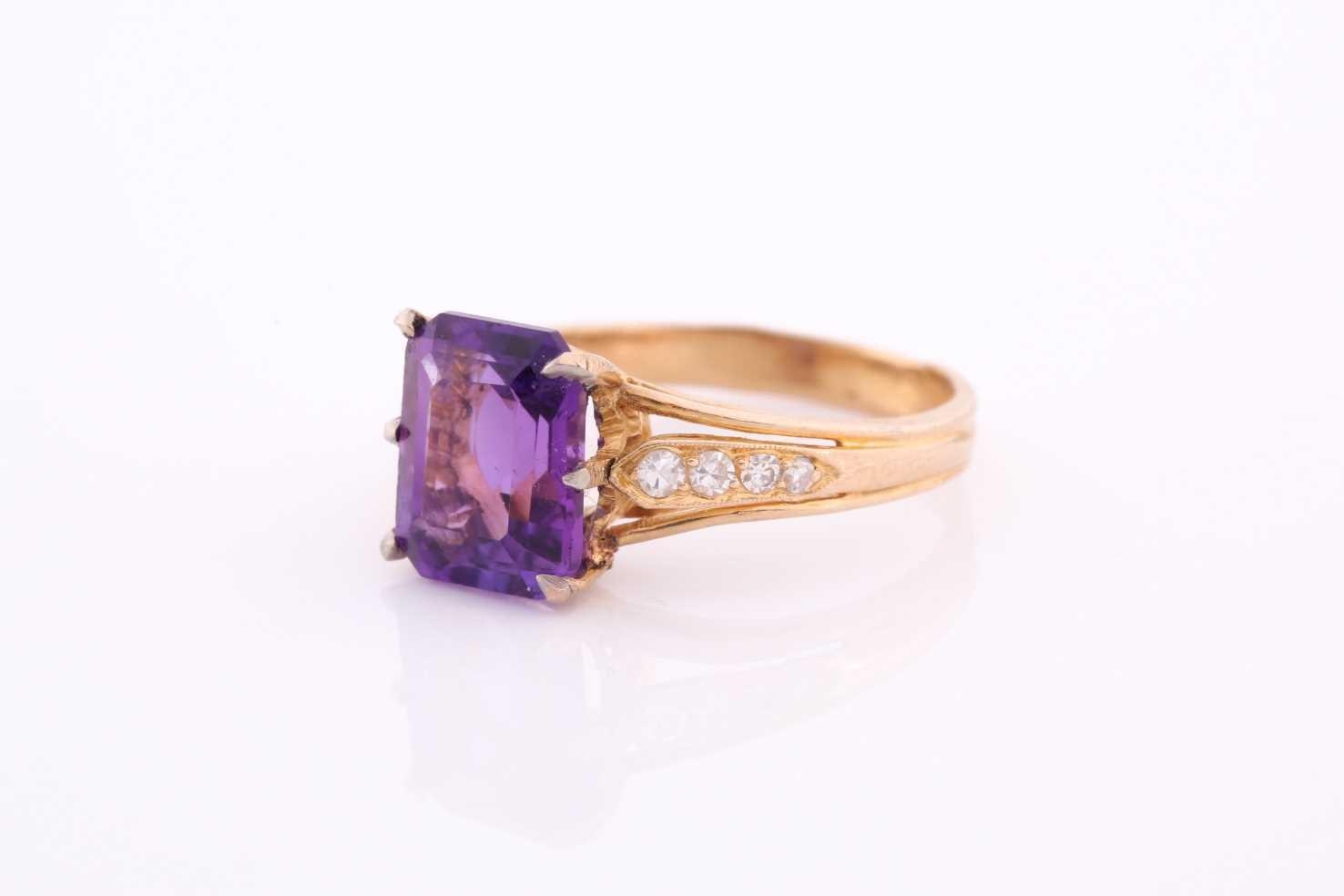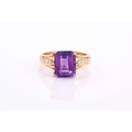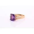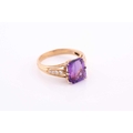A yellow metal, diamond, and amethyst ring, set with an emerald-cut amethyst, measuring approximately 10 x 8.2 mm, the shoulders inset each side with four round-cut diamonds, size N 1/2, 5 grams.