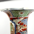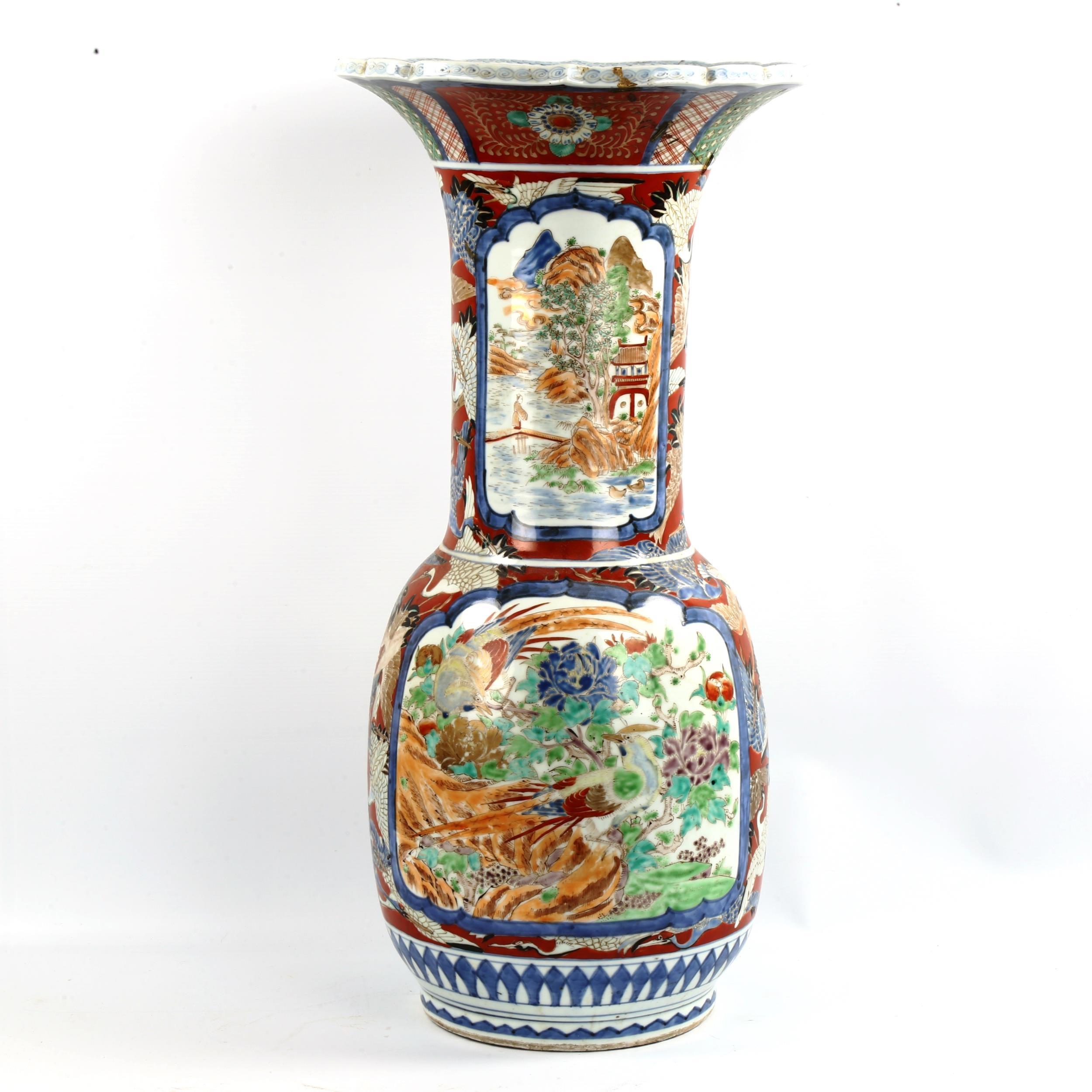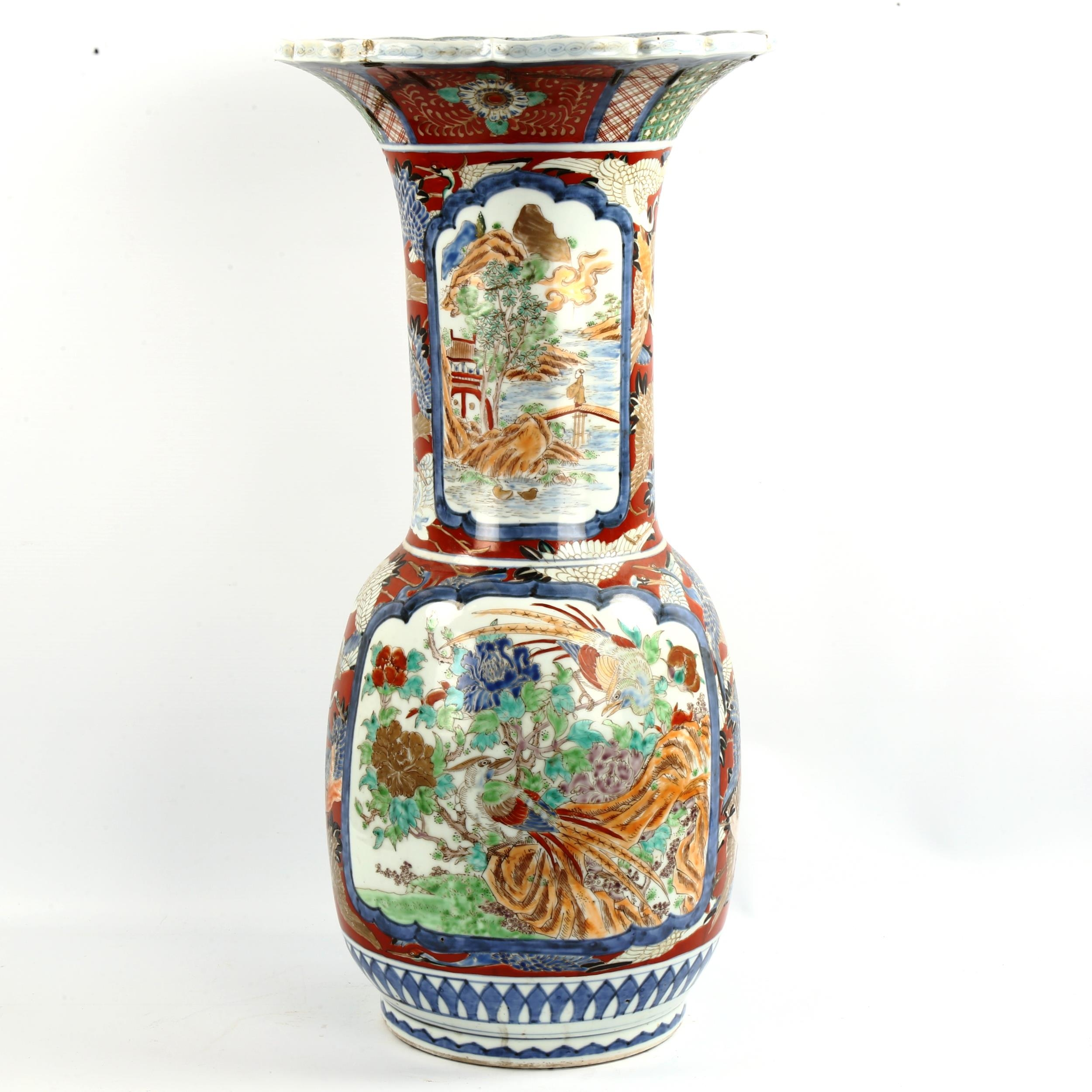A large Japanese 19th century porcelain vase, flared scalloped rim with hand painted and gilded panels, height 66cm, rim diameter 32cm, A/F