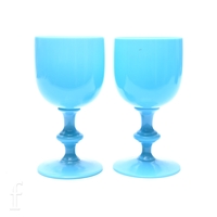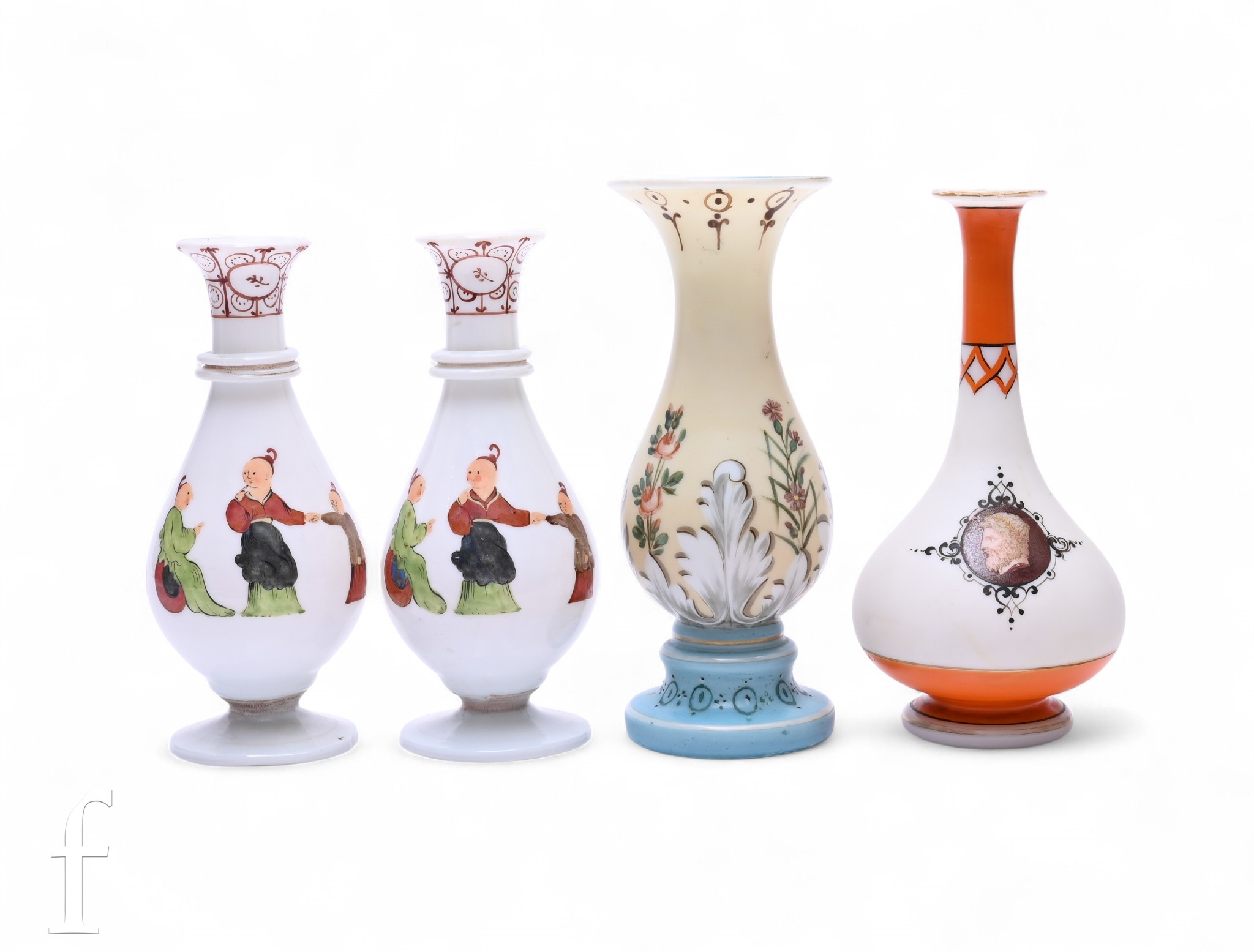 A pair of late 19th Century opal vases of footed baluster form with a tapered collar neck, each hand enamelled in the Chinoiserie taste with scholar figures against the white ground, height 18cm, together with a Stourbridge glass example in the Etruscan taste and a French example with hand enamelled stiff leaf border, height 19.5cm. (4)