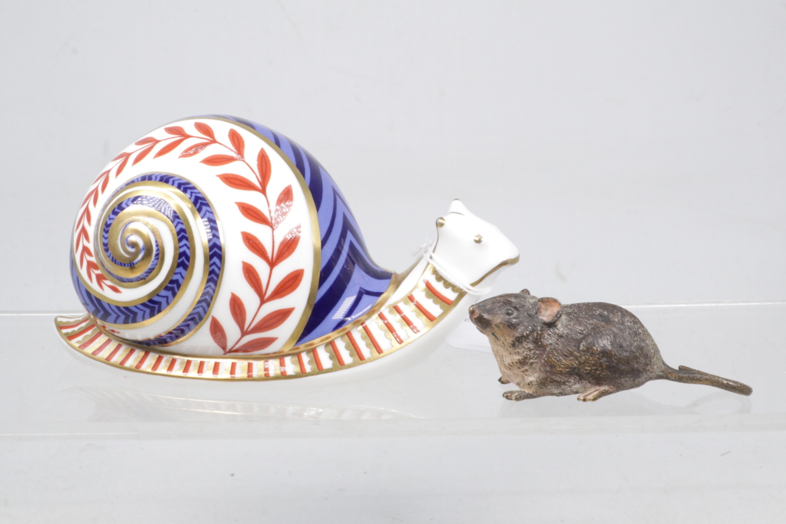 Royal Crown Derby snail with gold stopper together with a Depose Geschult bronze mouse