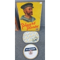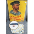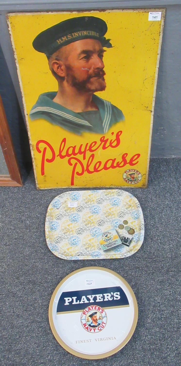 Vintage metal advertising sign 'Players Please' together with a 'Players Navy Cut' circular enamelled metal pub tray and another oval similar. (3)